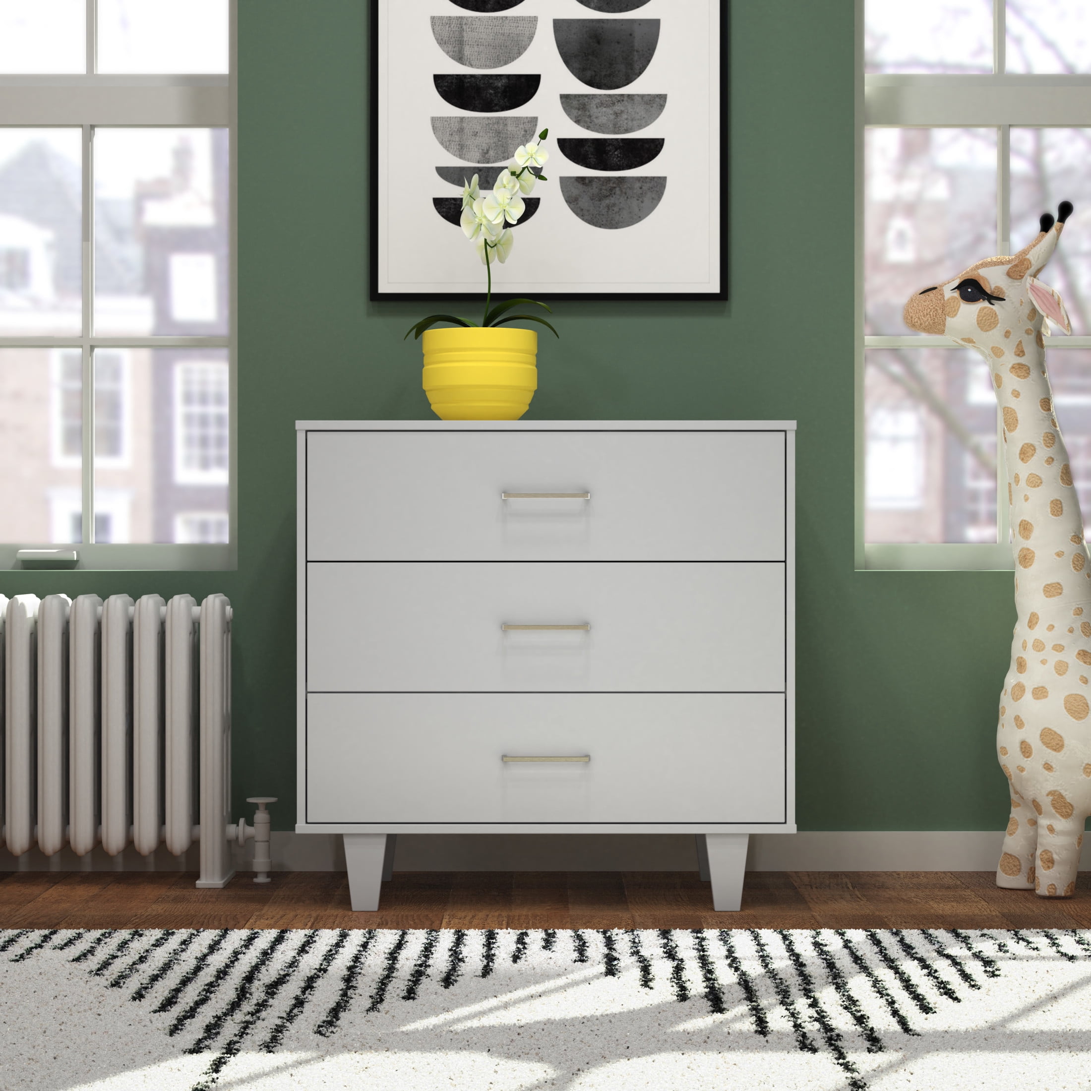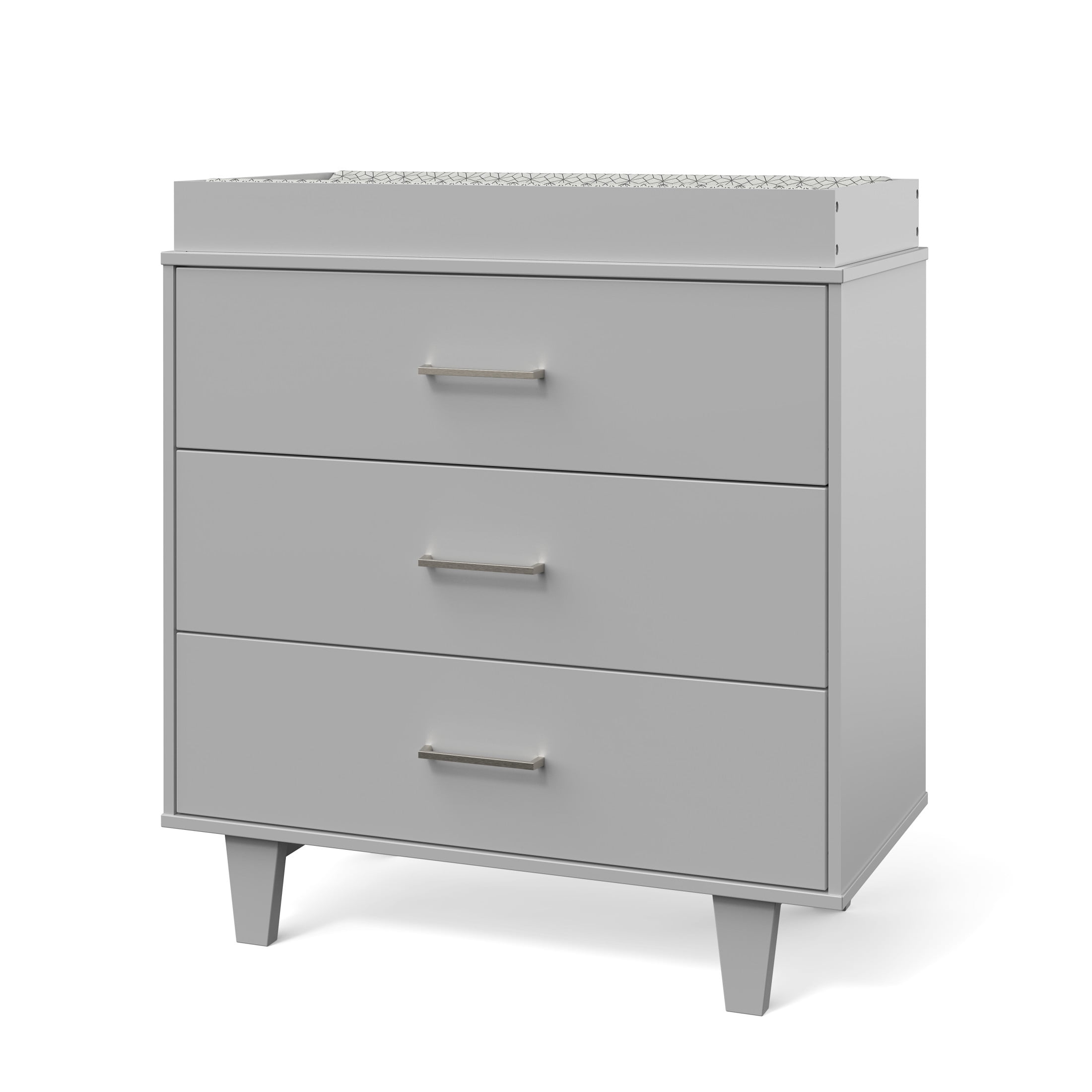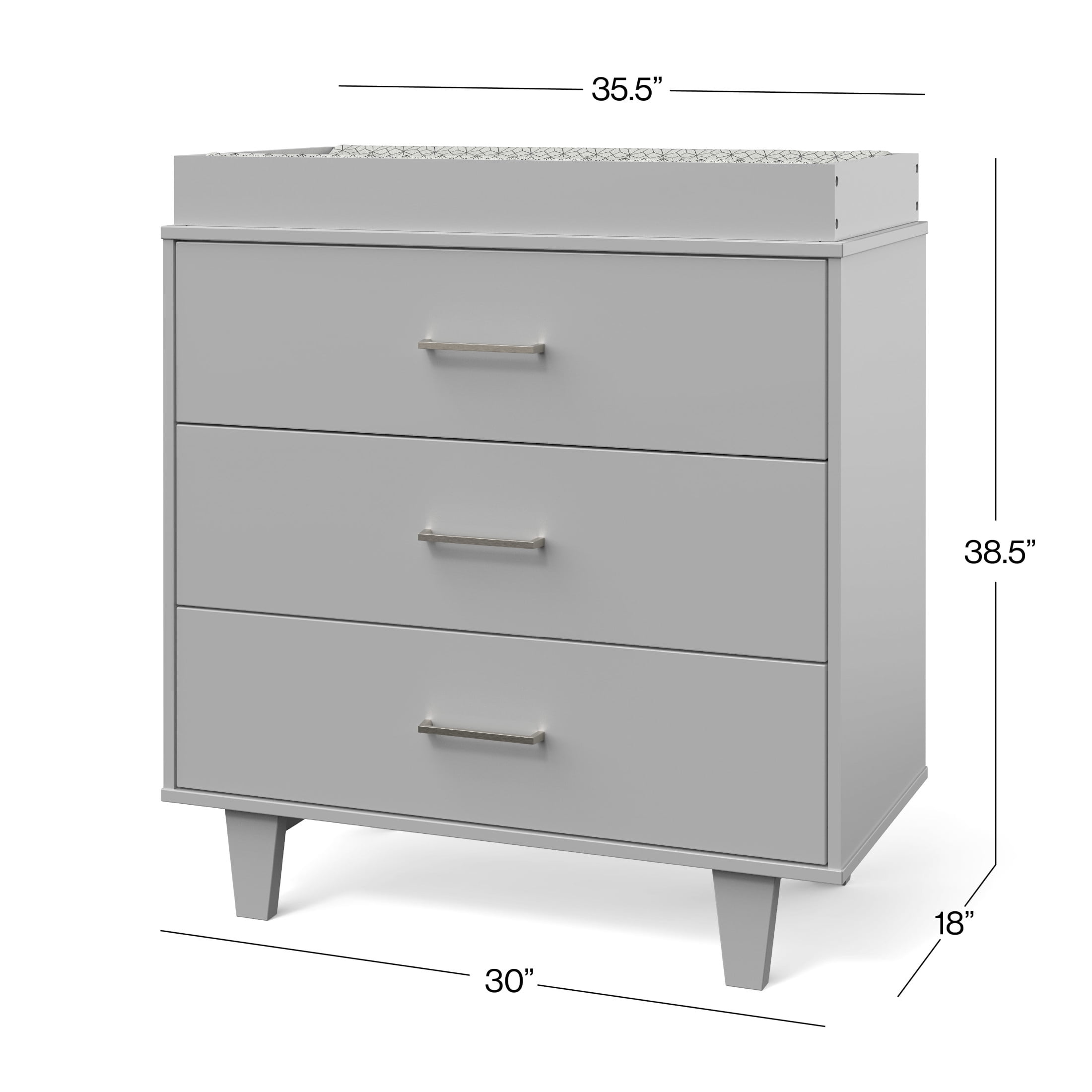 Plenty Of Storage: Three spacious drawers for baby nursery or child’s room with a fresh mid-century modern style featuring sleek nickel drawer knobs and smooth, ball-bearing glides. Includes anti-tip kit for added safety Removable Changing Table: Includes a removable changing table that easily attaches to the top of the dresser, built to hold a standard changing table mattress pad. The enclosed surrounding keeps baby safe while changing diapers and clothes. Remove the changing table when no longer needed to continue using the dresser as simple storage Built To Last: Strong, sturdy wood construction with a baby-safe non-toxic finish. Suitable for any room; nursery, kid’s bedroom, tween or teen bedroom Safety First: Designed and engineered to meet the highest safety standards to keep your child safe Easy Assembly: This dresser unit is easy to assemble. Measures 35.59” L x 18.11” W x 38.49” H, with interior drawer dimensions of 32.20” L x 14.29W x 6.46” H