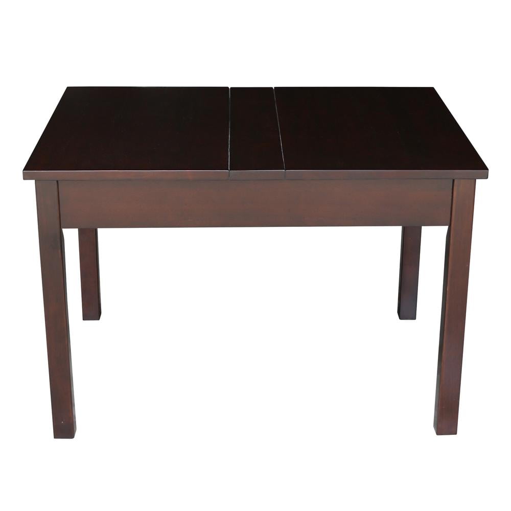 Give your little one a fun place to draw pictures, play with toys and more with this simple children’s table, designed with a sturdy solid wood butcher block top. A safety-hinge top lifts to reveal convenient storage space for crayons, art projects and other necessities. Solid wood butcher block top Lift-top for convenient storage Safety-hinge design Set includes: One (1) table Materials: Solid parawood, metal Finish: Unfinished Storage dimensions: 20.9 inches high x 29.9 inches wide x 3.2 inches deep Dimensions: 22.24 inches high x 33.7 inches wide x 24.02 inches deep Assembly required