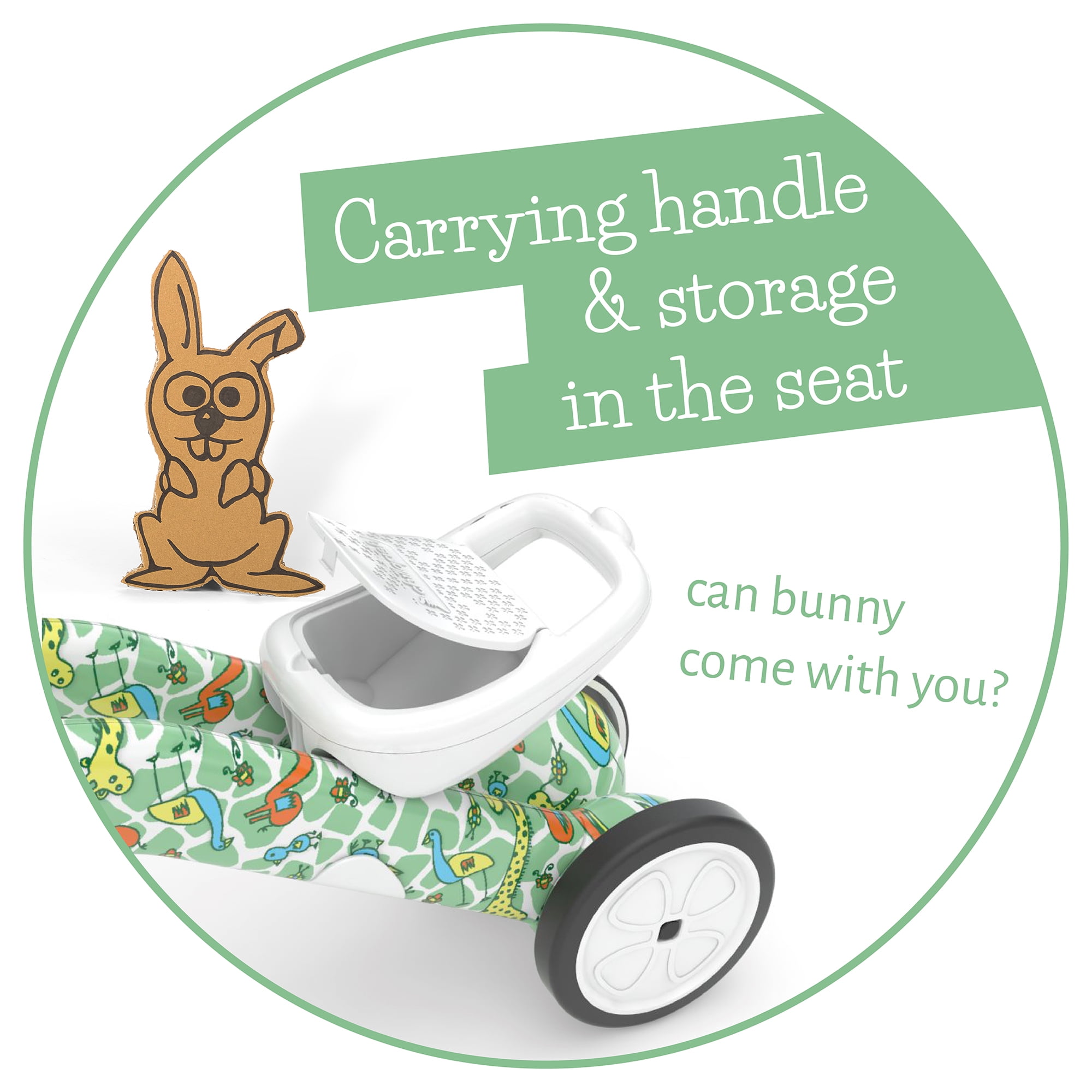 2-in-1 gradual balance bike and tricycle for kids from 1-3 years. Easily switch between 3-wheel tricycle mode and 2-wheel balance mode without tools, whenever you child is ready – the best way to teach your child balance at his/her own pace. The seat grows with your child (8,7 inch / 22 cm in 3-wheel mode to 10,2 inch / 26 cm in 2-wheel mode) to better support the new skills of your child. Silent and non-marking and anti-skid TPE synthetic rubber tires for both indoor and outdoor pleasure. Lightweight and easy to carry: thanks to a carry handle built into the back of the seat you can bring the Bunzi on all your child’s trips and adventures. Hidden storage box in the seat to bring along a toy or a snack for the ride. Made from high-quality ABS material to play longer. Comes fully assembled in the packaging, ready to ride.