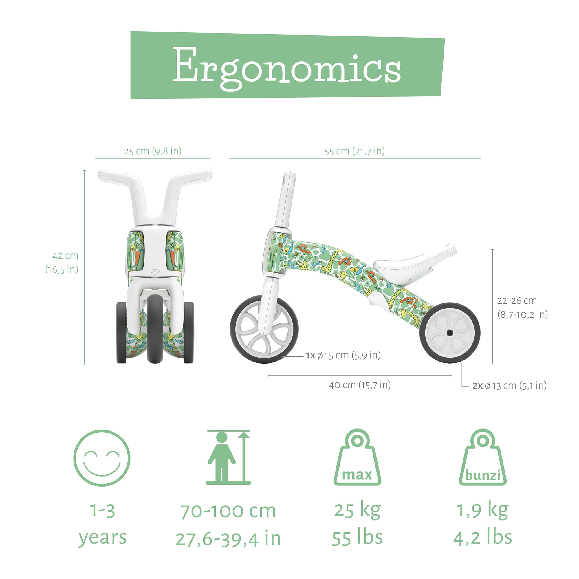 Chillafish Bunzi 2-in-1 gradual balance bike and tricycle is uniquely designed to help teach your child balance at his own pace in a fun way. Your child learns to balance step by step on 3 wheels and when it’s ready, on 2 wheels. Made of high-quality ABS material, the frame can switch between a 3-wheel mode to a 2-wheel mode in just a few seconds; no tools required. The back wheels in 3-wheel mode still offer more stability, but are purposely close to each other, hence less stable than a traditional tricycle or 4-wheel ride-on, so your child feels in control of his own balance. The seat grows with your child (8.7 inch / 22 cm in 3-wheel mode to 9.8 inch / 25 cm in 2-wheel mode). Only in this way the new skills of your son or daughter can be better supported, just until he or she has mastered balance and is ready for a bigger balance bike like BMXie2 or Charlie. The silent anti-skid synthetic rubber tires are non-marking; so no worries when your toddler wants to ride inside the house. But the material of the tires is also strong enough to be used outside and to survive the wildest outdoor treks. Bunzi is made of a very lightweight high-quality ABS material (4,16 pound / 1,8 kg), which makes it easy to carry around thanks to the handgrip built into the back of the seat. You can easily bring the Bunzi on all your child’s trips and adventures. Your child can bring along a toy or snack for the ride in the hidden storage box. Your son or daughter will love it and it’s at the same time also very useful to train the fine motor skills of your lovely toddler. With cute bunny-style handlebars, an intuitive form that grows with your child and vibrant colors to display the personality of your child, Bunzi is sure to become the preferred bike buddy for your kids; recommended for ages 1-3, maximum weight 55 lbs (25kg). Bunzi is being sold worldwide for 7 years already and most parents have this little Bunzi in the family for many years, giving it to little sis or bro after the first use. You can’t lose the tool, as there are no tools needed, Bunzi arrives assembled in the packaging and the seat adjust without any tool. Chillafish is a leading manufacturer of activity toys and specialist in balance bikes and other wheeled toys – inspiring children and their parents around the world to play actively, develop healthy motor skills have fun with their innovative and super-duper cool toys. Chillafish products are design-inspired, manufactured with the highest sustainable quality standards in mind, offering fantastic play value. Entering the households of more than 1 million people makes us experts in creating fun, innovative and sustainable toys ! PLAY LONGER !