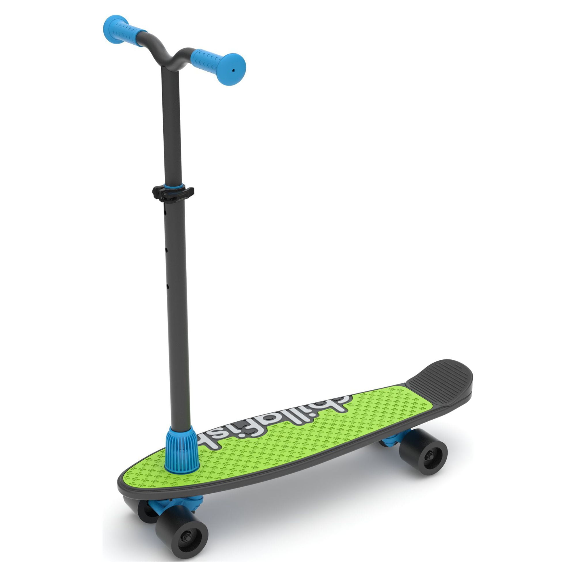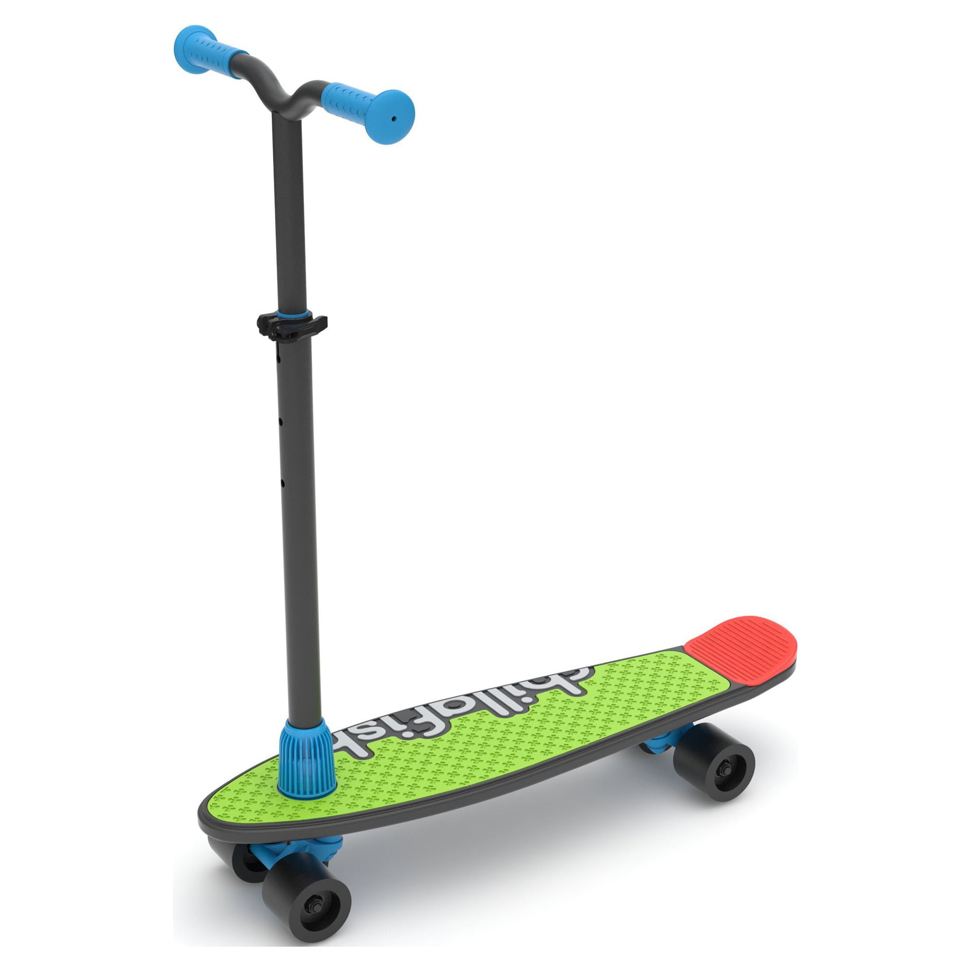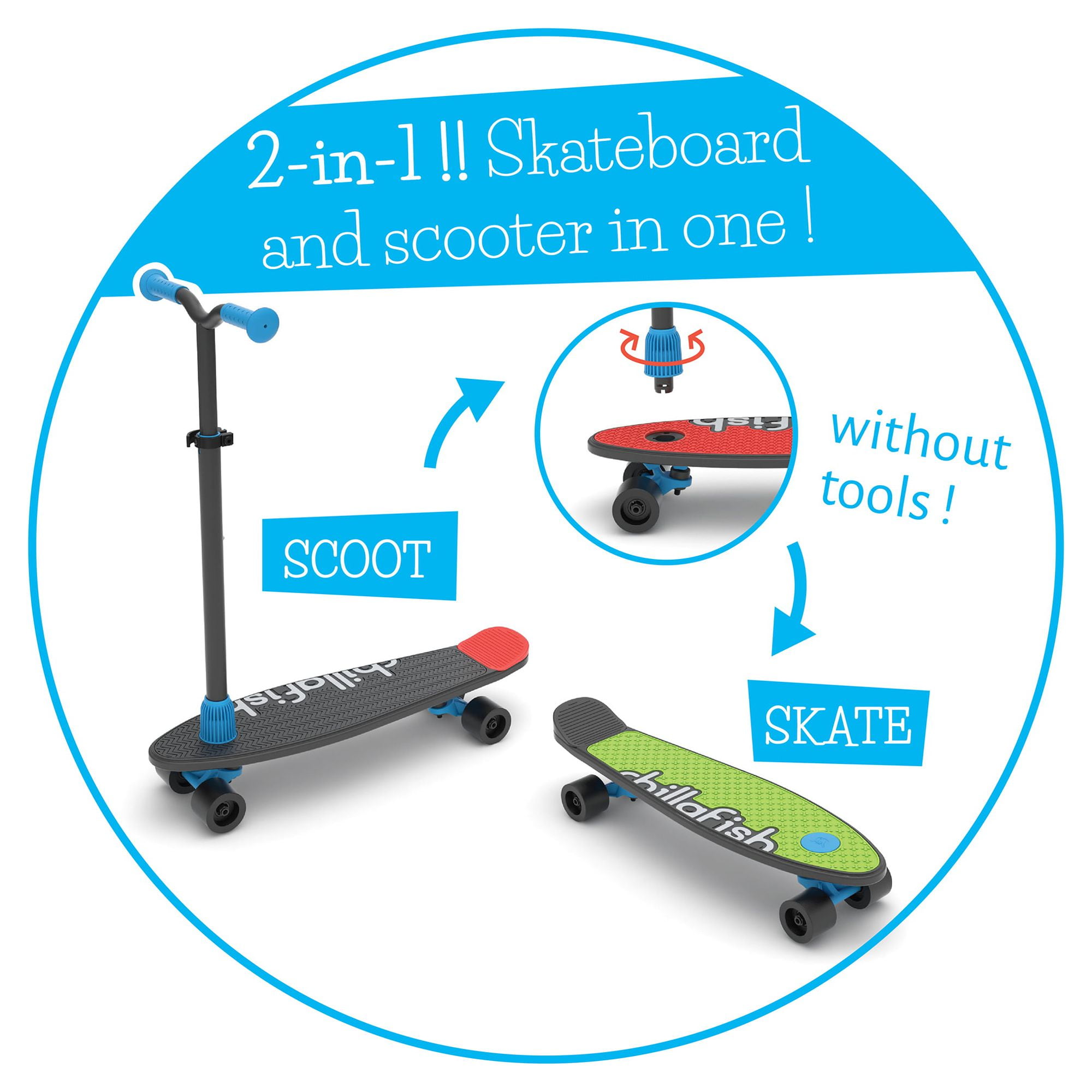 Chillafish SkatieSkootie is a 4-wheeled customizable skateboard and lean-to-steer scooter in one. The 4-wheel elongated wheelbase and the detachable stability handlebar are developed for easy control and stability and this makes it perfect for younger children to safely learn to balance and skate. For kids with no experience in skating, they can hold on to a handlebar to master the balance at first and later take off the handlebar to have a first skateboard. So when they are ready: just turn, unlock and pull, no tools needed to take off the handlebar. The wheelbase of the SkatieSkootie is longer than usual – in comparison to the deck. This makes the board less prone to topple forward or backward and thus more stable. Easier to learn. The handlebar can be adjusted with a quick release to different heights to suit the child’s height, (24,4-31,1 inch / 62-79 cm). Customize your SkatieSkootie: it comes with the 3 included colored decks and 3 included colored tails. Looks like a new toy each time you change the color! The 3 included tails also have a different angle, making it fun to try a new style of riding – simple and safe or etchy and quick. Create the perfect combination that fits you best. Built with steel-reinforced PP plastic, ABEC-7 bearings and polyurethane wheels, and TPE comfy handgrips, SkatieSkootie will ensure you glide through the park with easy. Scoot to become a skater!