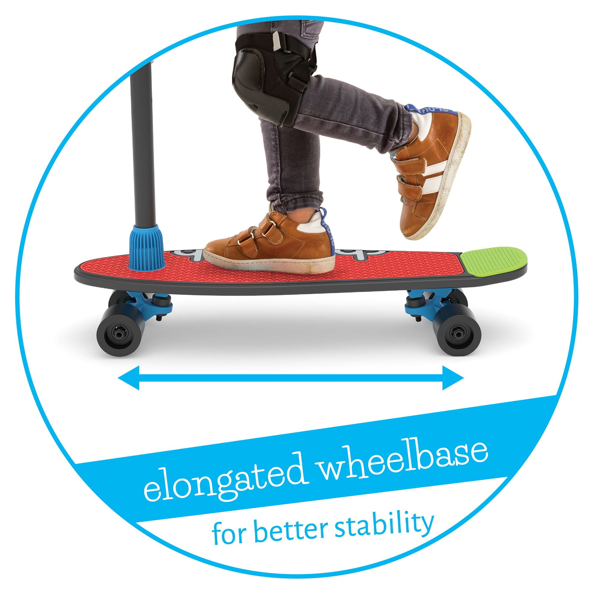 2-in-1 customizable skateboard and lean-to-steer scooter in one, for kids from 3 years and up, the best way to learn to skate. Elongated wheelbase for better control and stability when still learning how to skate. Easily removable handlebar: removable without tools; just turn, unlock and pull, you easily switch between scooter and skate board when you want. Customize the riding style: the 3 included colored tails each have a different angle, making it fun to try a new style of riding – simple and safe or etchy and quick. Customize the looks: the 3 included deck plates with different colors allow you to change the look of your board, whenever you feel. Easily adjustable handlebar to different heights from 24,4-31,1 inch / 62-79 cm, adjust with a quick release – no tools needed. Polyurethane wheels and ABEC-7 bearings to ensure you glide through the park and smoothly roll over anything.
