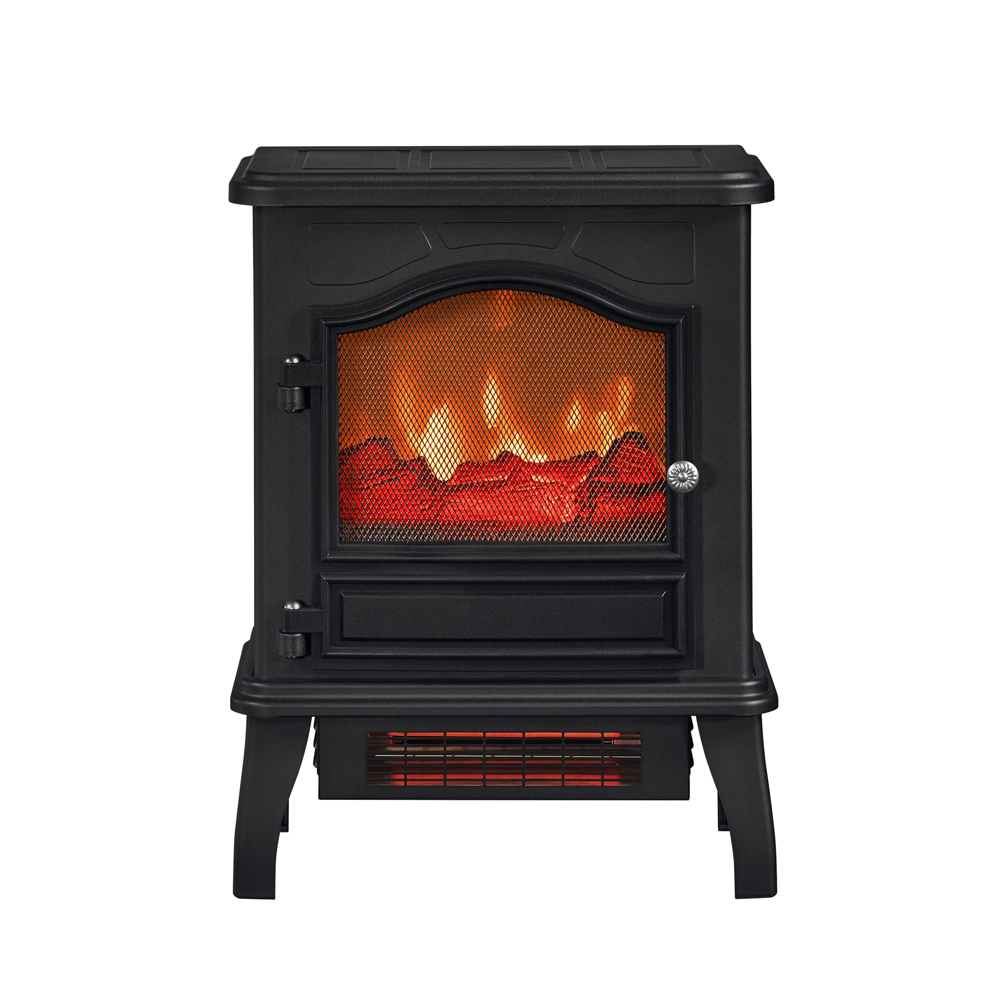 5,200 BTU ChimneyFree® heater provides supplemental zone heating for up to 1,000 square feet to help you save money Infrared quartz heat helps to maintain natural humidity in the air, for comfortable warmth that doesn’t dry out your home Durable metal body construction with screened picture window and arched frame detailing Operational door conceals control panel for your fireplace Adjustable thermostat allows you to decide the temperature of your room Realistic flame effect with glowing logs and ember bed can be operated with or without heat Safe for use around children and pets Portable unit is easy-to-assemble: simply attach the legs, plug it in and it is ready to heat Eco-friendly, energy efficient stove does not emit any emissions or other hazardous byproducts Product Weight: 14.92 lbs