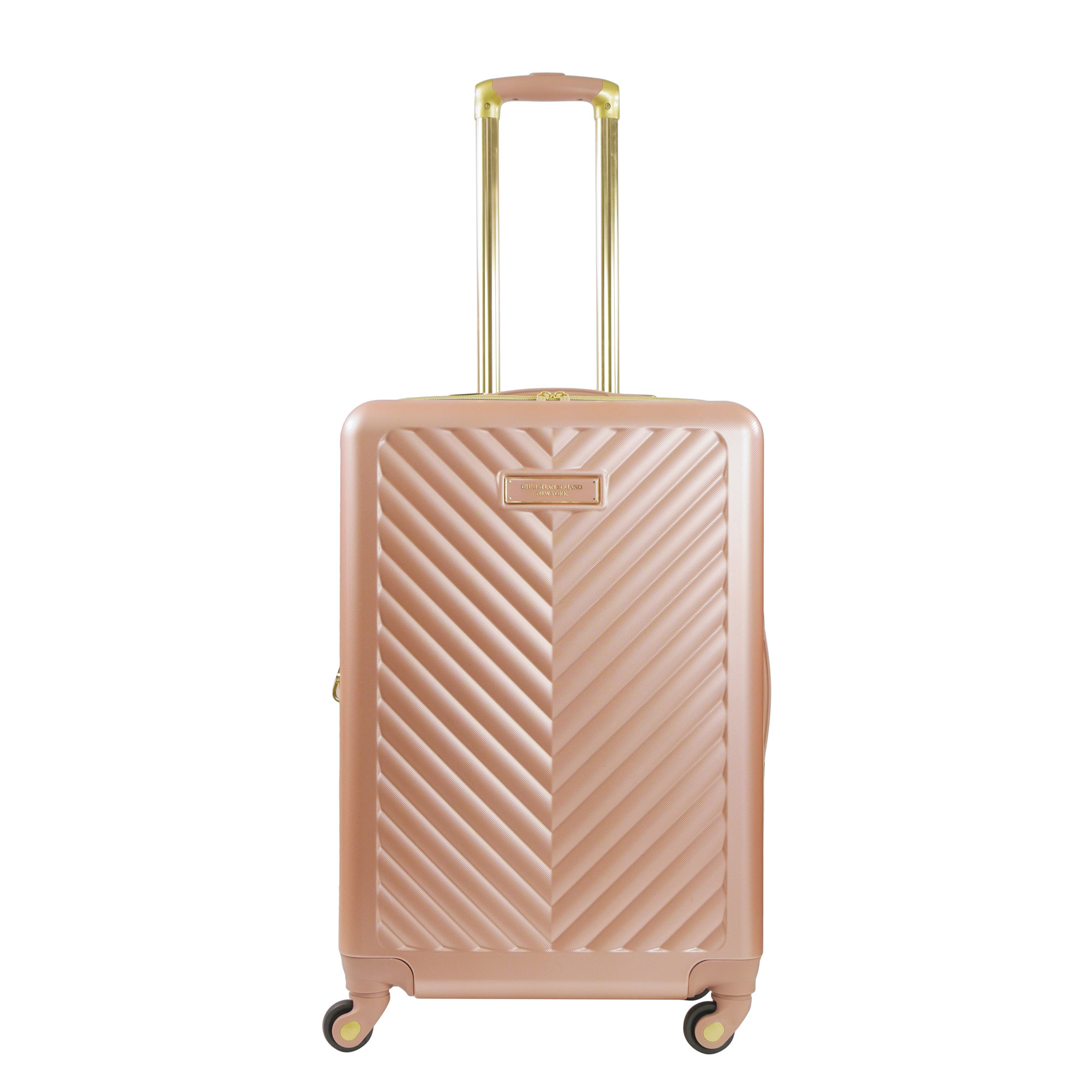 Officially licensed Christian Siriano New York hardside luggage with a sleek luxurious design with striking gold hardware; Hardshell luggage carrier is intended as checked baggage for airlines Hard luggage features a divided full-body main compartment and an interior zipper compartment for storing your belongings, clothing compression straps to keep clothing from wrinkling, and features expandable storage with 2-inch zipper gusset Wheeled luggage bags feature a lightweight upright design with eight 360-degree multi-directional spinner wheels and a retractable handle which allows for effortless movement Travel luggage bag features a hard shell ABS plastic case which protects your luggage and is easy to spot clean Hard shell suitcases measure 26.5 H x 16.5 W x 11 D in inches, and weigh 7.5 lbs