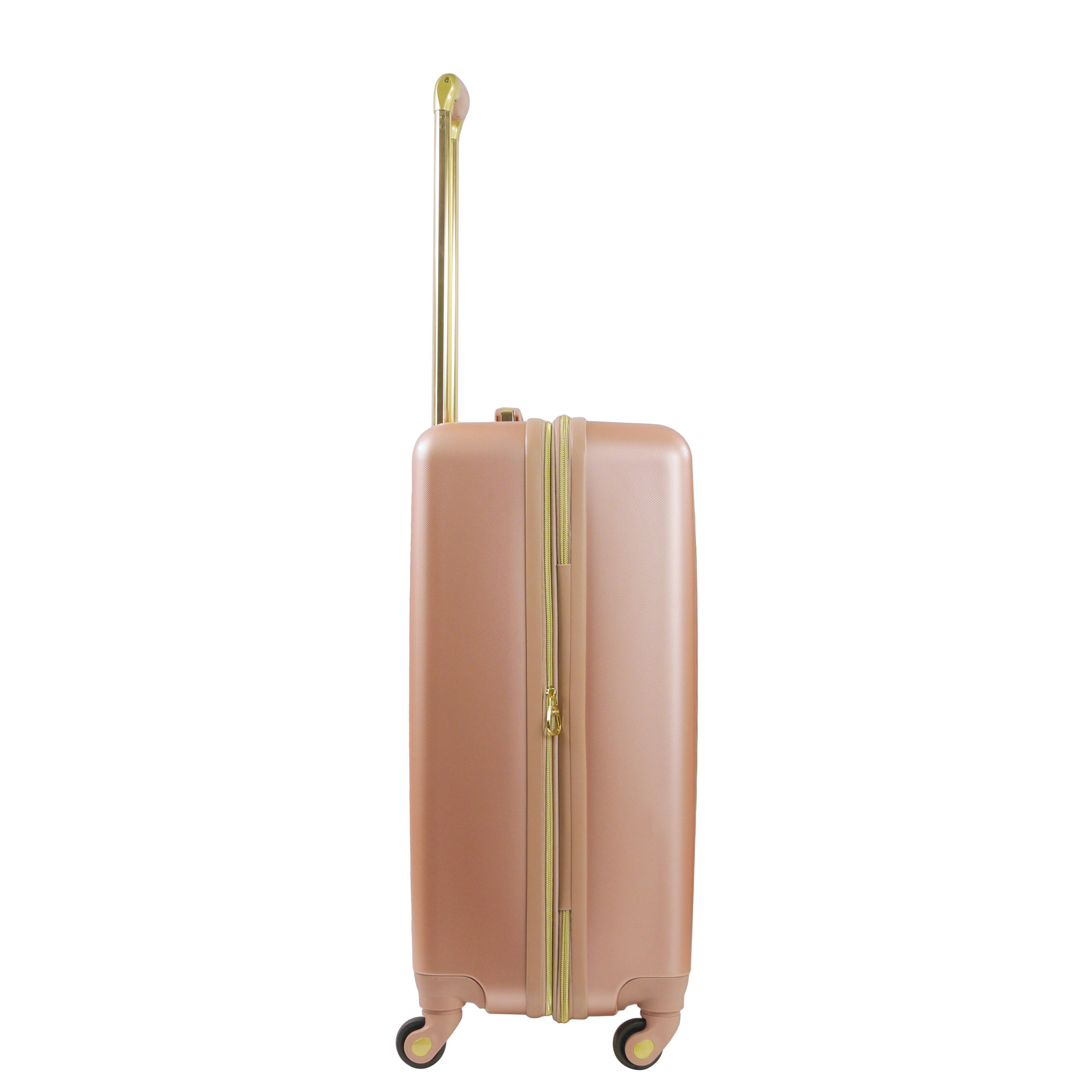 Keep your belongings conveniently and efficiently stored in one place while breezing through the airport or hotel lobby with this stylish rolling luggage on wheels. Constructed with a sleek luxurious design with gold hardware, this hard shell carry on luggage features 8 360 degree multi-directional spinner wheels which allow for smooth travel over all types of textured surfaces, and the lightweight hard sided luggage with spinner wheels features a retractable pull handle so you can reach your destination without hassle. The hard case luggage features a sizable polyester-lined main zip compartment for easy packing, a zip wet dry compartment for personal essentials, a mesh zip pocket for small accessories, clothing compression straps to keep clothing from wrinkling, and features expandable storage with 2-inch zipper gusset. The light weight carry on luggage roller features a hard shell ABS plastic case which protects your luggage and is easy to spot clean to keep the carry on luggage with wheels looking stylish during travel. The medium travelling bag with wheels measures 26.5 H x 16.5 W x 11 D in inches. Backed by a 5 year warranty.