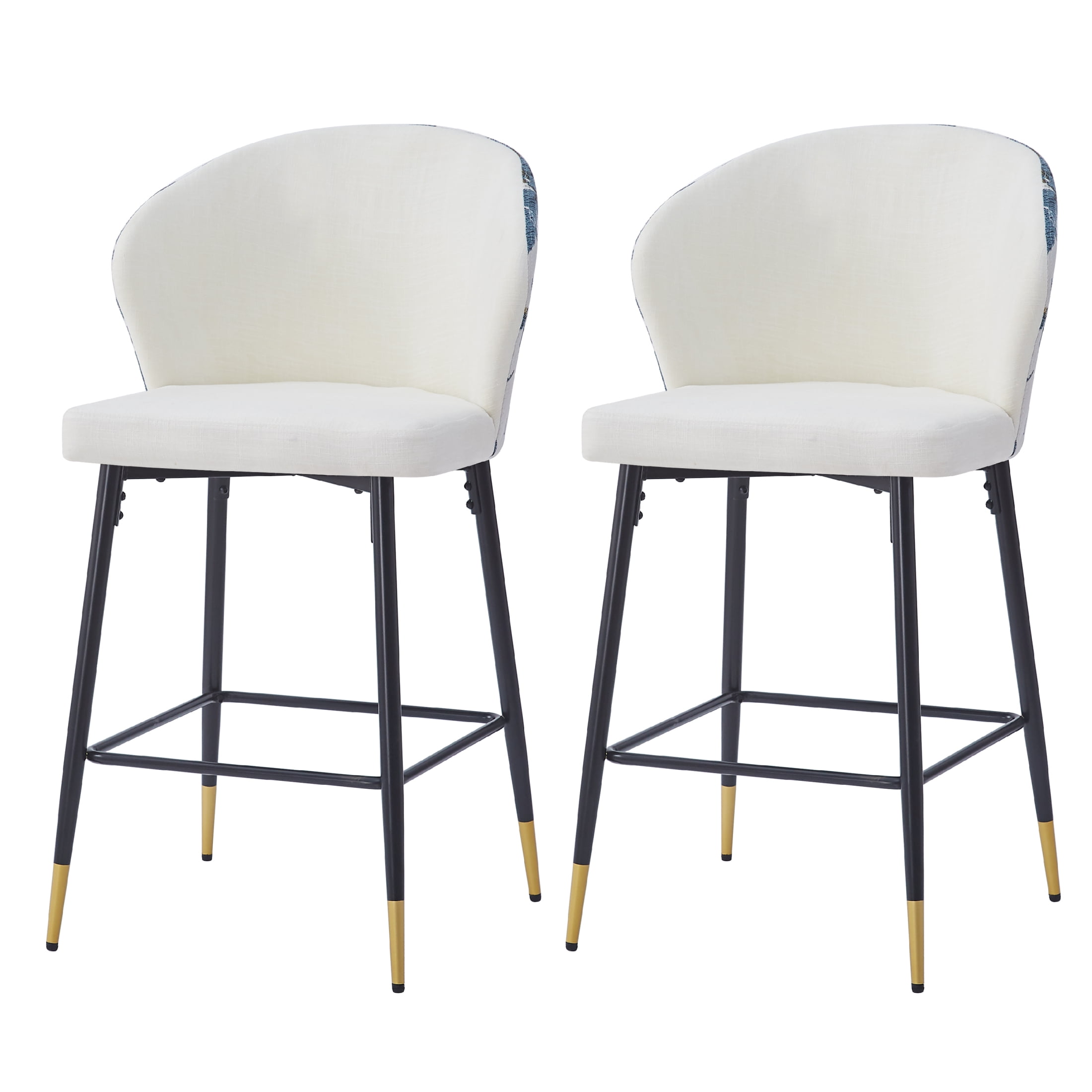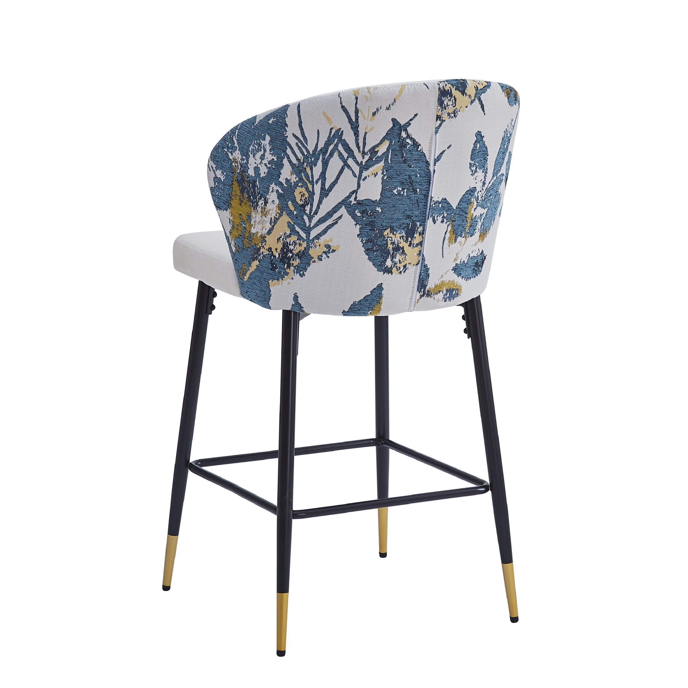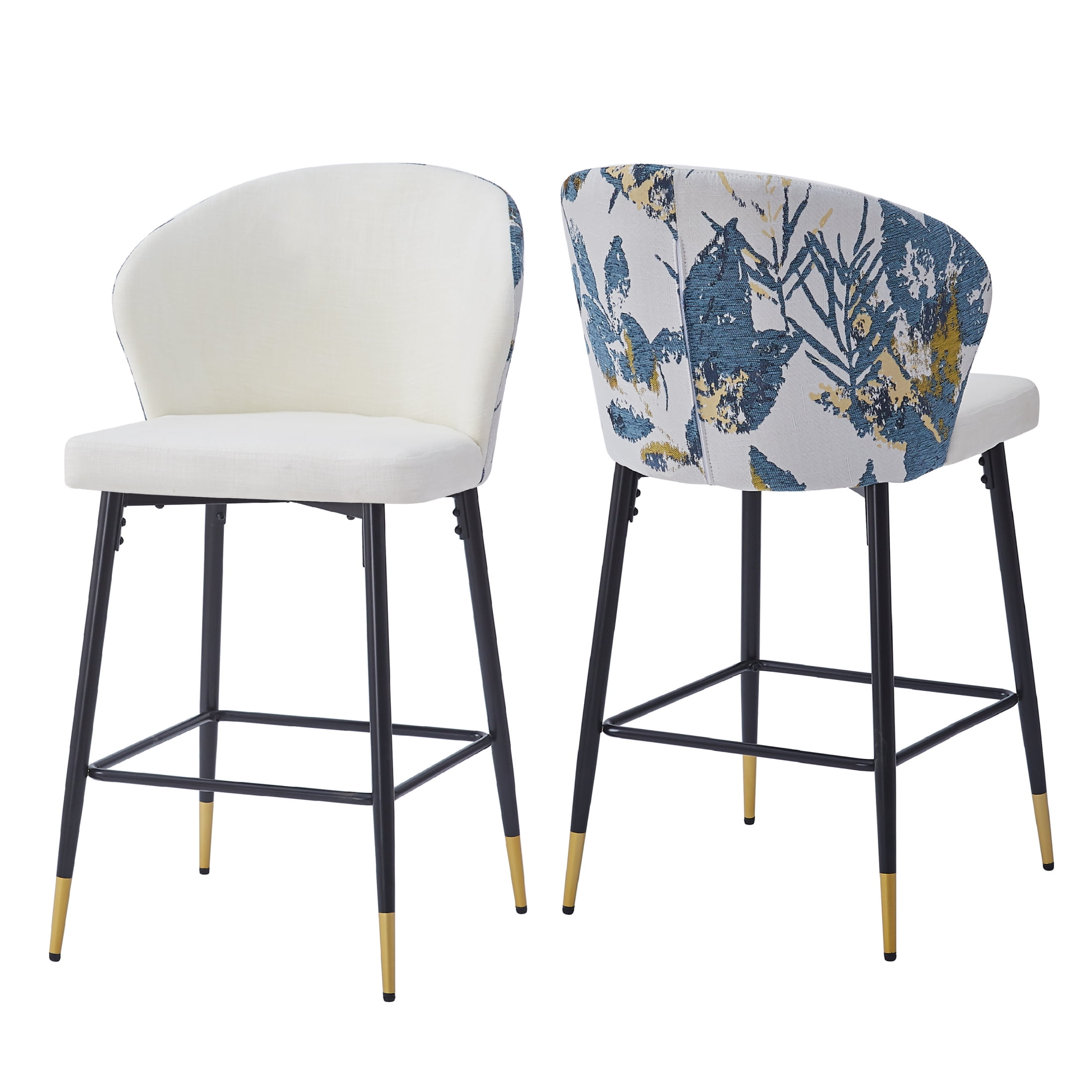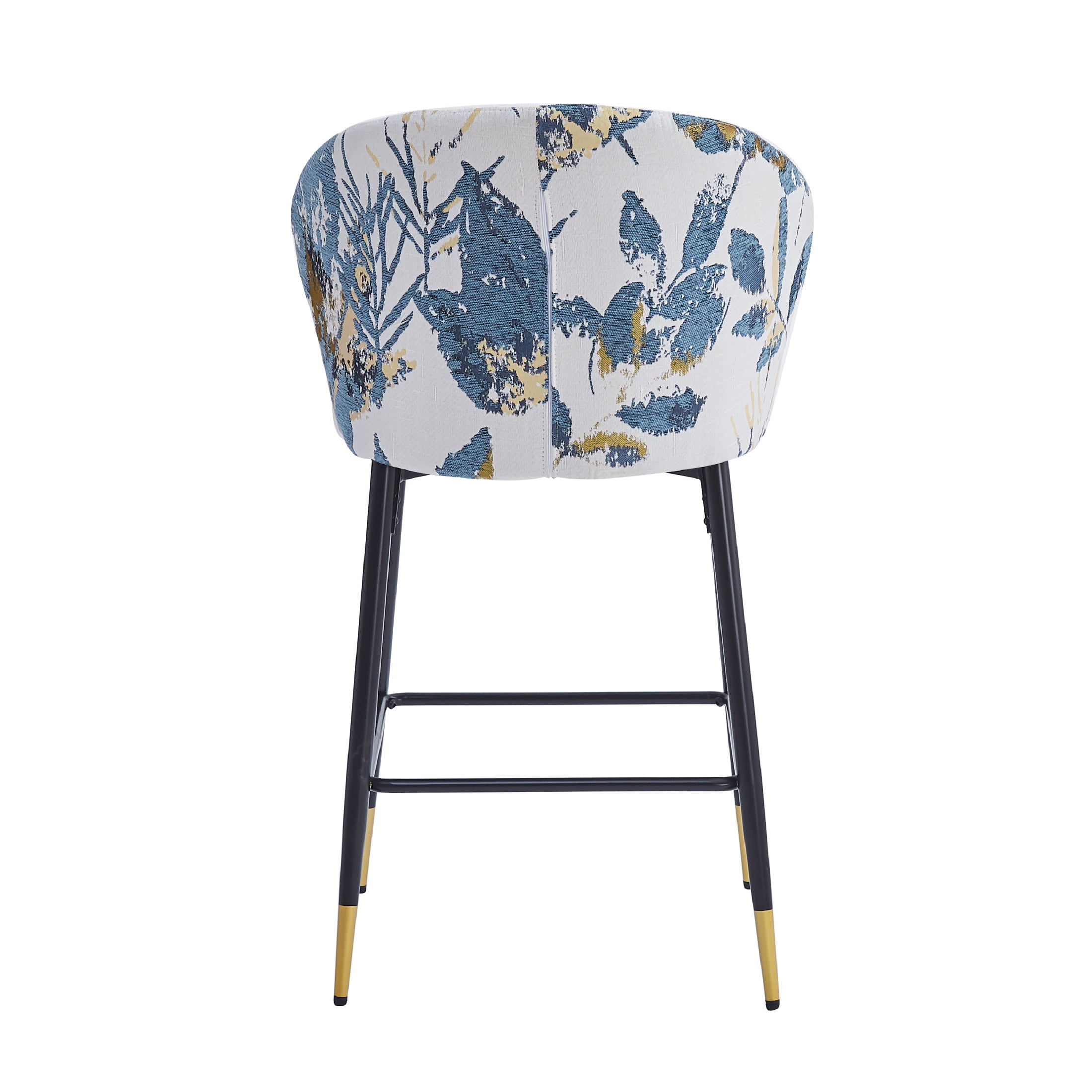 Elevate your dining or kitchen area with these modern counter-height bar stools that combine elegance and functionality. Featuring a sturdy metal frame and black and golden footrests, these stools are adorned with a chic blue and gold jacquard fabric for a touch of sophistication. Each stool is designed for optimal comfort and includes a foam-filled cushion and a curved backrest to provide lasting support during meals or casual conversations. With a 28-inch seat height, they fit most kitchen counters and are equipped with plastic glides to protect your floors. Durable and stylish, these stools can support up to 265 lbs, making them a perfect addition to any modern home. The easy assembly ensures you’ll enjoy your new seating in just minutes. Add a splash of contemporary charm with this set of two stools.