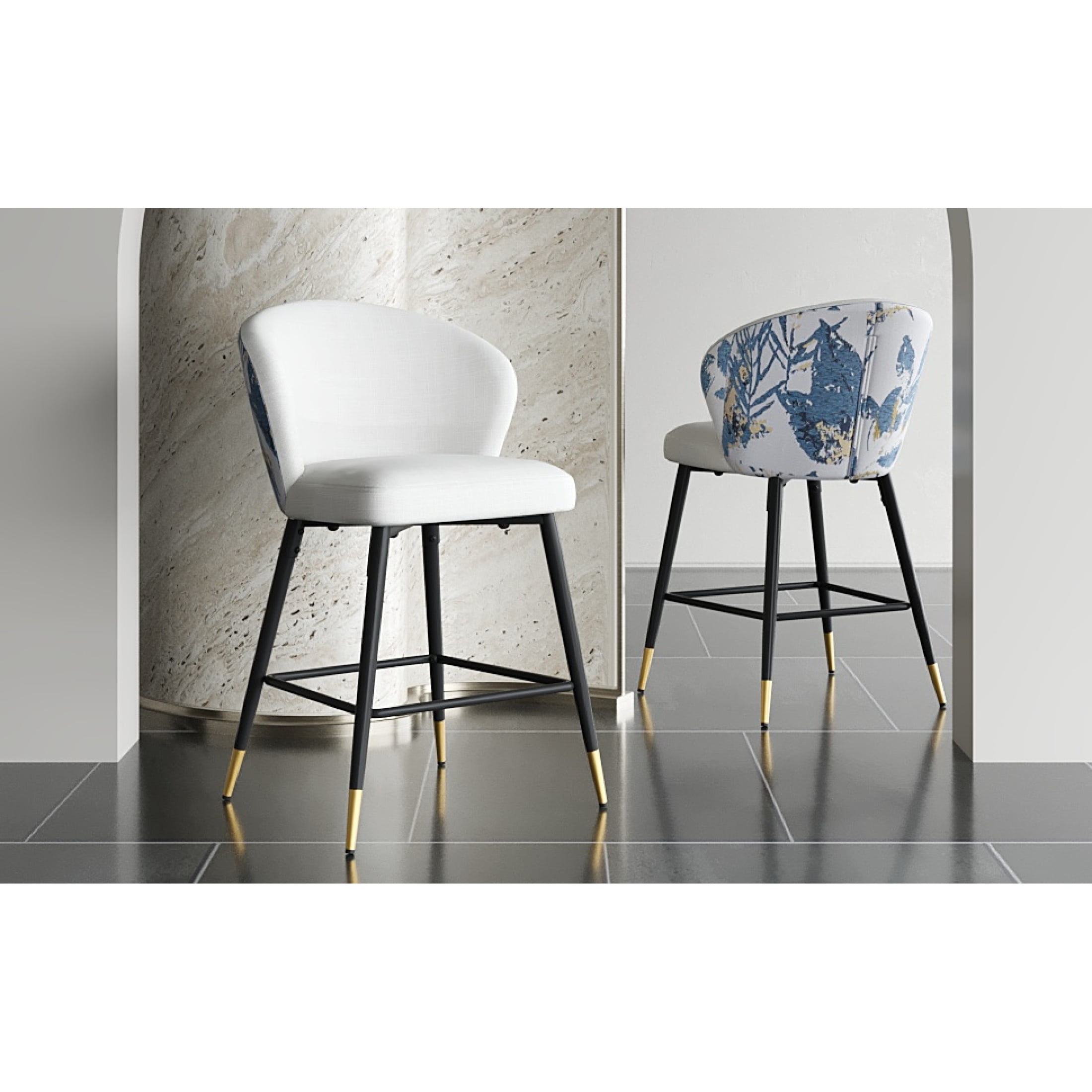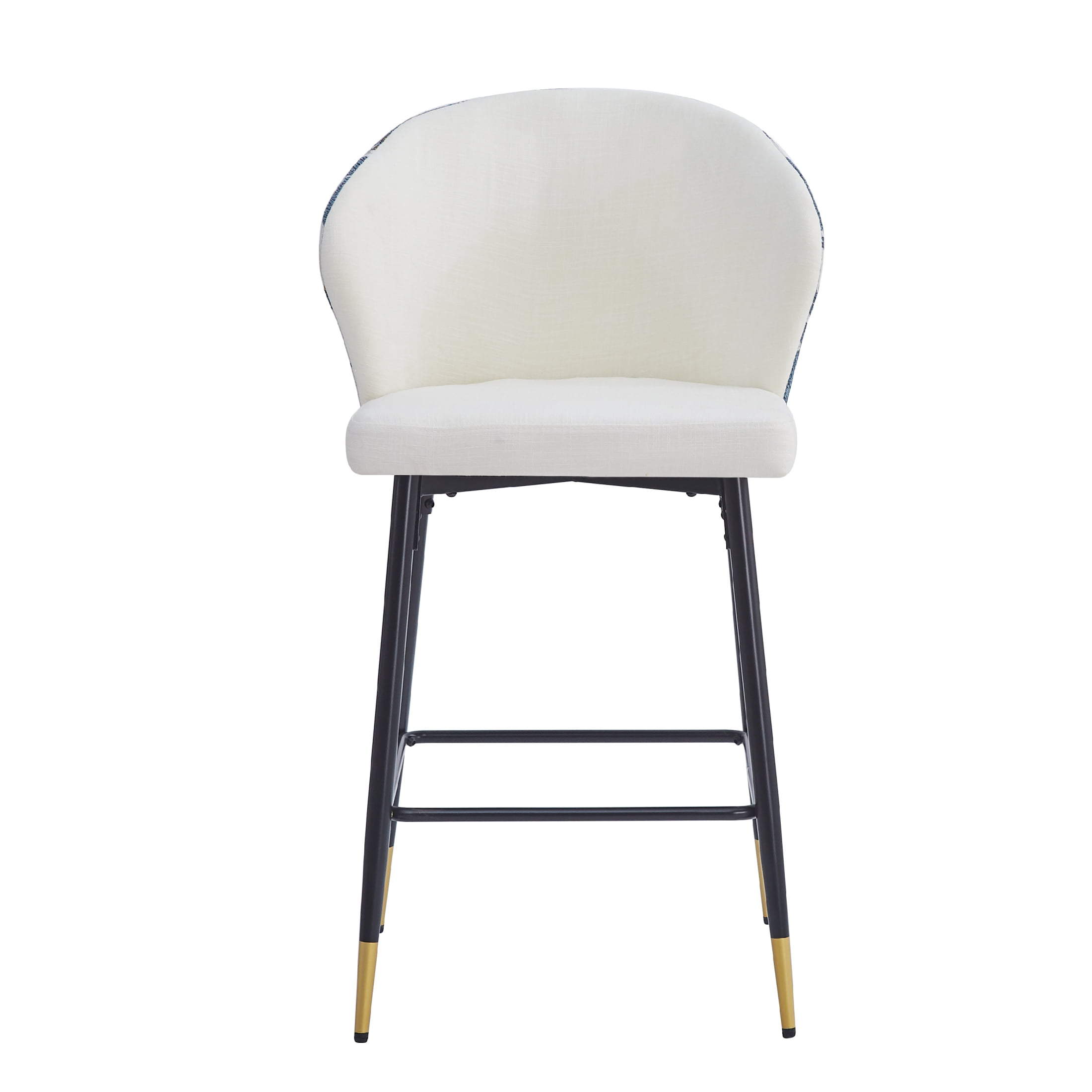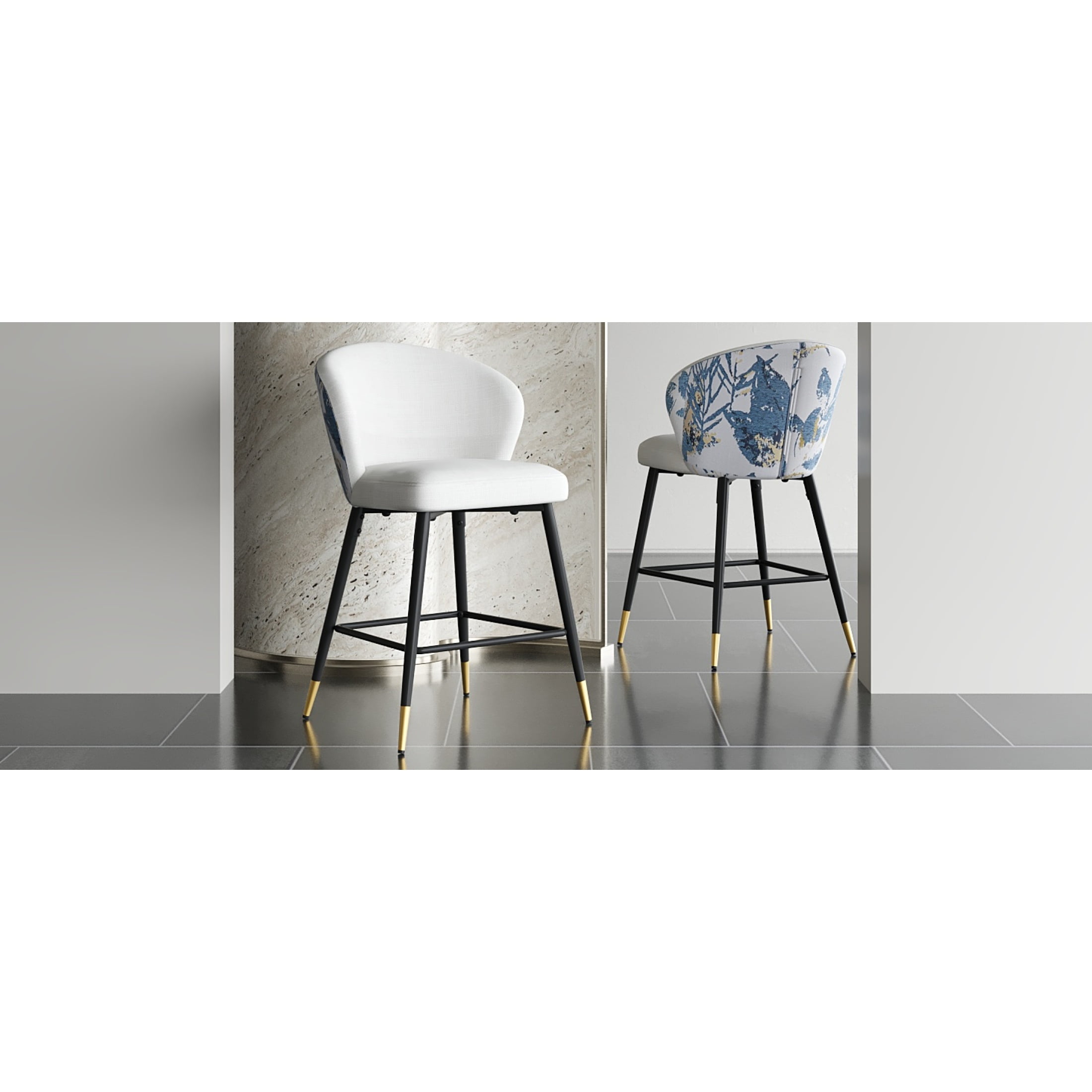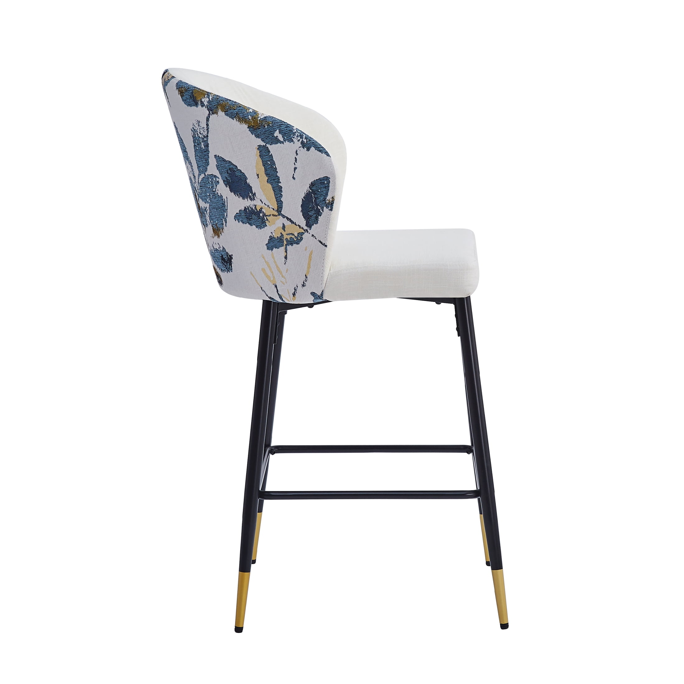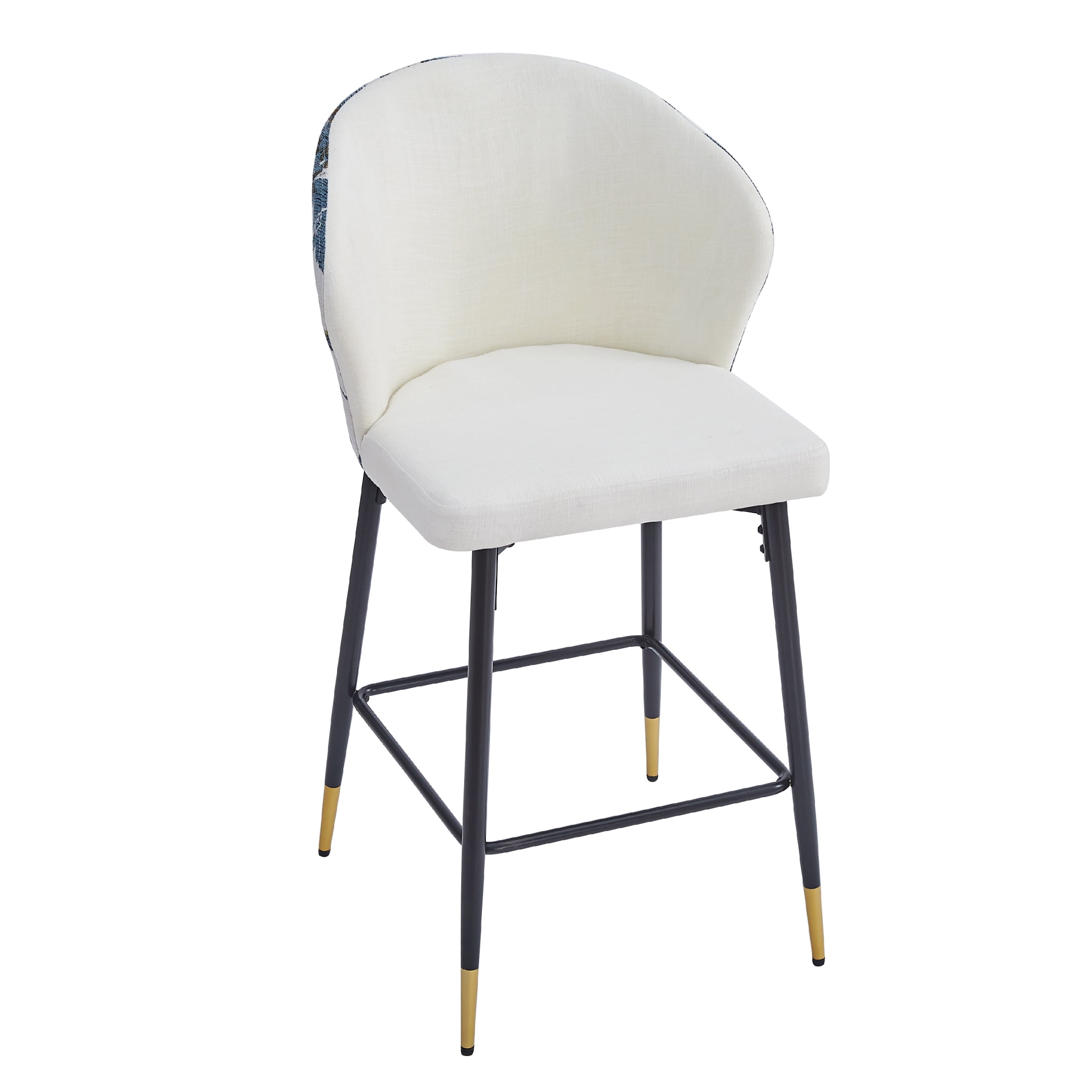 Elevate your dining or kitchen area with these modern counter-height bar stools that combine elegance and functionality. Featuring a sturdy metal frame and black and golden footrests, these stools are adorned with a chic blue and gold jacquard fabric for a touch of sophistication. Each stool is designed for optimal comfort and includes a foam-filled cushion and a curved backrest to provide lasting support during meals or casual conversations. With a 28-inch seat height, they fit most kitchen counters and are equipped with plastic glides to protect your floors. Durable and stylish, these stools can support up to 265 lbs, making them a perfect addition to any modern home. The easy assembly ensures you’ll enjoy your new seating in just minutes. Add a splash of contemporary charm with this set of two stools.