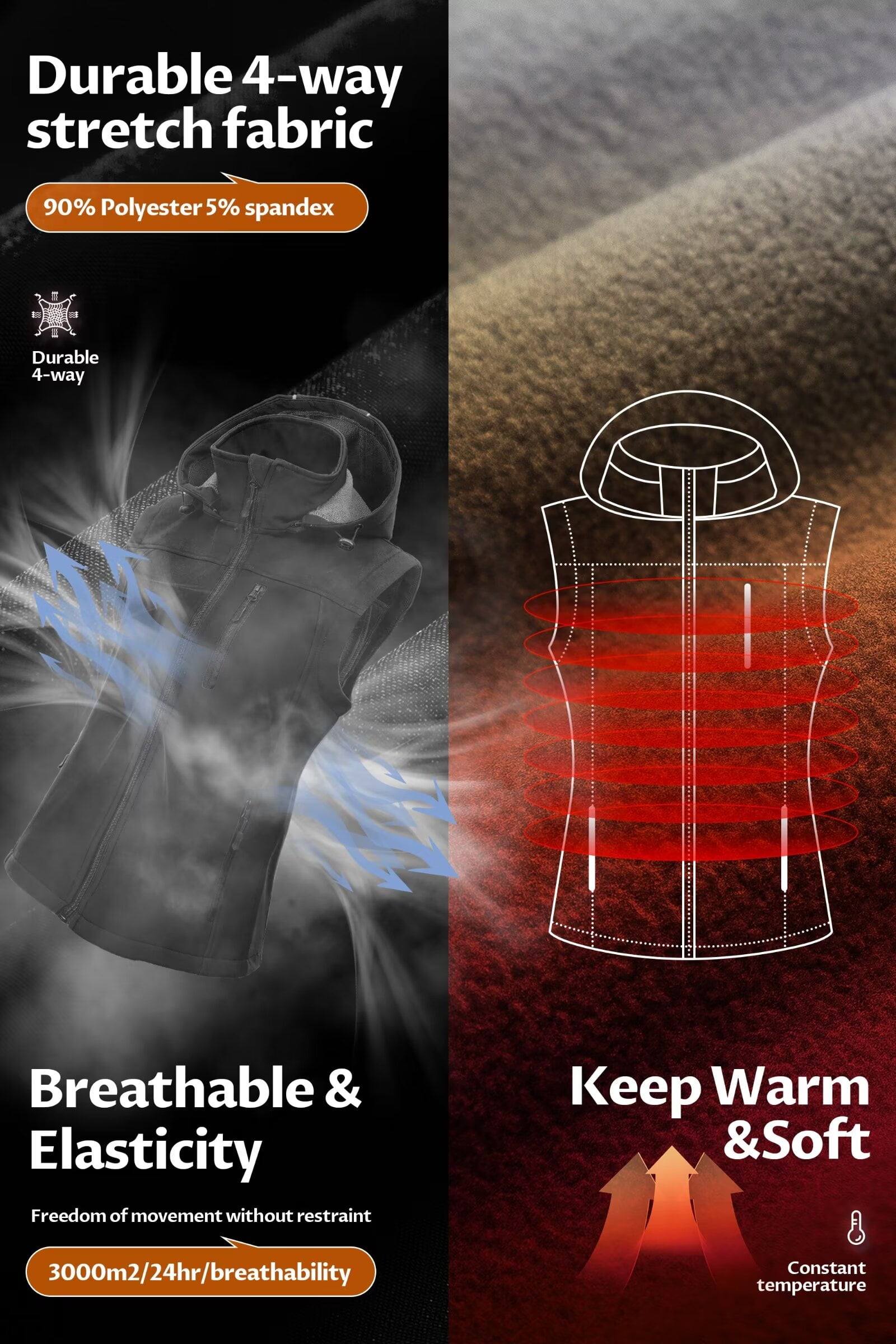 ⭐Cozy Micro-elasticity Soft Shell Vest: This womens running vest is crafted of 95% ultra soft polyester&5% Spandex( 4-way stretch fabric).High density,breathable,durable and stretchy.Keep Your Arms Free,allows a wide range of motion or layer beneath.The soft fabric is smooth and stretchy,wipes off easily and washes well ⭐Windproof Outdoor Vest Jacket: The hooded sleeveless vest outerwear is well made,gorgeous color and lightweight but heavy enough to keep out the wind.This outdoor recreation vest peculiar outer shell is a highly wind-resistant fabric.Elastic cuffs and drawcord hems help seal out the elements.Provides good protection in windy or wet cold weather ⭐Keeps Core Warm: The outer is a lightweight soft shell material.Double layered for insulation.Its a great thin layer to help trap core heat and block the biting wind.Well made garment &durable(not boxy)Great layer under a coat great to keep your core warm in cold climates.You can be worn as a mid layer on frigid days or an outer layer in mild cool weather ⭐Functional Details & 5 Pockets Design: There are 2 zippered side pockets,1 chest zipped pocket,2 inner deep pocket and they are sized to hold a large cell phone,gloves,etc.There are 2 reflective strips behind the hood for safety at night.With sturdy zippers and zipper pulls(SBS Zippers).Detachable hood with adjustable drawstring.Windproof hem drawstring.Easy to pack and practical for layering ⭐Occasion: It’s lightweight,comfortable,breathable,windproof,micro-elasticity,Stylish Sleeveless Jacket.Great softshell vest for spring, autumn and winter weather.This lightweight hooded vest with zipper pockets is comfortable whether biking, hiking, running ,traveling ,golfing,horse back riding or walking