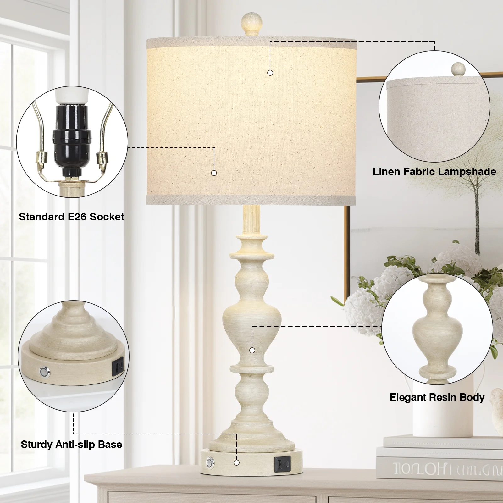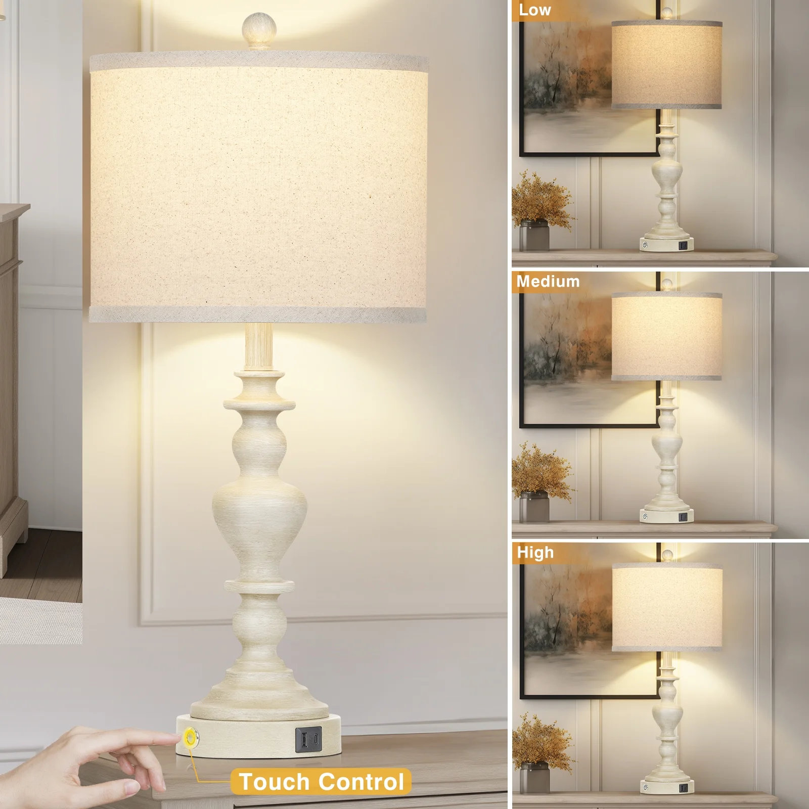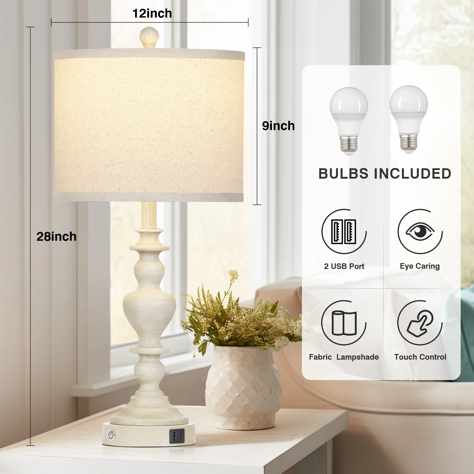 Table Lamp Size After Assembly: overall height of bedside lamp 28 inches; drum lampshade 12″ W x 12″ D x 9″ H. Round lamp base 5.75″ W x 5.75″ D x 1.25″ H Table Lamps with Shade: the nightstand lamps set of 2 with beige linen lampshade, which can effectively soften the light brightness and prevent direct light, protect your eyes, create a warm atmosphere to your living room or bedroom Rustic Table Lamp set of 2: our farmhouse bedside lamp is made of vintage floral carving resin lamp body and round lamp base. The perfect fusion of retro and modern, can add artistic atmosphere to your living room, bedroom, guest room, or office USB A+C Charging Ports: multi-functional AC outlet, USB and USB Type-C charging interfaces facilitate your daily life, allowing you to easily charge your cell phone, tablet, speaker, humidifier, mini fan, mobile device while working, reading or studying. Turn off the modern farmhouse table lamp to still charge, to solve the problem of lack of sockets at the bedside Touch Table Lamps with 3 Way Dimmable Bulb : nightstand lamps set of 2 comes with a sensitive touch switch on the lamp base, which you can touch to quickly turn on/off the light or choose from 3 different brightness levels(low, medium or high) according to your various needs such as sleeping, reading, study, working or daily use. Two LED bulbs included, standard E26 bulb base is compatible with incandescent (60W), LED, CFL, halogen or Edison bulbs. Product Warranty: These bedroom table lamps come with a one-year warranty. If you have any questions, please feel free to contact us(through your order)on , we will reply you within 24 hours and wait for your reply Customer Service: If you have any problems about lamp, please message us on (through your order), we will resolve it and reply you within 24 hours