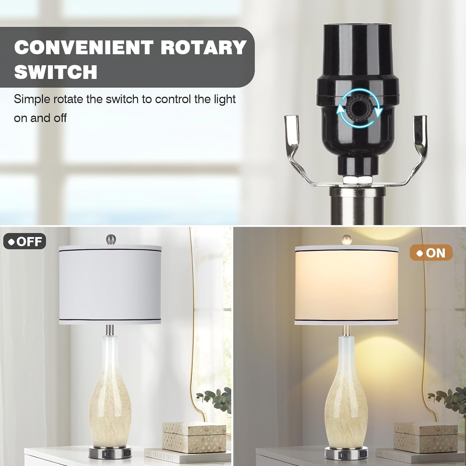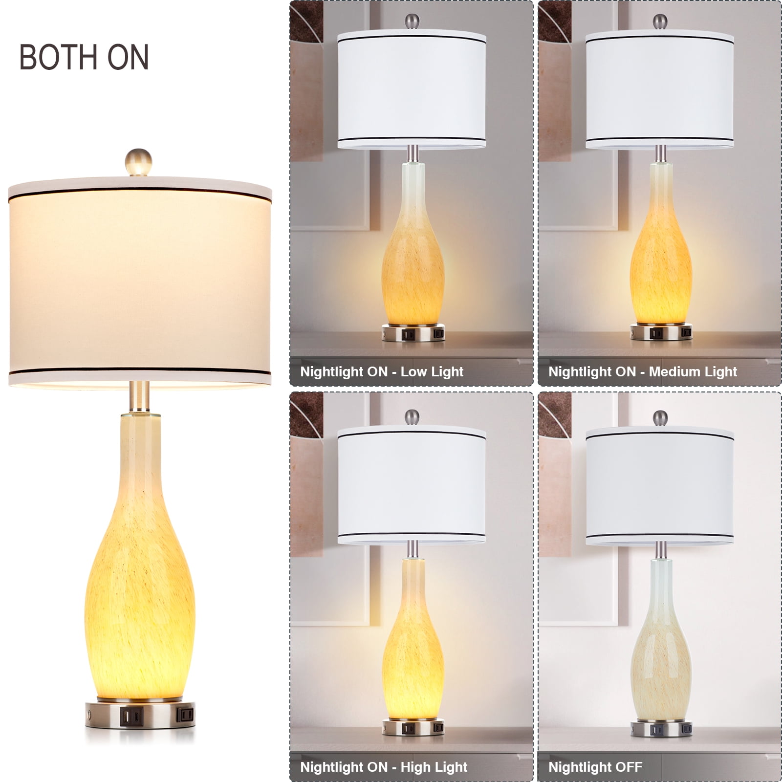 Lamp Dimensions After Assembly : overall height of table lamp 27 inches; drum white linen lampshade overall height is 9 inches, width at the top is 12 inches, width at the bottom is 12 inches; round silver lamp base diameter is 5 inches, height is 1.25 inches. The modern yellow glass table lamps set of 2 can be used on nightstands, side tables, bedside tables, end tables, sofa tables or sofa tables, etc. Table Lamps for Living Room Bedroom : farmhouse glass table lamps set of 2 comes with line pattern yellow vase-shaped glass lamp body and white drum shade, brings modern charm and boho style to your home decor. The linen fabric lampshade can soften the light, greatly eliminate eye fatigue, protect your eyes, and add a lot of warm atmosphere to your family room. Ideal gift for birthday, Valentine’s Day, Easter, Mother’s Day, Father’s Day, Thanksgiving Day, Christmas, New Year. (Lampshade need to be assembled.) Table Lamps with USB A+C Ports : each bedside lamp with one standard USB & one USB-C charging ports and one 120V AC outlet, can quickly charge 3 devices at the same time, making it convenient for you to charge your cell phone, tablet, speaker, humidifier, mini fan and other electronic devices at any time, fully saving your time and space. Perfect for living room, bedroom, dining room, guest room, family room, study, or office. 3 Way Dimmable Touch Table Lamps with Night Light : modern nightstand end table lamp with night light at the bottom, built-in sensitive sensor in the lamp base, you can touch the silver button to adjust 3 different brightness levels (low, medium or high) of the night light, or turn the night light on and off according to your various needs such as sleeping, reading, study, working or daily use. Rotary switch to turn the top light on/off. Two LED bulbs included, standard E26 bulb base is compatible with incandescent (60W), LED, CFL, halogen or Edison bulbs. Product Warranty : We offer a 1 year warranty on glass table lamps set of 2. Customer satisfaction is our top priority and constant pursuit, it is an honor to serve you. If you have any questions about the table lamp, please feel free to contact us on , we will do our best to solve problems and reply you asap or within 24 hours. Thank you very much.