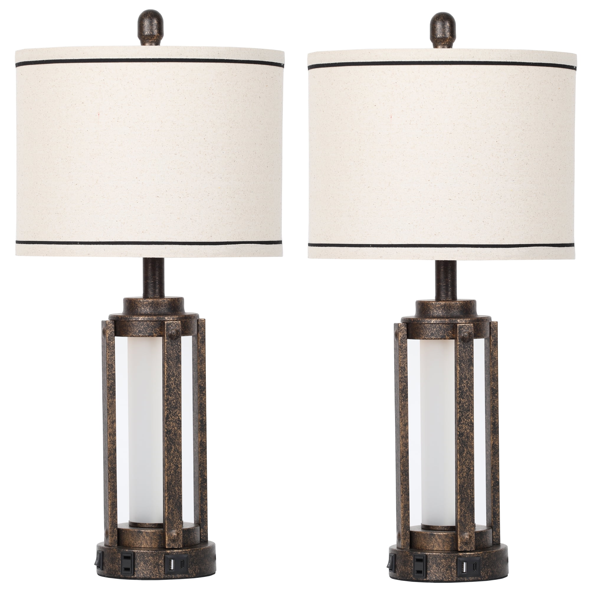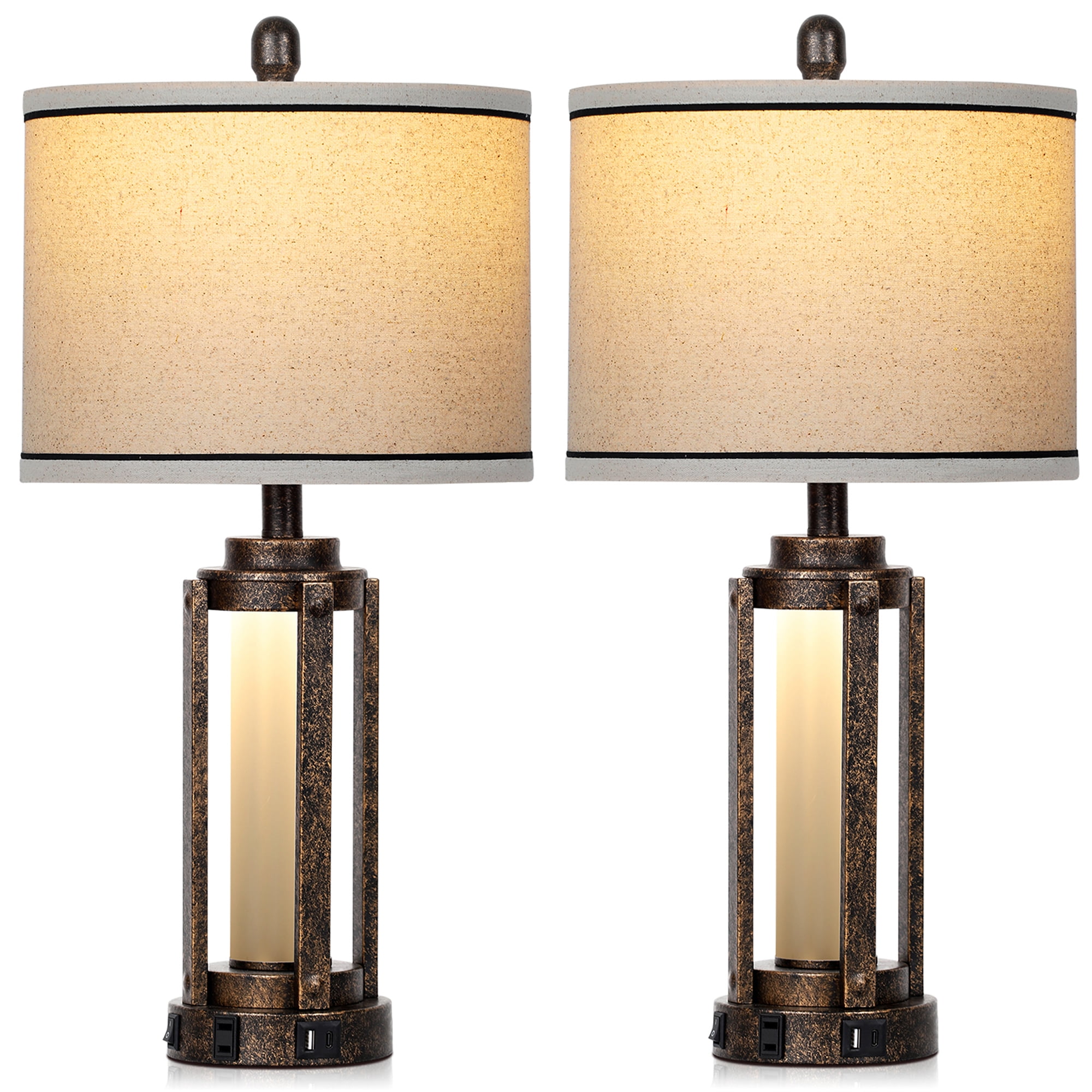 Cinkeda Table Lamps Cinkeda table lamps are designed with a variety of different materials and shapes that match well with modern, farmhouse, mid-century, contemporary, industrial, simple minimalist, bohemian, coastal, nautical style, bring a perfect blend of style and practicality, making it a perfect addition to your home decor 25″ Bedside Lamp Features : ????Design: Gold scraps metal frame lamp body, round lamp base, beige linen fabric lampshade ????Nightlight Control: Press the rocker switch on the base to turn the glass nightlight on and off ????Top Light Control: Rotary switch turn top light on/off only; use LED bulb ????Charging Port: one 120V AC outlet, one 5V 2.1A USB and one 5V 2.1A USB Type-C charging port on the lamp base ????Placement: end table, side table, bedside table, nightstands, dining table, sofa table, entryway hallway table, bathroom corner table, desk, coffee table ????Room: living room, bedroom, dining room, kitchen, guest room, family room, bathroom, dormitory, small room, study, office, nursery or children’s Room ????Occasion: Christmas, house warming gift, birthday, sleep, nursery, pillow talk, meditation, outdoor dinner party, movie night, playing electronics, family gathering Package : ????Quantity: Two table lamps ????Lamp Part: Two lamp Bodies with Bases; Two lampshade fabrics; Two lampshade top rings; Two lampshade bottom rings; Two Harps; Two Finials ????Assembly: Please follow the product instructions to assemble the harp, shade, finial, bulb and lamp body together. Lampshade needs to be assembled ????Tips – Pre????: Please check whether the specifications of the table lamps meet your requirements before purchase ????Tips – After????: After receiving the package, please check all the parts of the lamp and test its function ????CONTACT????: If you have questions, please feel free to contact us(through your order)on , we will reply you within 24 hours and wait for your reply Frequently Asked Questions Q: Will the bulbs include? What type of bulb is it? A: Table lamps come with 2 bulbs. Each lamp use one LED bulb and features an E26 socket that is compatible with CFL, LED, incandescent (60W) bulbs Q: Is there a USB charging port on it? A: Table lamps set of 2 come with USB C+A charging ports and AC outlet, suitable for charging multiple devices Q: Will it be dimmable? A: Modern table lamp is non-dimmable, could be a table lamp or bedside lamp. Perfect for bedroom, living room, small end tables, etc. Q: Is it easy to assemble? A: The bedside lamp assembly is very simple and can be completed in a few minutes by following the instructions provided