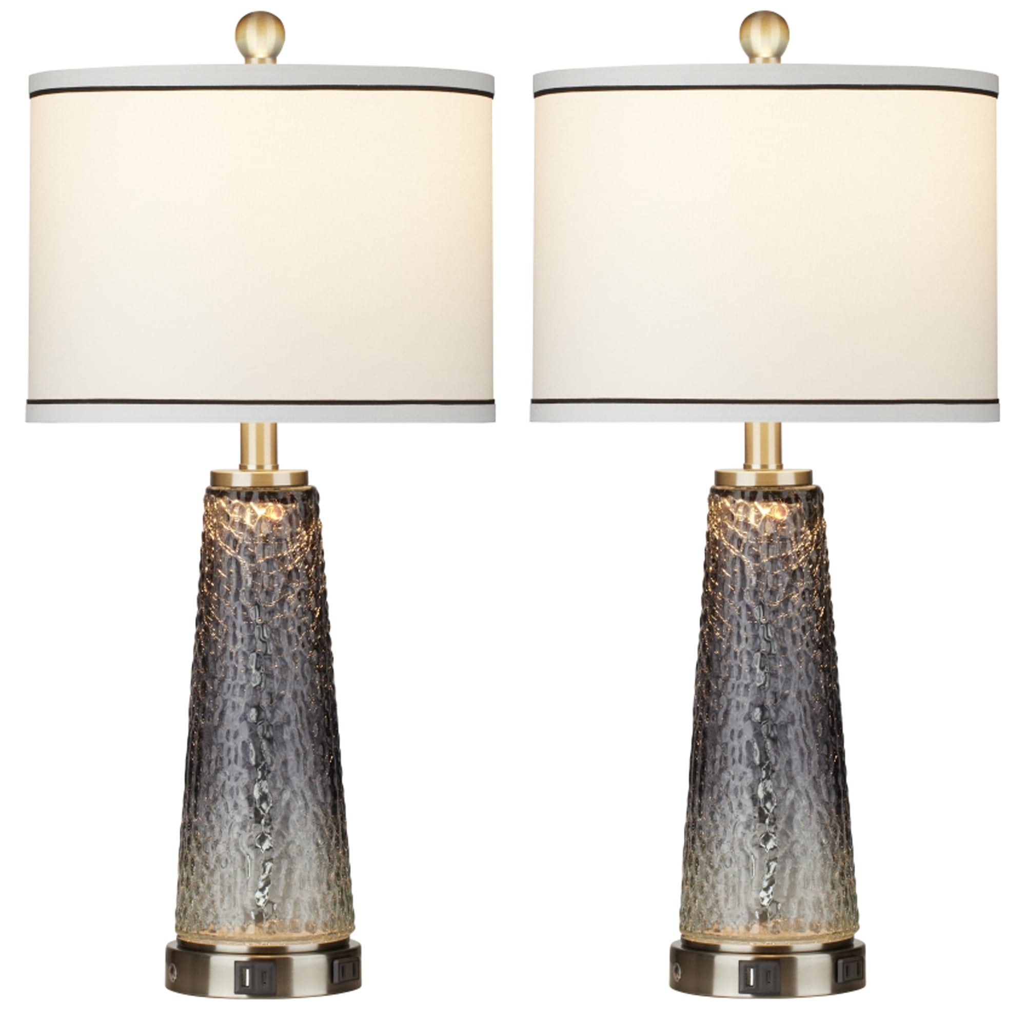 Cinkeda Table Lamps Cinkeda table lamps are designed with a variety of different materials and shapes that match well with modern, farmhouse, mid-century, contemporary, industrial, simple minimalist, bohemian, coastal, nautical style, bring a perfect blend of style and practicality, making it a perfect addition to your home decor 26″ Bedside Lamp Features : ????Design: gradient grey ice crackle glass lamp body, silver metal round lamp base, white linen lampshade ????Nightlight Control: touch silver button on the lamp base to turn on/off the nightlight; LED light ????Top Light Control: Rotary switch turn top light on/off only; use LED bulb ????Charging Port: one 120V AC outlet, one 5V 2.1A USB and one 5V 2.1A USB Type-C charging port on the lamp base ????Placement: end table, side table, bedside table, nightstands, dining table, sofa table, entryway hallway table, bathroom corner table, desk, coffee table ????Room: living room, bedroom, dining room, kitchen, guest room, family room, bathroom, dormitory, small room, study, office, nursery or children’s Room ????Occasion: Christmas, house warming gift, birthday, sleep, nursery, pillow talk, meditation, outdoor dinner party, movie night, playing electronics, family gathering Package : ????Quantity: Two table lamps ????Lamp Part: Two lamp Bodies with Bases; Two lampshade fabrics; Two lampshade top rings; Two lampshade bottom rings; Two Harps; Two Finials ????Assembly: Please follow the product instructions to assemble the harp, shade, finial, bulb and lamp body together. Lampshade needs to be assembled ????Tips – Pre: Please check whether the specifications of the table lamps meet your requirements before purchase ????Tips – After: After receiving the package, please check all the parts of the lamp and test its function ????CONTACT: If you have questions, please feel free to contact us(through your order)on , we will reply you within 24 hours and wait for your reply Frequently Asked Questions Q: Will the bulbs include? What type of bulb is it? A: Table lamps come with 2 bulbs. Each lamp use one LED bulb and features an E26 socket that is compatible with CFL, LED, incandescent (60W) bulbs Q: Is there a USB charging port on it? A: Table lamps come with USB C+A charging ports and AC outlet, suitable for charging multiple devices Q: Will it be dimmable? A: Modern lamp has non-dimmable top light and nightlight, could be a table lamp or bedside lamp. Perfect for bedroom, living room, small end tables, etc. Q: Is it easy to assemble? A: The bedside lamp assembly is very simple and can be completed in a few minutes by following the instructions provided