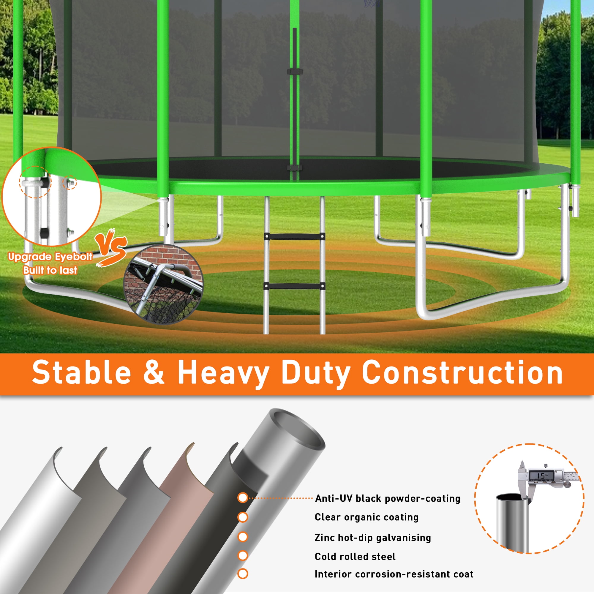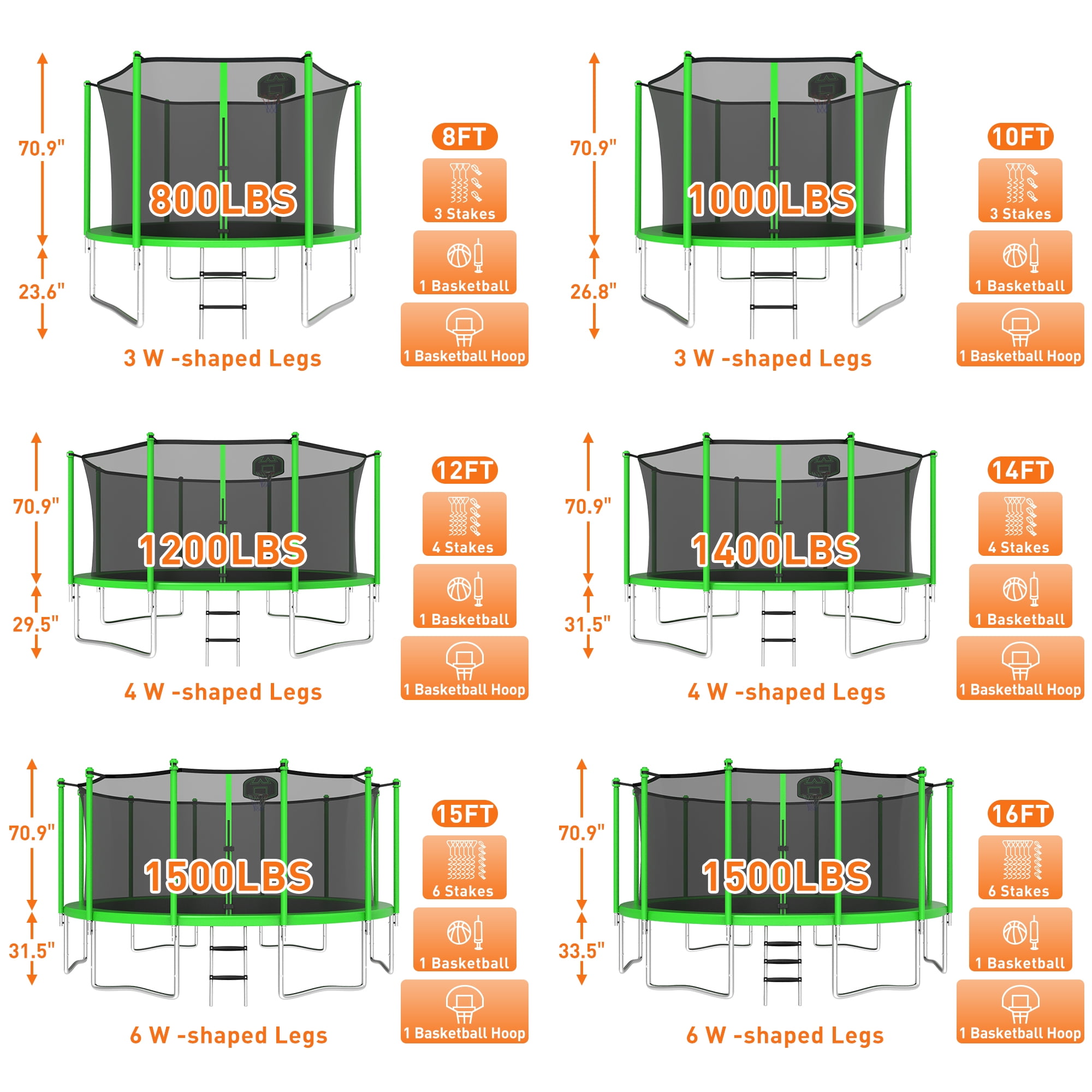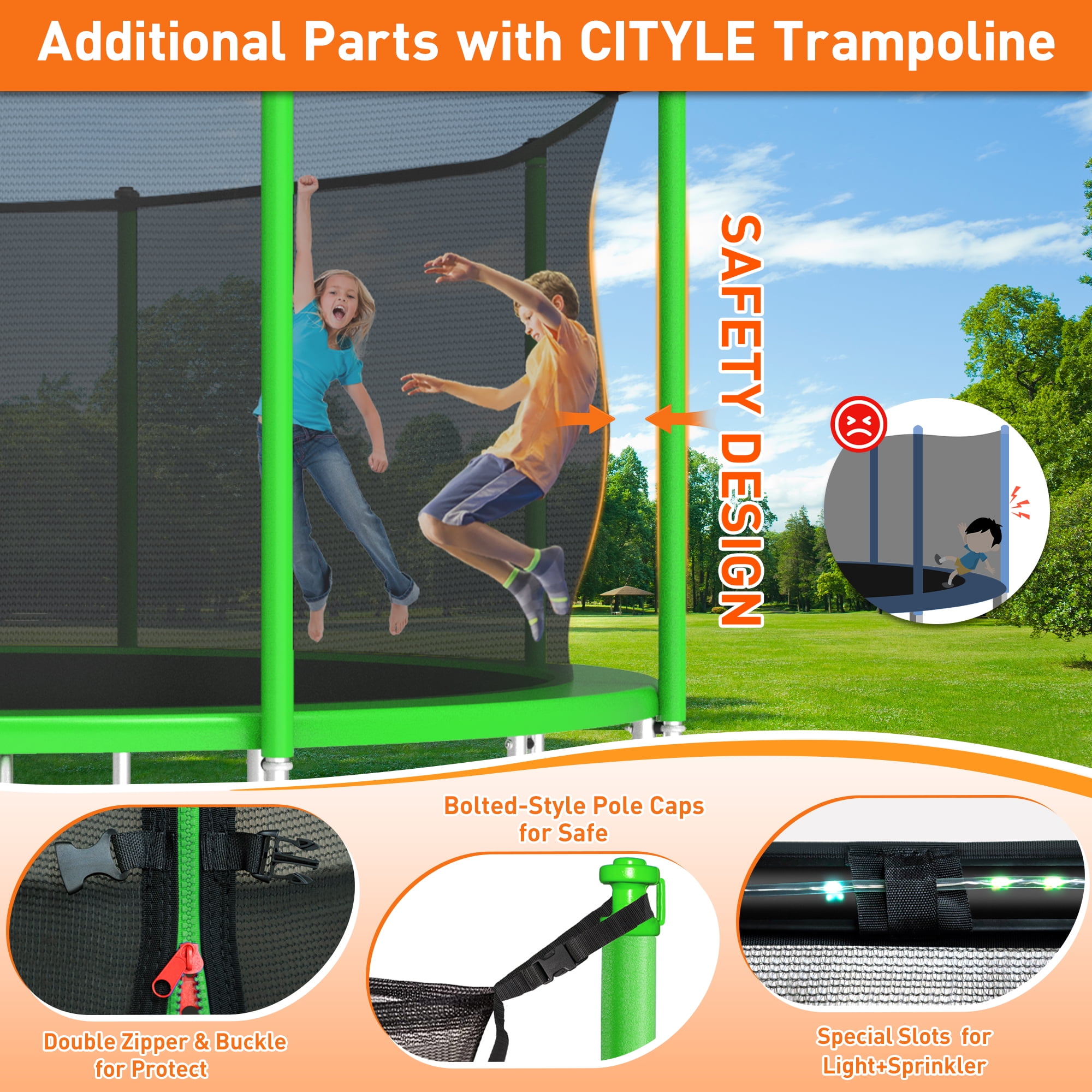 CITYLE 2025 NEW UPGRADED trampoline is back! We have upgraded CITYLE 12FT trampoline from performance, appearance and quality in many dimensions. We will always strive to create a premium outdoor trampoline that meets all your needs. UPGRADED: — CITYLE Backyard Trampoline 2025 will use bright color scheme to make your green trampoline with net look simple and advanced. — Our heavy duty trampoline frame is designed with galvanized coating to fully protect the frame from chemical damage. — We have upgraded the design of the basket to make the installation easier and the structure more stable. — We have upgraded the assembly of the frame to make the assembly easier and labor-saving. — We have updated the ladder to wide treads for more comfortable and easy climbing. — The upgraded spring cover is waterproof and UV resistant, protecting the spring and frame from chemical damage. — We redesigned and optimized the assembly instructions to be easier to read and guide you step by step assembly. Premium Design: 1. Our trampoline net poles are covered with PE sleeves over EPE foam, and our trampoline frames are fully covered with a galvanized coating that protects the poles from the sun, wind and rain, thus helping to extend their service life. 2. Our trampoline with enclosure is equipped with high-density safety net and 8 safety poles with internal net design, and the distance between the net and poles is kept enough to ensure that users will not be injured by hitting the poles directly. 3. Our heavy duty 12 feet trampoline for adults is equipped with 4 W-shaped support legs, providing 8 pivot points to make the trampoline for kids more stable. The attached wind pile ensures that it is not affected even in extreme weather. 4. The reinforced jumping mat PP has passed the American UV standard 5000 hours test. Padding cover PE and safety net PE have passed the American UV standard 500 hours test. 5. Sun-proof and waterproof spring cover prevents the spring from being damaged by chemicals. 6. 80pcs 180mm high tension springs ensure our 12′ trampoline becomes a super trampoline. Product Name: 12 FT Trampoline with Basketball Hoop and Enclosure Net Product Type: Outdoor Trampoline 12 FT Maximum Weight Capacity: 1200LBS Product size: 12FT* 12FT* 8.5FT Product N.W.: 160LBS Spring quantity: 80PCS Weight capacity: 1200lbs Wind Stakes: 4pcs W-Shaped Legs: 4pcs Jumping Mat Material: PP Spring Cover Material: PE Frame Material: Galvanized Steel