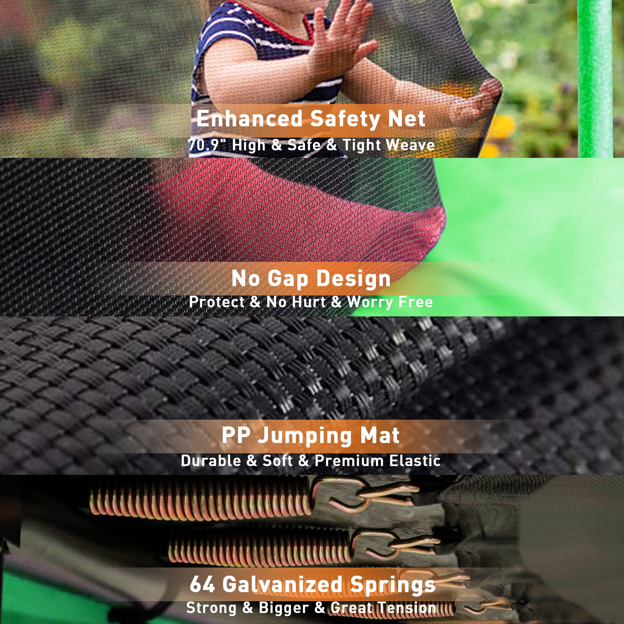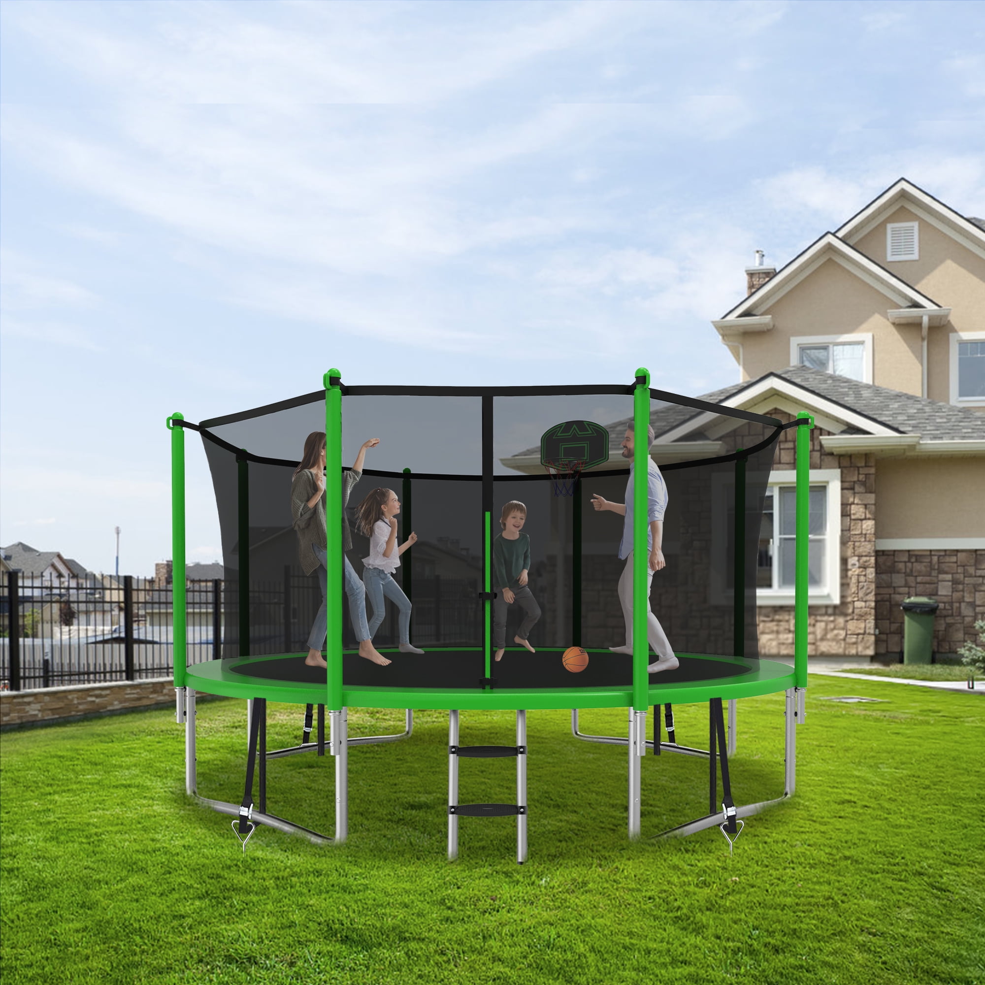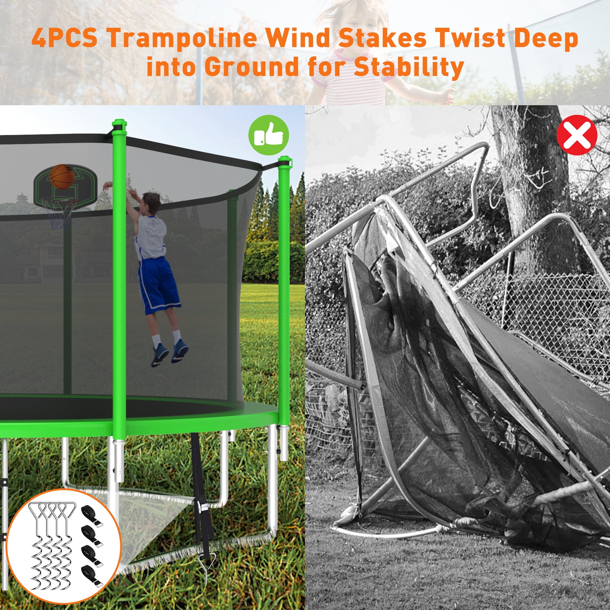 CITYLE 2025 NEW UPGRADED trampoline is back! We have upgraded CITYLE 12FT trampoline from performance, appearance and quality in many dimensions. We will always strive to create a premium outdoor trampoline that meets all your needs. UPGRADED: — CITYLE Backyard Trampoline 2025 will use bright color scheme to make your green trampoline with net look simple and advanced. — Our heavy duty trampoline frame is designed with galvanized coating to fully protect the frame from chemical damage. — We have upgraded the design of the basket to make the installation easier and the structure more stable. — We have upgraded the assembly of the frame to make the assembly easier and labor-saving. — We have updated the ladder to wide treads for more comfortable and easy climbing. — The upgraded spring cover is waterproof and UV resistant, protecting the spring and frame from chemical damage. — We redesigned and optimized the assembly instructions to be easier to read and guide you step by step assembly. Premium Design: 1. Our trampoline net poles are covered with PE sleeves over EPE foam, and our trampoline frames are fully covered with a galvanized coating that protects the poles from the sun, wind and rain, thus helping to extend their service life. 2. Our trampoline with enclosure is equipped with high-density safety net and 8 safety poles with internal net design, and the distance between the net and poles is kept enough to ensure that users will not be injured by hitting the poles directly. 3. Our heavy duty 12 feet trampoline for adults is equipped with 4 W-shaped support legs, providing 8 pivot points to make the trampoline for kids more stable. The attached wind pile ensures that it is not affected even in extreme weather. 4. The reinforced jumping mat PP has passed the American UV standard 5000 hours test. Padding cover PE and safety net PE have passed the American UV standard 500 hours test. 5. Sun-proof and waterproof spring cover prevents the spring from being damaged by chemicals. 6. 80pcs 180mm high tension springs ensure our 12′ trampoline becomes a super trampoline. Product Name: 12 FT Trampoline with Basketball Hoop and Enclosure Net Product Type: Outdoor Trampoline 12 FT Maximum Weight Capacity: 1200LBS Product size: 12FT* 12FT* 8.5FT Product N.W.: 160LBS Spring quantity: 80PCS Weight capacity: 1200lbs Wind Stakes: 4pcs W-Shaped Legs: 4pcs Jumping Mat Material: PP Spring Cover Material: PE Frame Material: Galvanized Steel