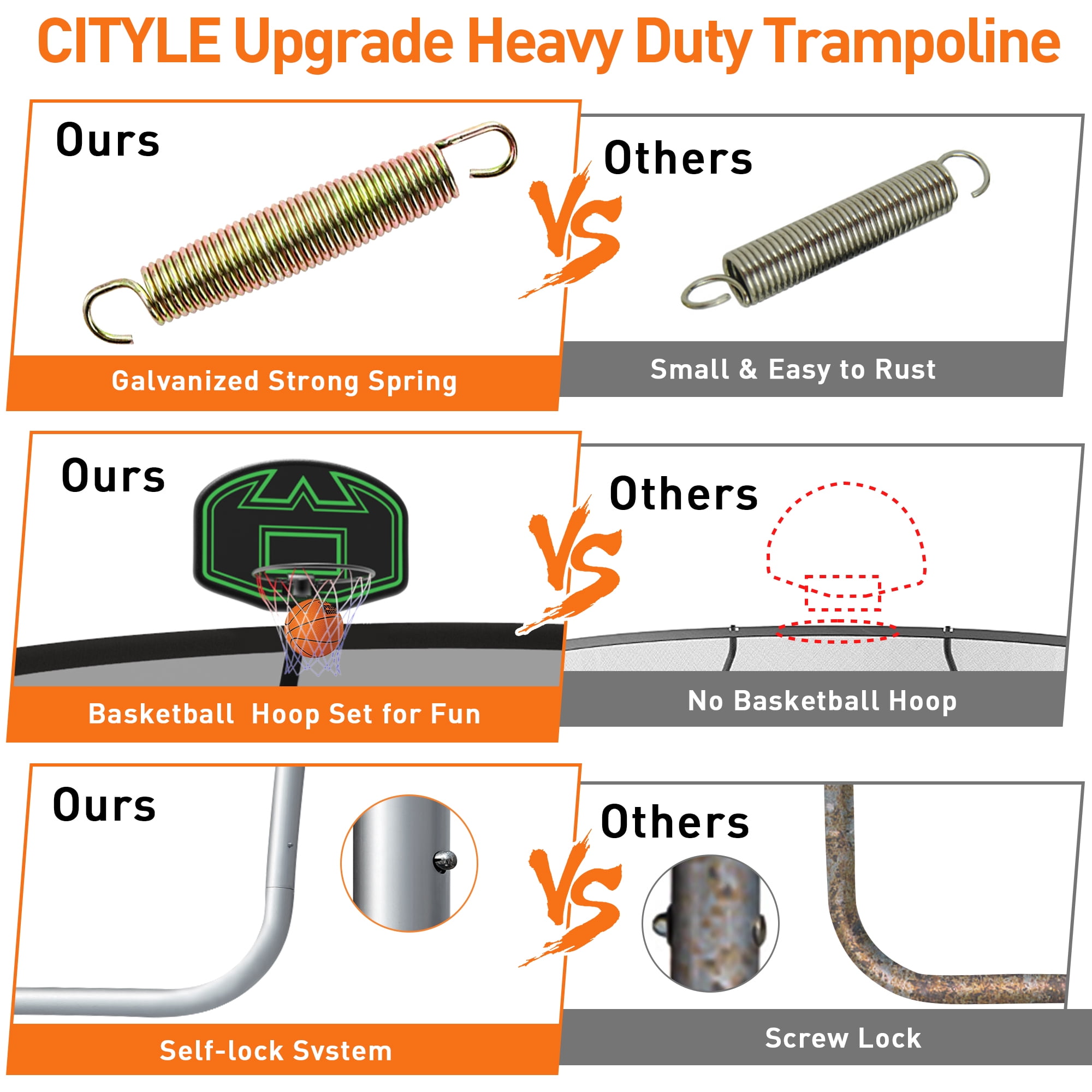 【Safety Is Job One】CITYLE 1200LBS weight capacity 12ft trampoline with basketball hoop for 6-8 kids and 3-4 adults, which meets advanced international standards on components, assembly and use. Besides, outdoor trampoline with enclosure is equipped with high wind trampoline tie down anchor kits to maintain excellent stability in stormy weather. Under the premise of safety first, CITYLE trampoline combo will become a bouncing paradise for the whole happy families. 【Trampoline Innovation Leaders】CITYLE trampoline with net is fully covered by Galvanized Anti-Rust Coating, sturdier and durable, last a very long time; heavy duty trampoline adopts Reinforced Curved Poles, avoiding collisions during play; Safety enclosure net is designed to 360° tightly wrap jump mat, No Gap Design to avoid pinching feet when bouncing; To create more fun, CITYLE brings trampoline with basketball hoop and rubber ball kit, a new bounce experience for kids and adults! 【Every Detail Makes Quality】1.5mm cold-rolled steel metal frame is covered by galvanized anti-rust coating, sturdier and durable; 6.5 inch super elastic galvanized anti-rust spring and high-density, anti-UV PP Bouncing jumping mat provide the best bounce experience; Tightly woven safety enclosure net with the double-sided zipper and double buckle create the safest bounce environment; Widened Anti-Slip trampoline ladder for easy entrance and exit. 【100% Easy to Install】The connector of w-shaped leg tube, net poles and the top edge of enclosure all adopt metal pop-up buckles design, which increases the installation efficiency by 50%, compared to traditional screws. To put together easily, trampoline 12 feet installation tools needed are grouped in a box including 2* spring tools. Furthermore, CITYLE outdoor backyard trampoline for kids provide graphic installation manual and video installation guide, 2 people can fast setup 12 foot trampoline in 1-2 hours. 【5-Star Customer Service】CITYLE promise only design, produce and manufacture premium trampolines and our mission is to let valued customers enjoy Touch the Sky fun. CITYLE trampoline for adults provides 24 months warranty for all trampoline parts and accessories, 30 days free return service, 24/7 online and telephone after-sales service. Best Christmas gift for kids children families!