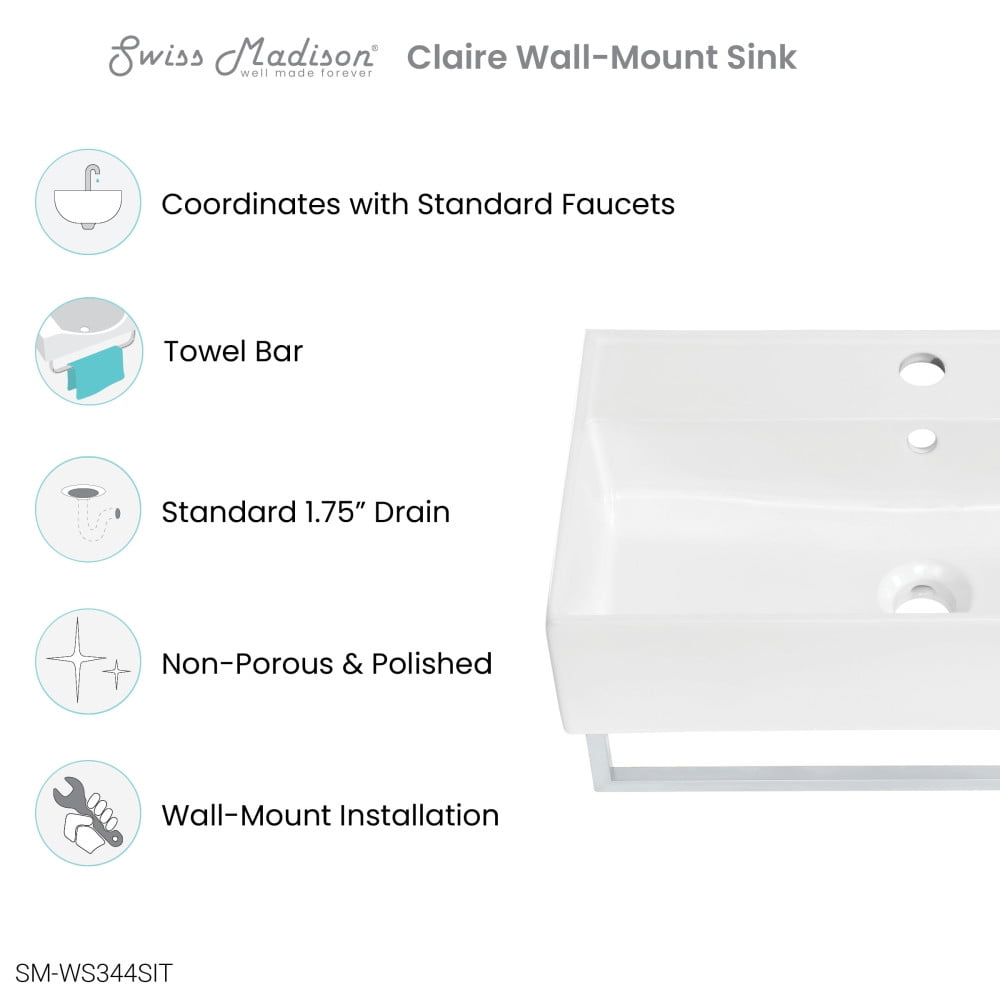 Wall-Mount Installation: Wall-mount sinks are a space-saving, versatile option, offering users installation height customizability. Durable Non-Porous Scratch Resistant Ceramic: Developed from ceramic, that is scratch-resistant and non-porous, providing a durable and reliable option that can withstand routine use. Single Faucet Hole: Pre-drilled standard 1 3/8″ Single Faucet Hole Drain: Standard 1.75″ inch drain opening. Basin Depth: 5.31 inches. Collection: Part of the Claire Collection, explore additional products in this collection to complete the room.
