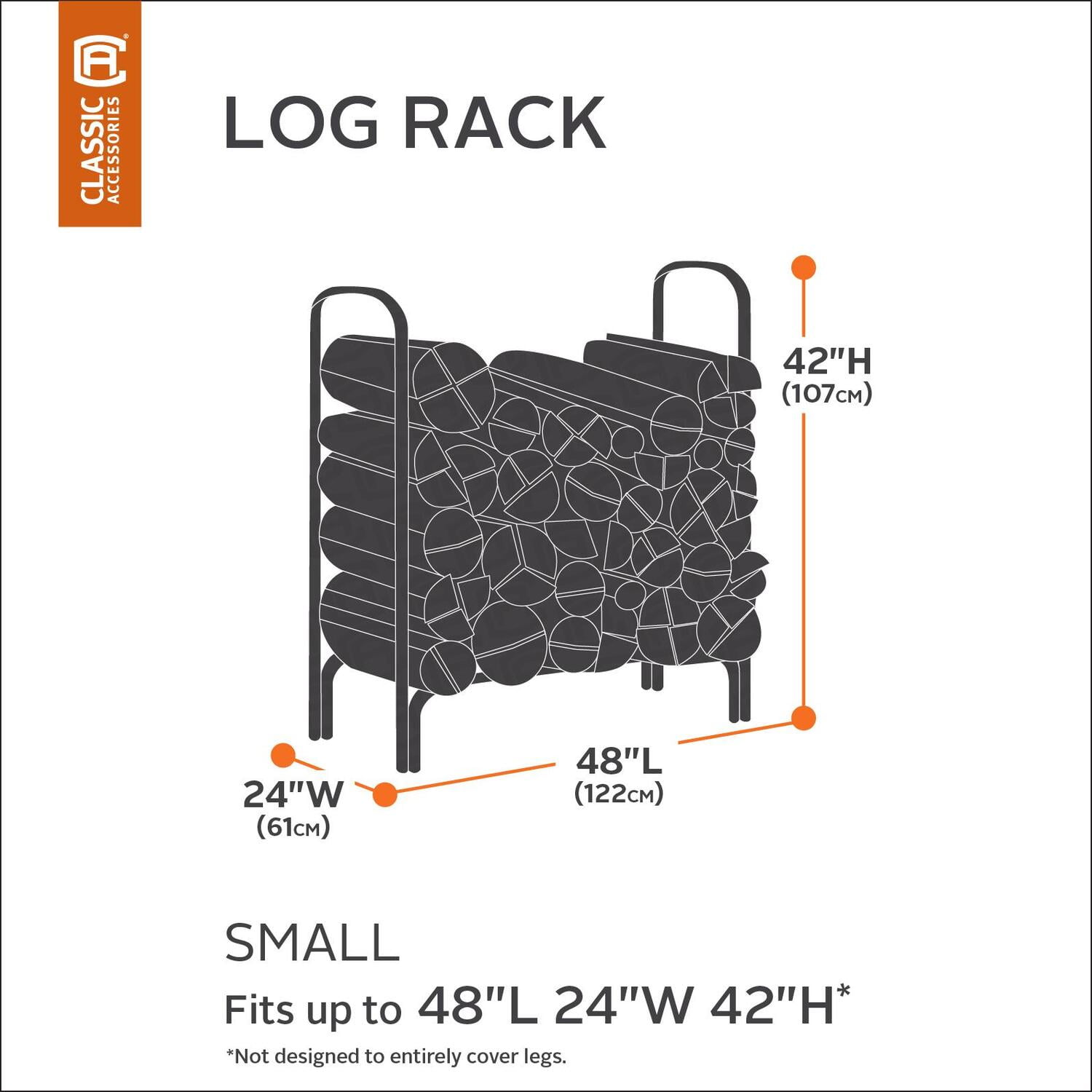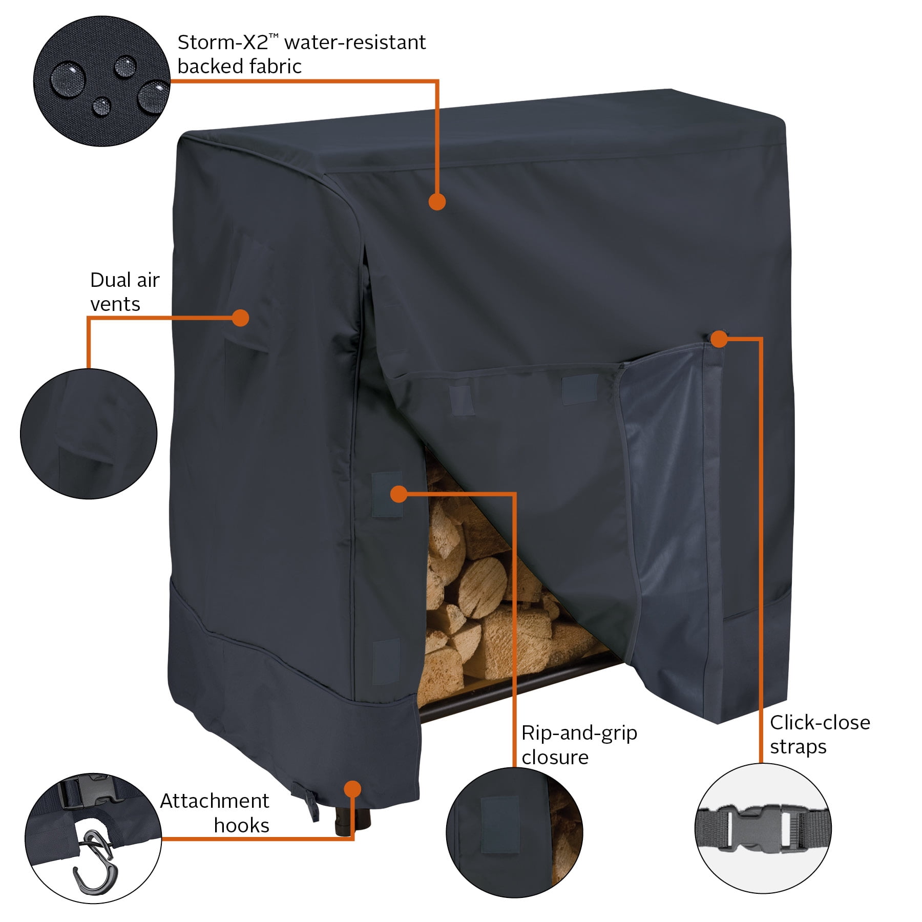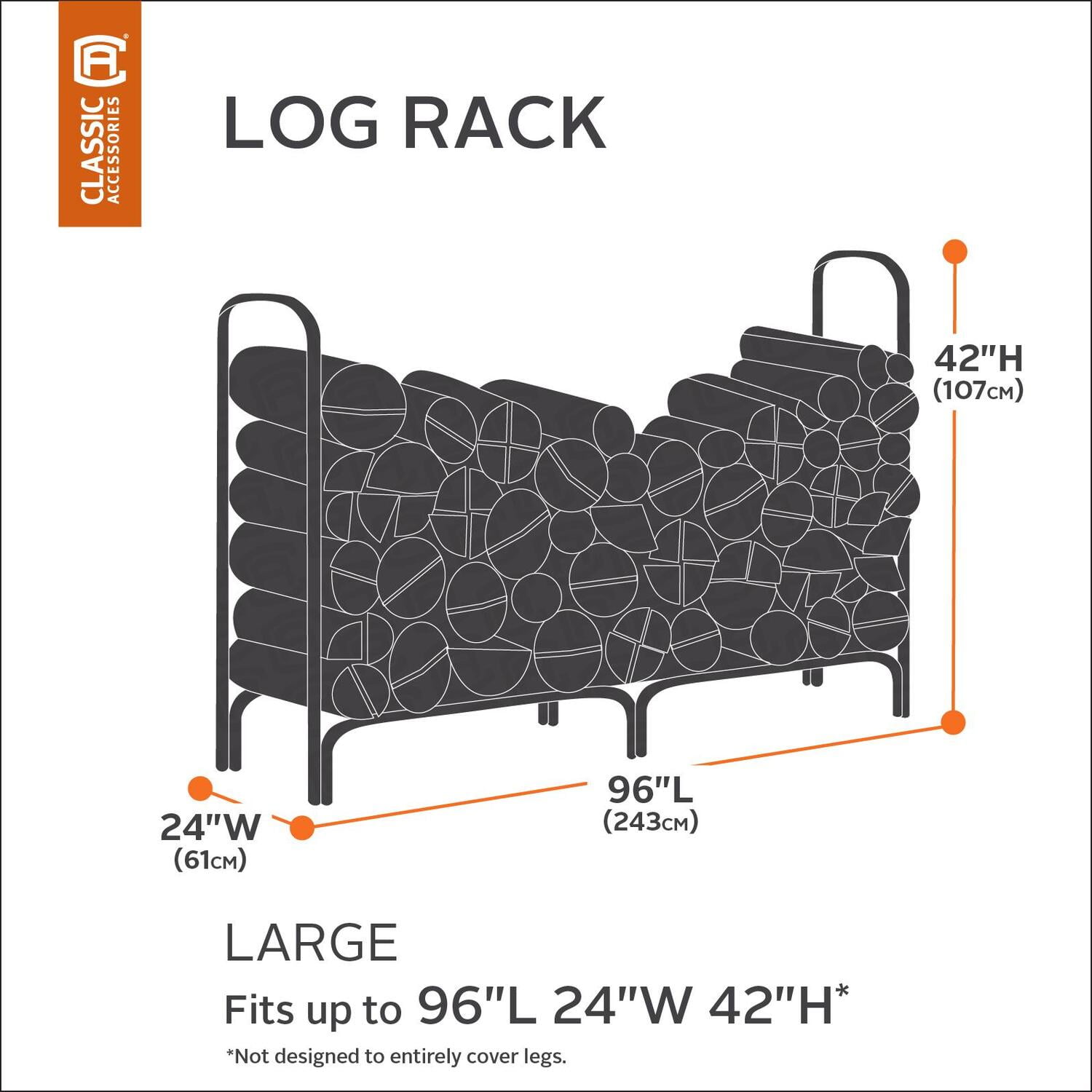 Fits 4′ log racks 48″L x 24″W x 42″H One-year limited warranty Weather-X fabric with water-resistant backing for maximum strength, abrasion and weather protection Provides extra protection against UV damage, bad weather, dirt, birds and tree sap Elastic hem cord with non-scratch hooks for extra attachment options Full front opening for easy loading and unloading Secure front closure with fast rip-and-grip tabs Click-close straps to secure cover on the windiest days Dual air vents circulate air and help prevent ballooning in wind Improved reinforced corners to prevent tearing Not designed to entirely cover the wheels or legs