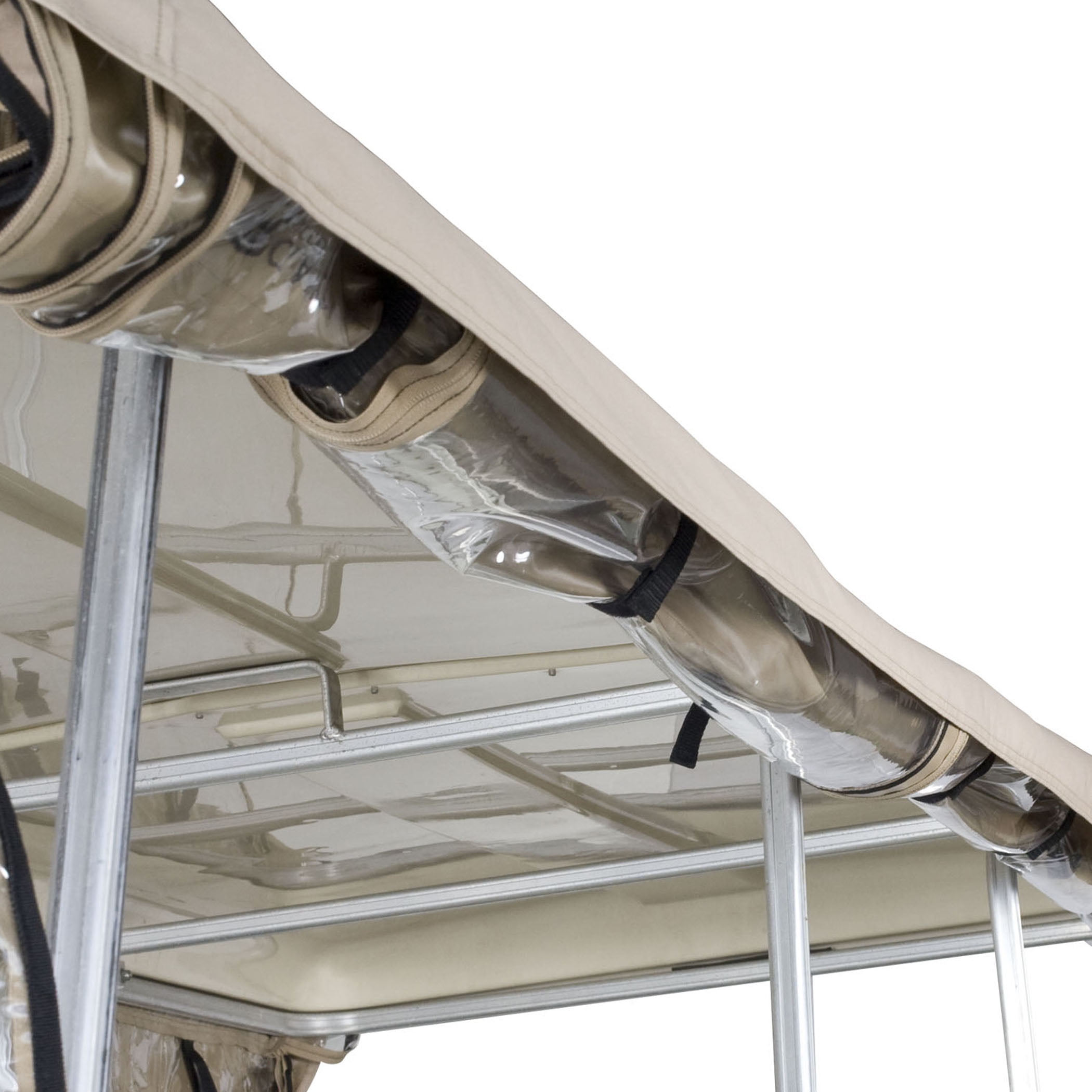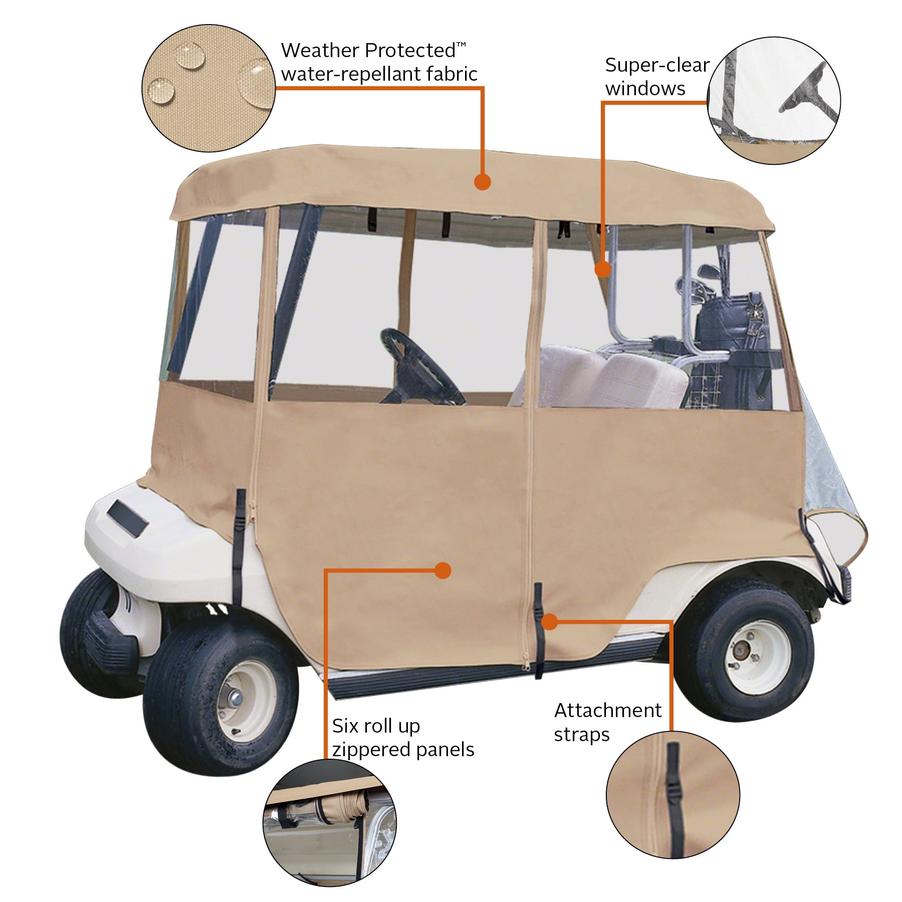 Fits most four-person golf carts 66”L x 53”W Keeps golf carts clean and dry, whether you are storing the golf cart during the winter or using it in warmer weather Fits over roof – just roll down sides when it starts to rain Six zip-open panels roll up and down independently for quick and easy adjustment to any weather condition Super clear window material Carrying case included