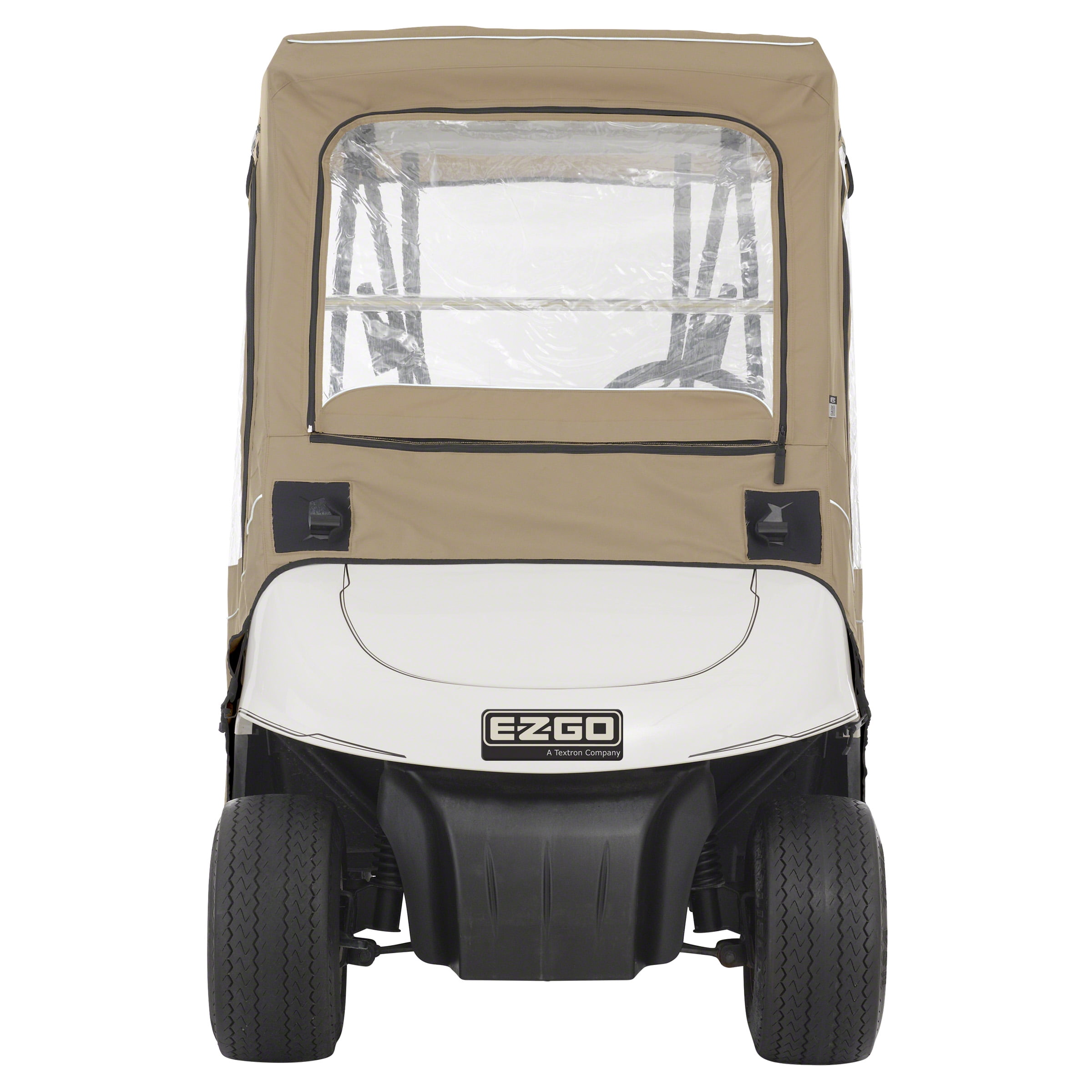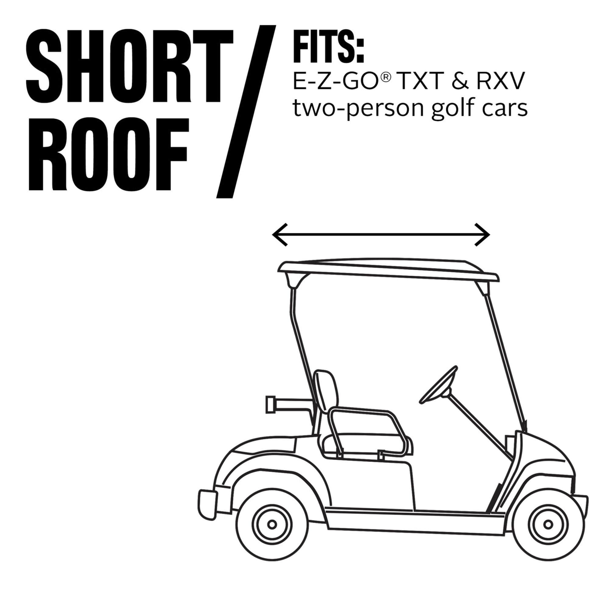 Fits E-Z-Go TXT & RXV two-person golf carts, roof measuring 59”L Two-year limited warranty FadeSafe solution-dyed fabric significantly reduces sun bleaching Full protection against weather and wind Fits over roof and secures with hooks on bottom Quick zip-off windshield stores in front pocket Keeps golf carts clean and dry Super-clear window material with heavy-duty polyester walls and top Zippered doors and panels adjust quickly and easily to any weather condition Doors can be rolled back or completely removed Windshield bumper access points Windshield storage pocket Reflective piping for enhanced safety and visibility Convenient carrying duffel bag with padded handle included