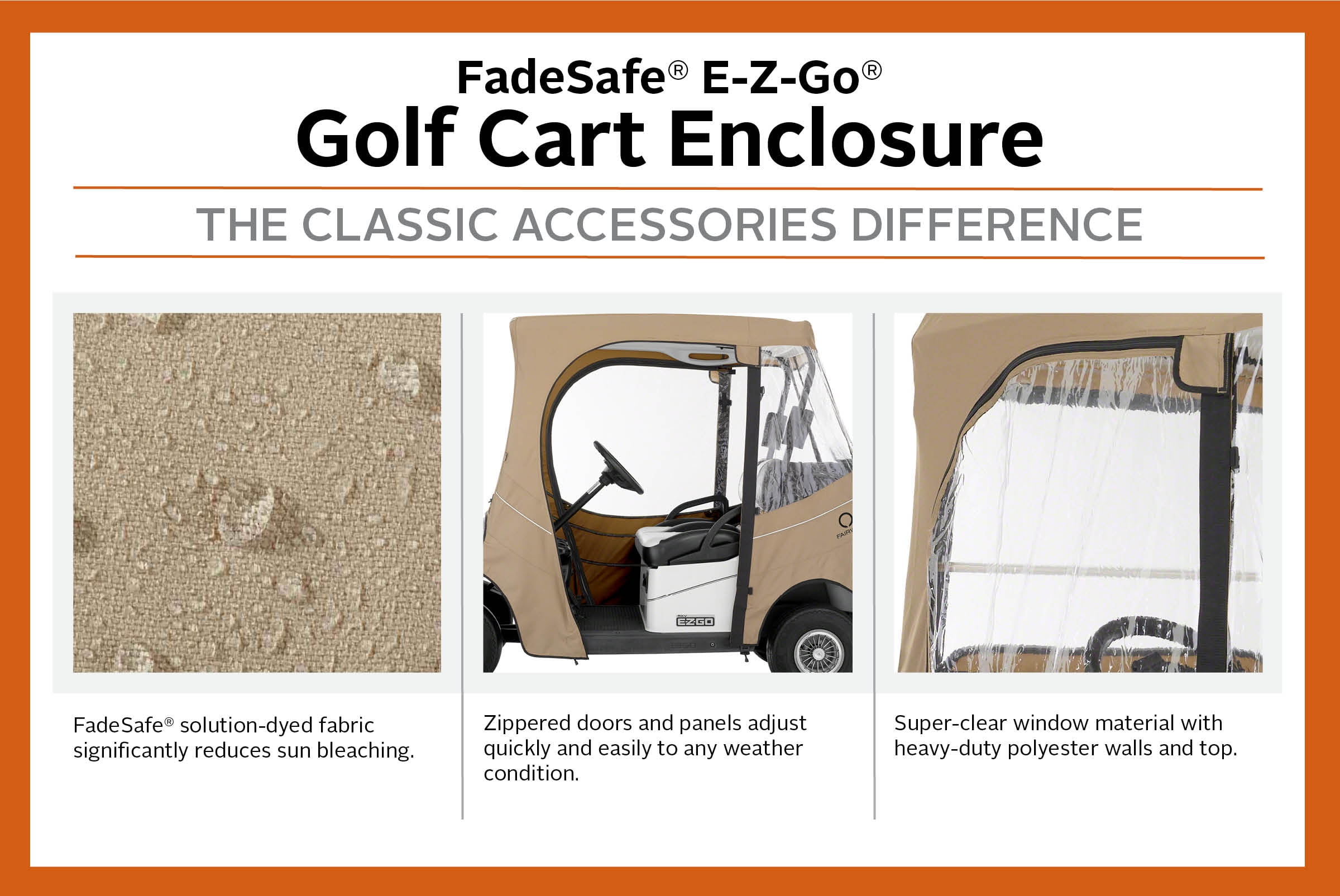The FadeSafe E-Z-Go Golf Cart Enclosure by Classic Accessories provides a custom fit for E-Z-Go two-person golf carts. When you buy a Classic Accessories golf cart cover you are not just getting a cover; you’re also purchasing peace of mind. Not only will you be protected from the elements, but you’ll be protected with the easiest warranty in the industry. If your product fails within the warranty period, look for us online and take advantage of our Hassle-Free warranty program supported by our Kent, WA-based customer service team.