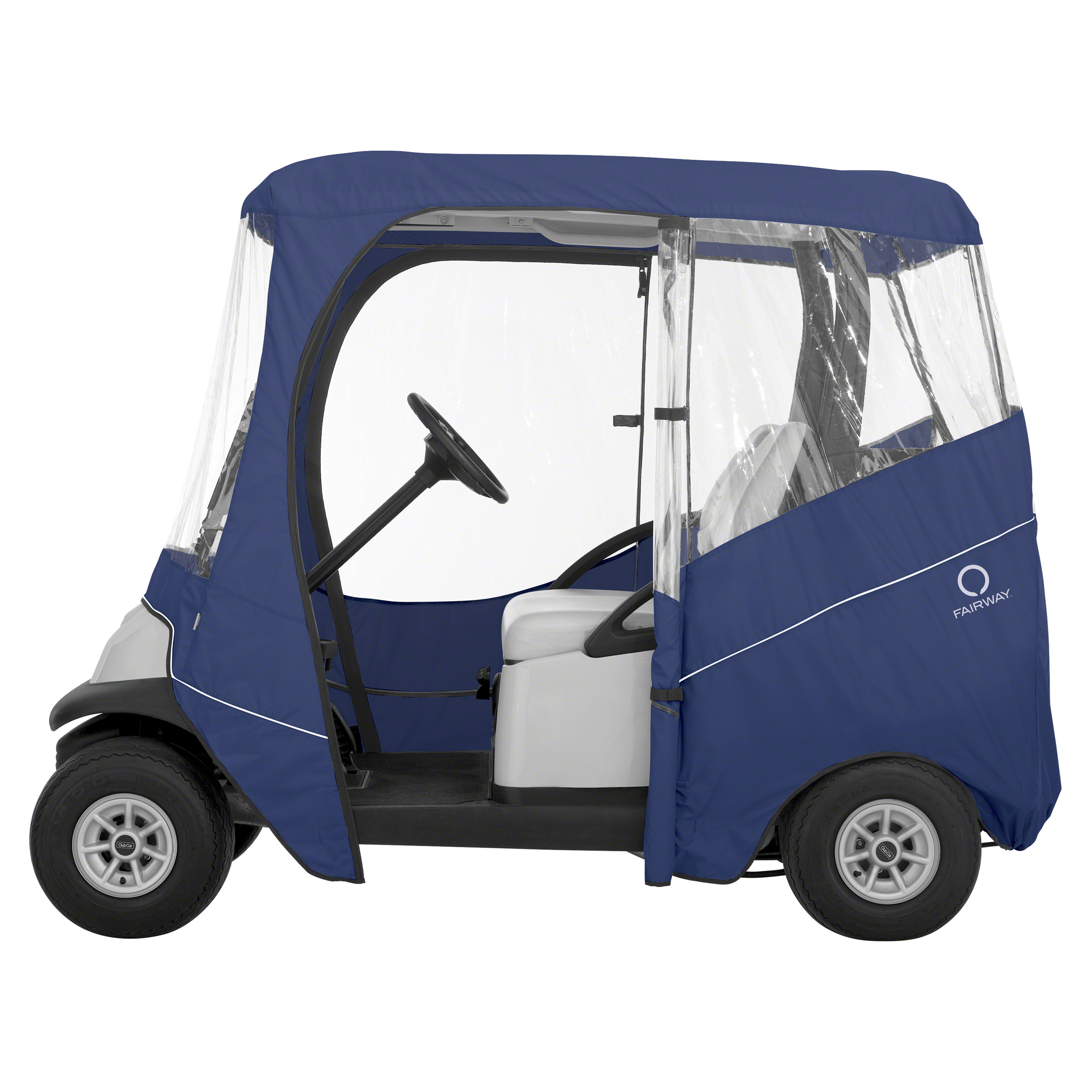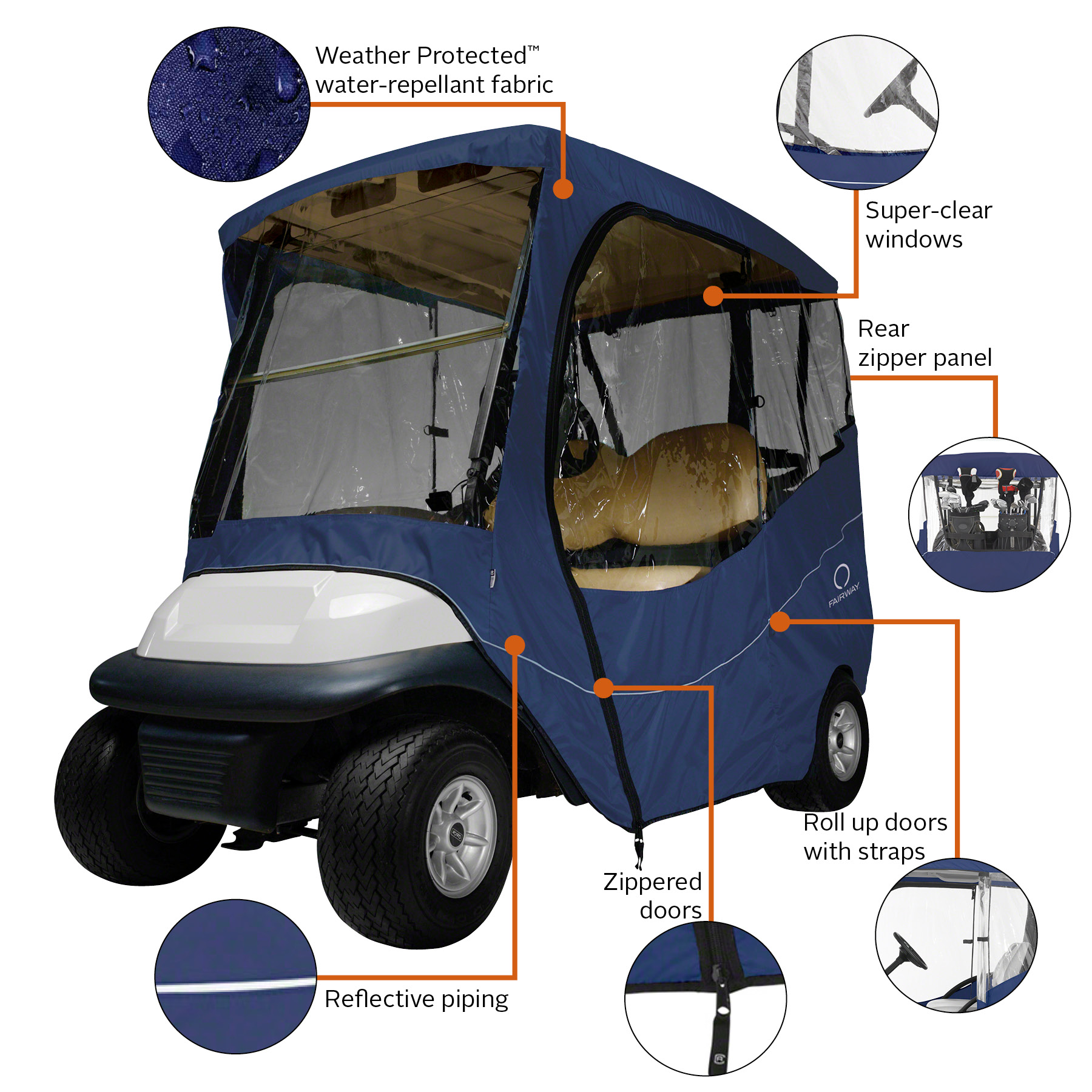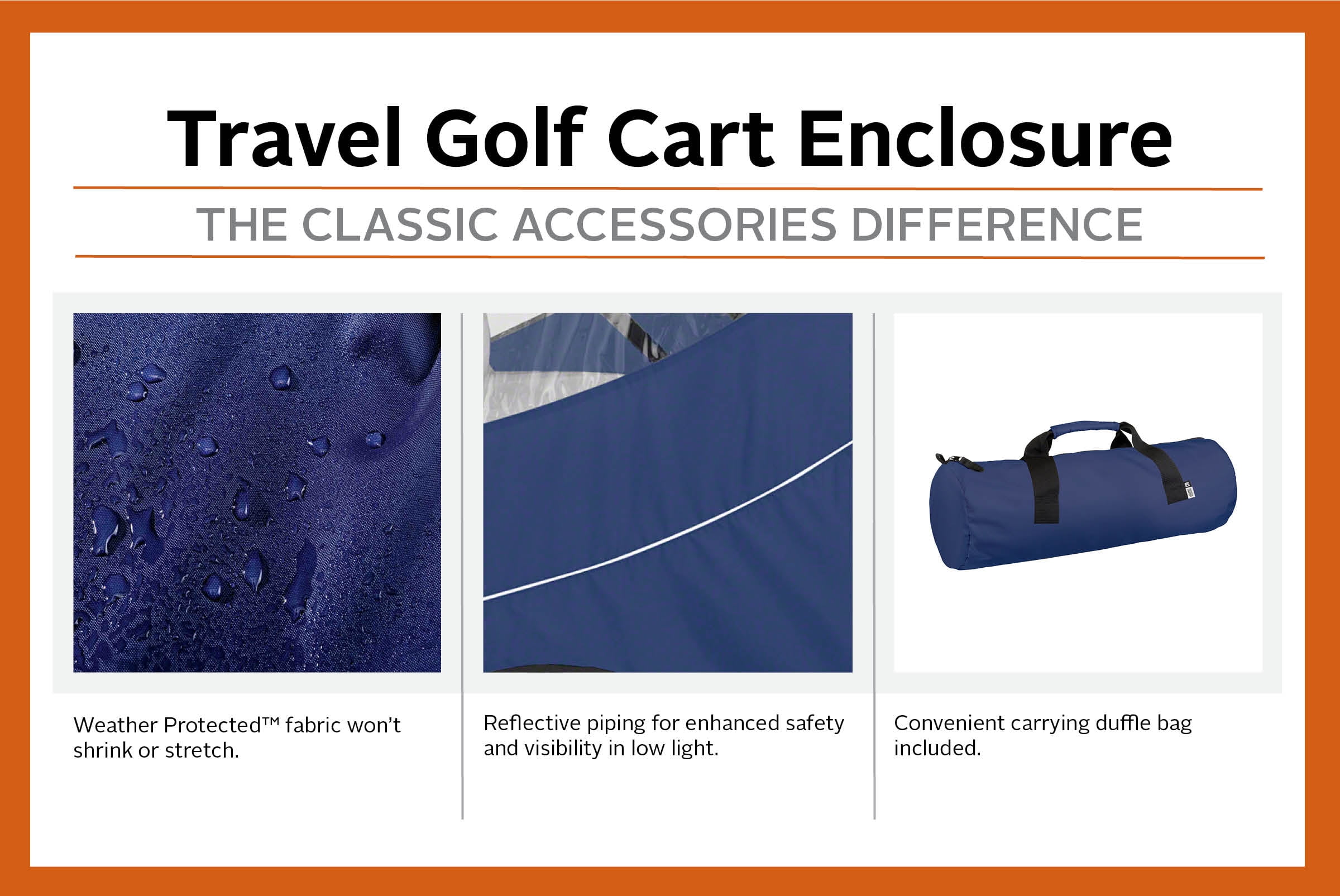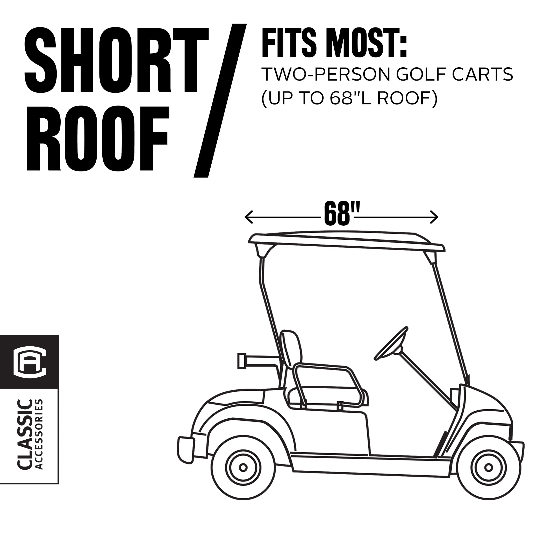 Fits most Yamaha, Club Car, E-Z-Go two-person golf carts, roof measuring 68″L Two-year limited warranty Weather Protected fabric won’t shrink or stretch Fits over roof and secures with hooks on bottom Keeps golf carts clean and dry in storage Super-clear windows Zippered doors open to the side for easy entry Rear panel zips open for easy access to clubs Interior and exterior zipper pulls for quick and easy access to the golf cart Doors and windows roll open and secure with rip-n-grip straps Folds down to compact size for easy travel and storage Reflective piping for enhanced safety and visibility in low light Convenient carrying duffle bag included