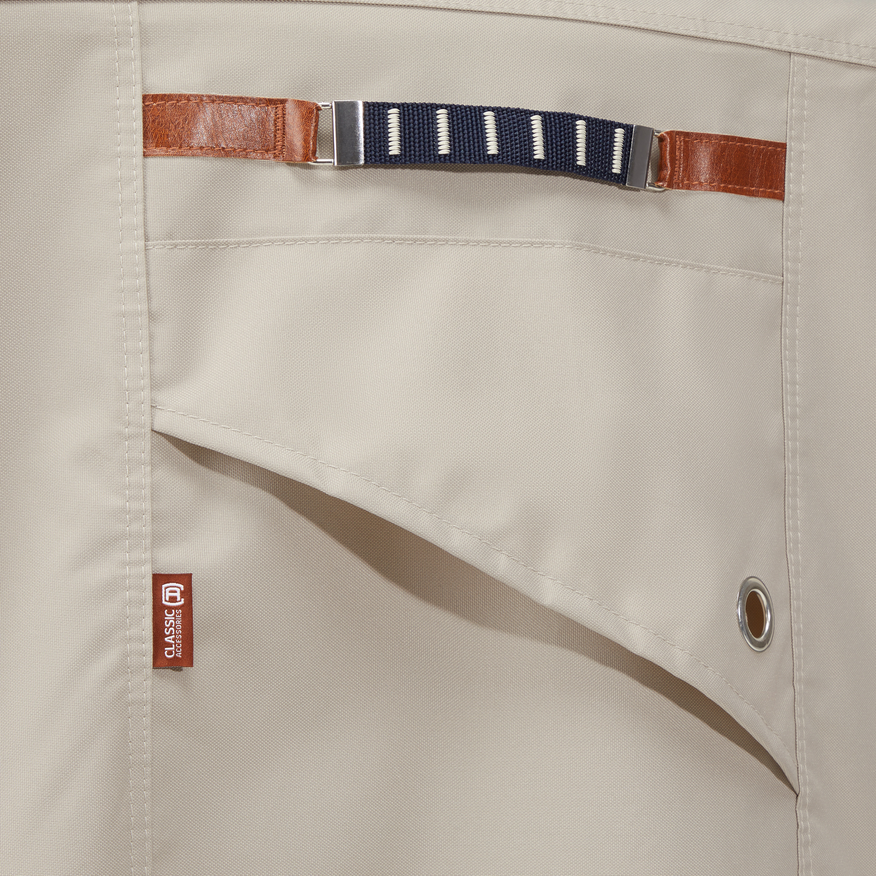 PREMIUM GRILL COVER: Fits barbeque grills up to 58″L x 24″D x 48″H 3-YEAR LIMITED WARRANTY: We provide a Three-Year Limited Warranty on our Mainland patio furniture covers EASY-TO-CLEAN SKIRT WITH NAUTICAL STYLING: Distinctly maritime in design, the neutral top panel is complemented with a lower fabric panel in navy with an embossed, water resistant PVC coating on the exterior SOLID OUTDOOR PROTECTION: Durable fabric limits your furniture’s exposure to the sun, reducing fading, while the water-resistant fabric provides protection from everyday weathering DEPENDABLE COVER FEATURES: Click-close straps in our patented WindLock system snap around legs to secure the cover on windy days; uniquely-stitched handles with faux leather trim simplify handling during cover removal; the sail-inspired air vent provides maximum ventilation and minimizes condensation *Not designed to entirely cover the legs/wheels
