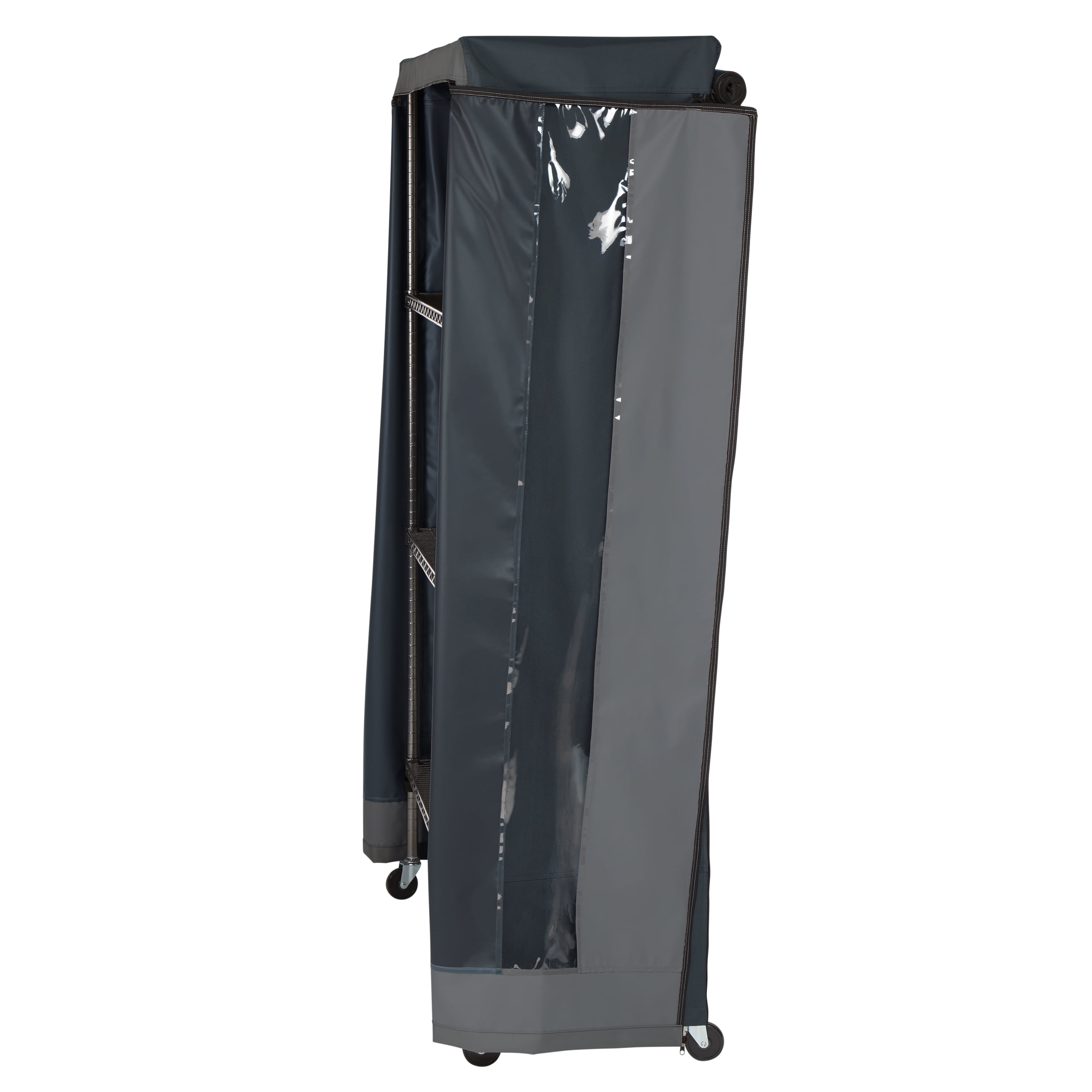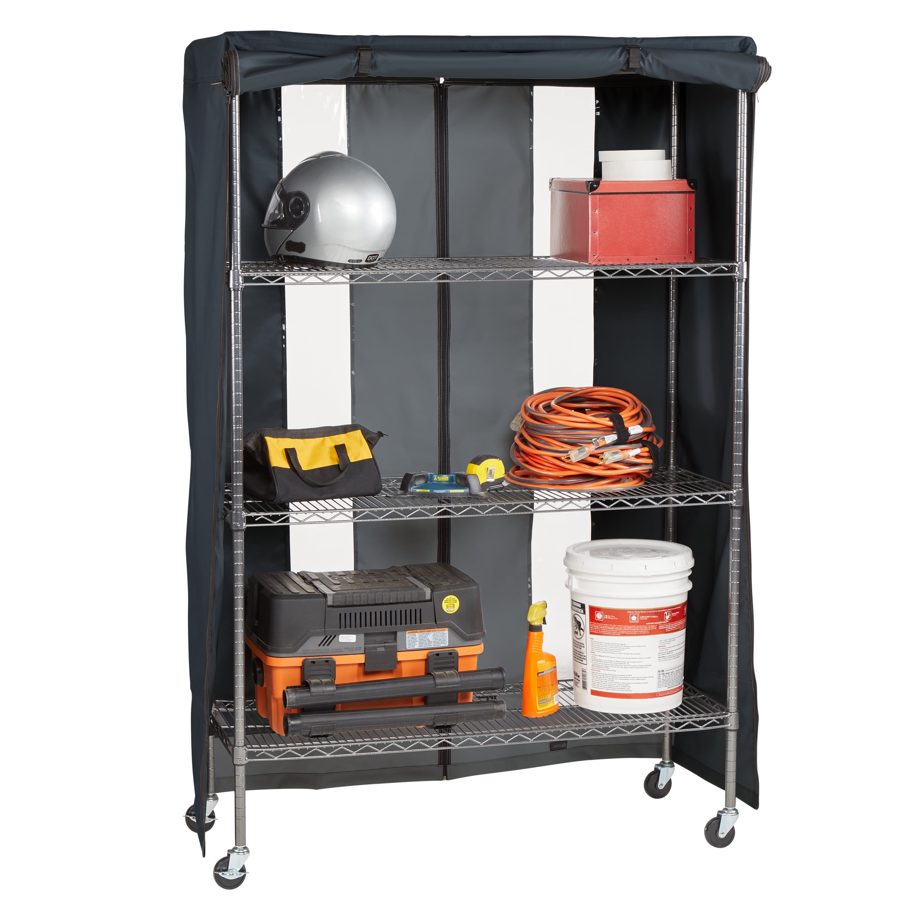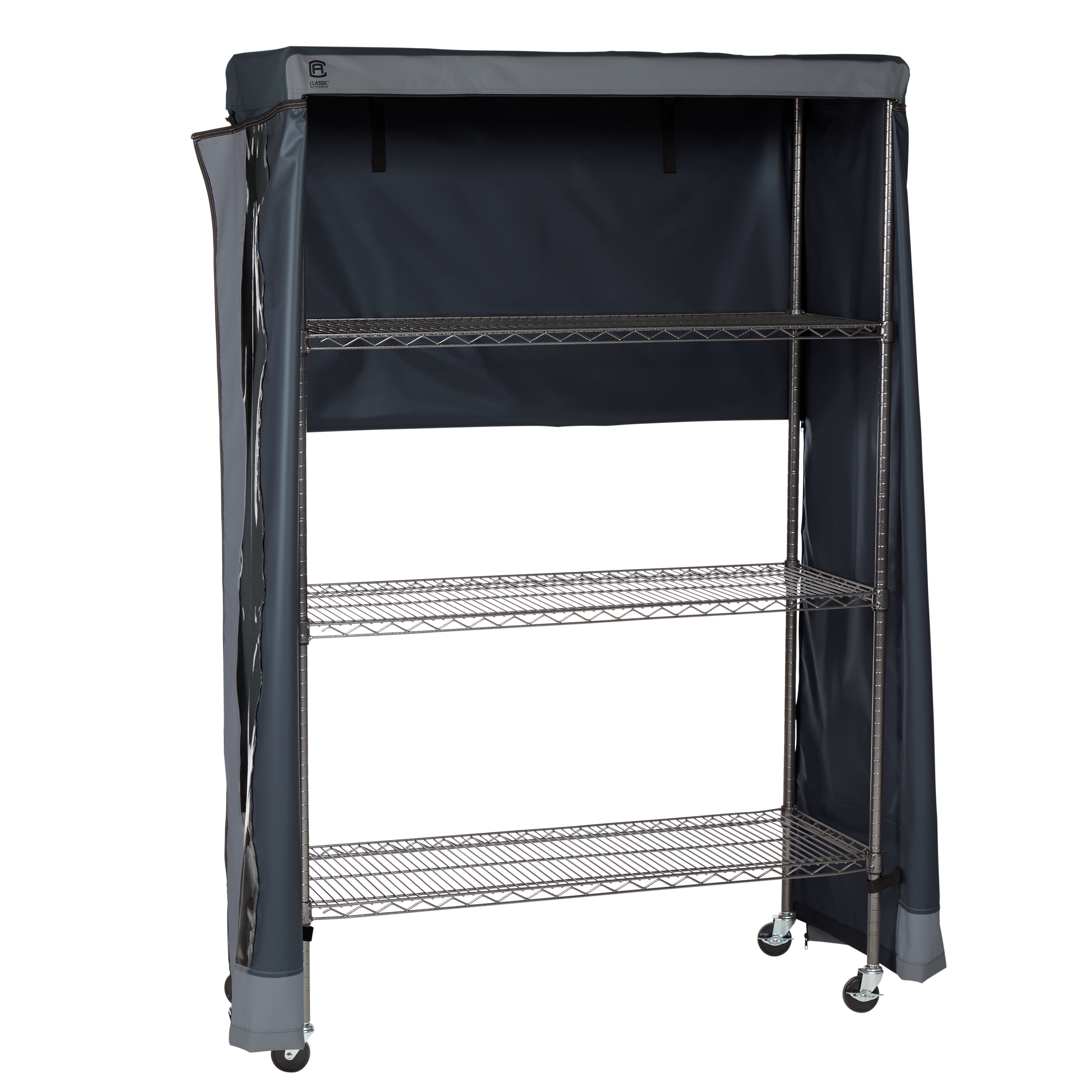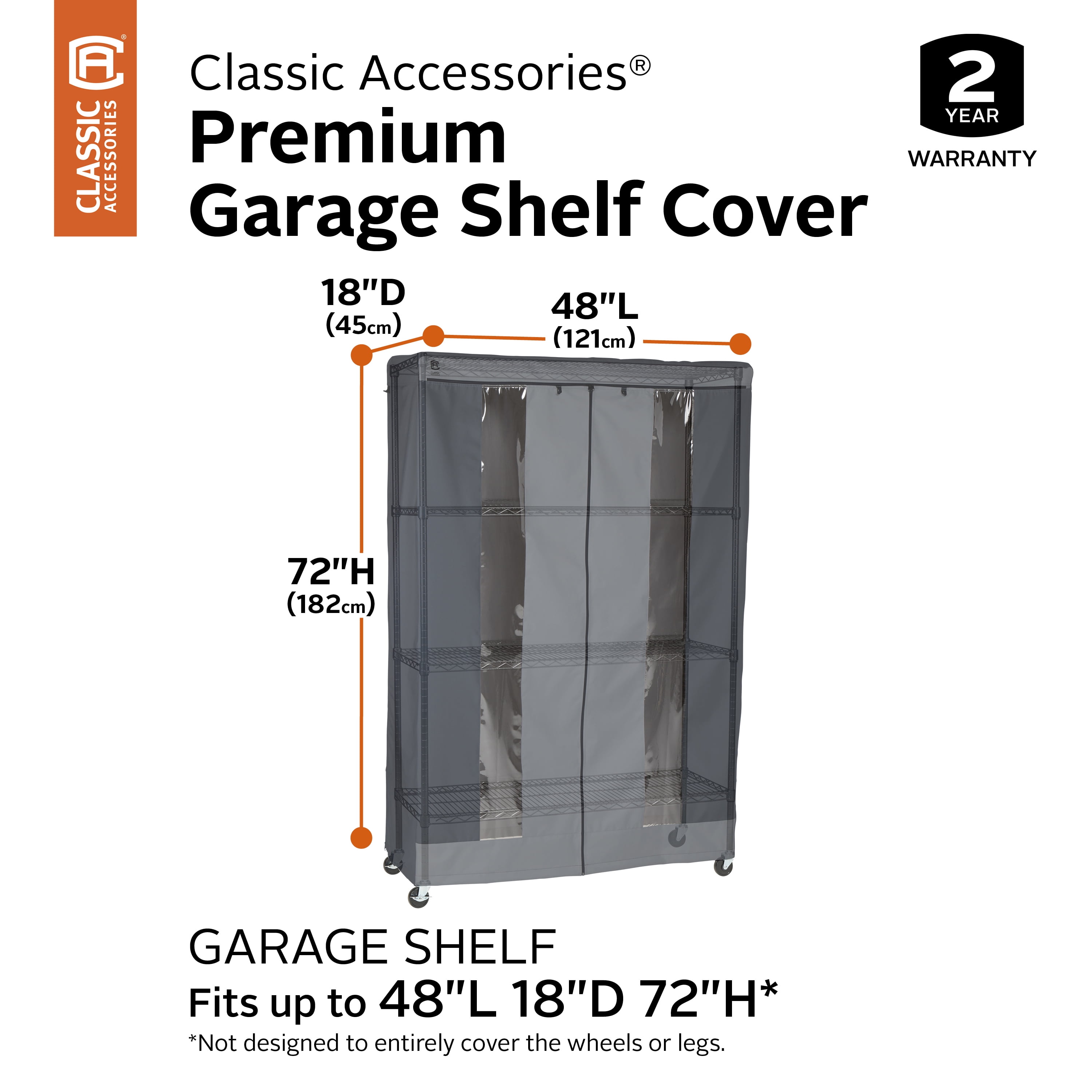 Fits 48″W x 18″D x 72″H Two-year limited warranty Weather-X fabric with water-resistant backing for extra weather and abrasion protection Multiple zippers allow easy access to both front and back of the garage shelf Rip-and-grip straps help secure cover to your shelf and rollup back panel Reinforced top Convenient loops and toggles, allow multiple ways to hold open cover doors Clear PVC windows make interior contents visible *Not designed to entirely cover the wheels or legs