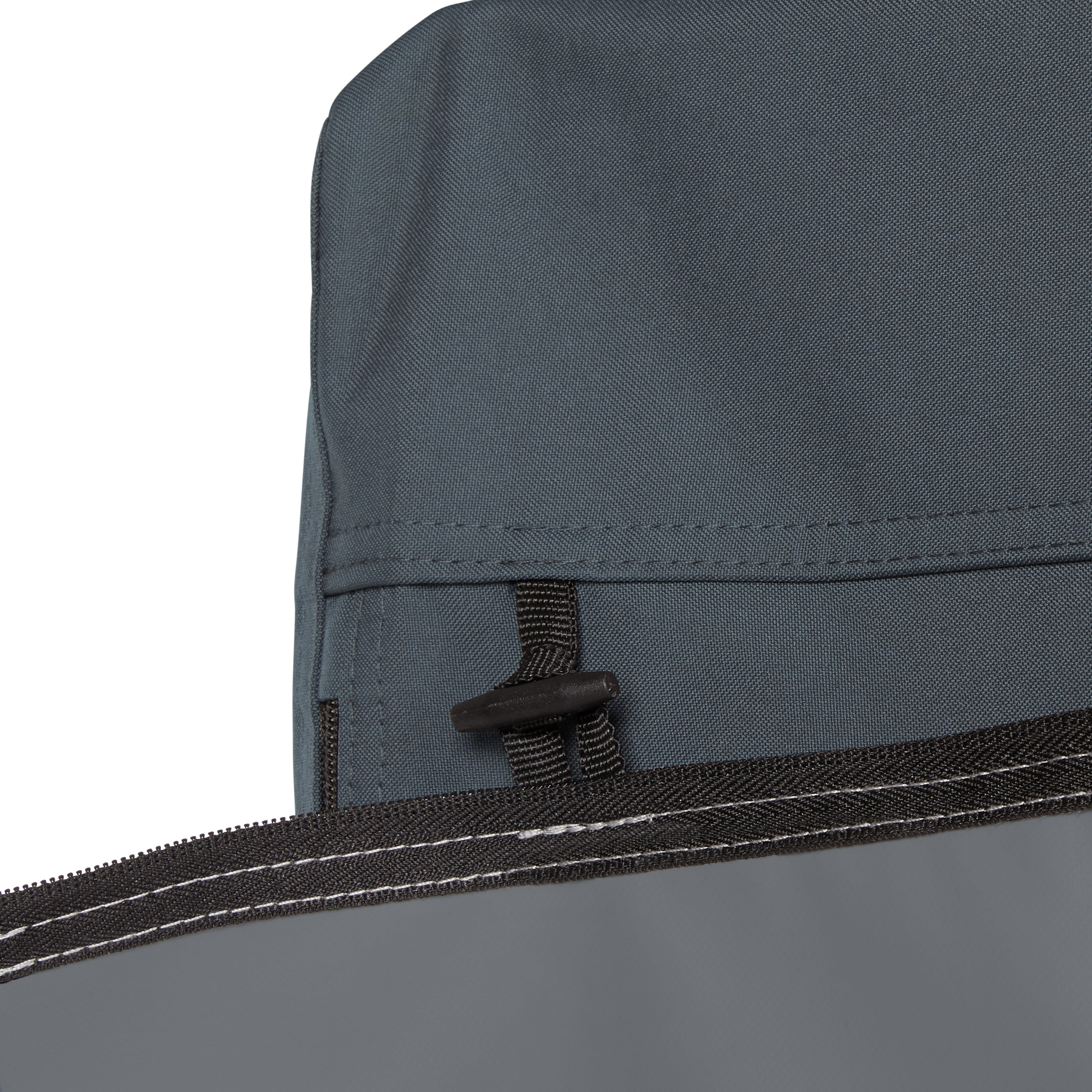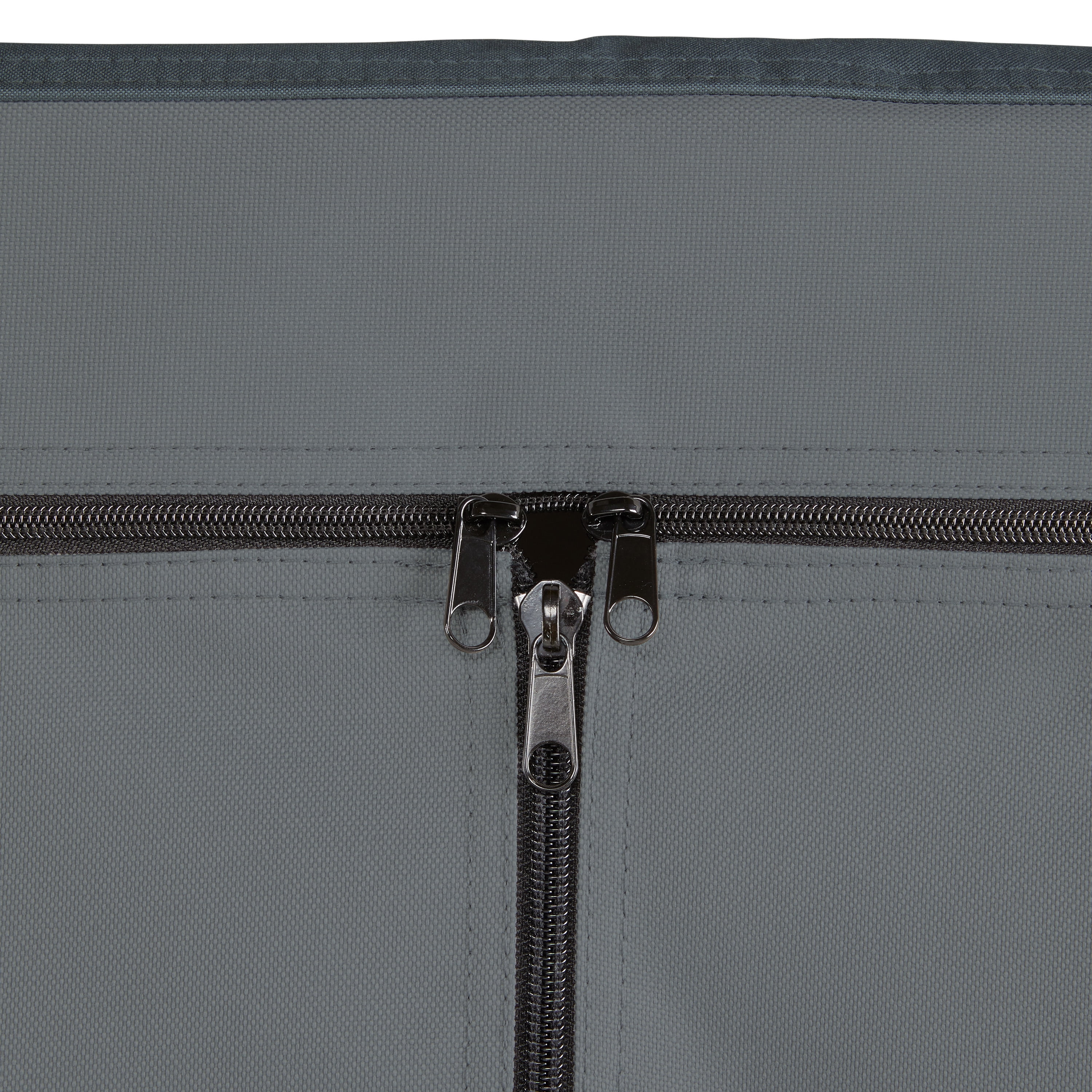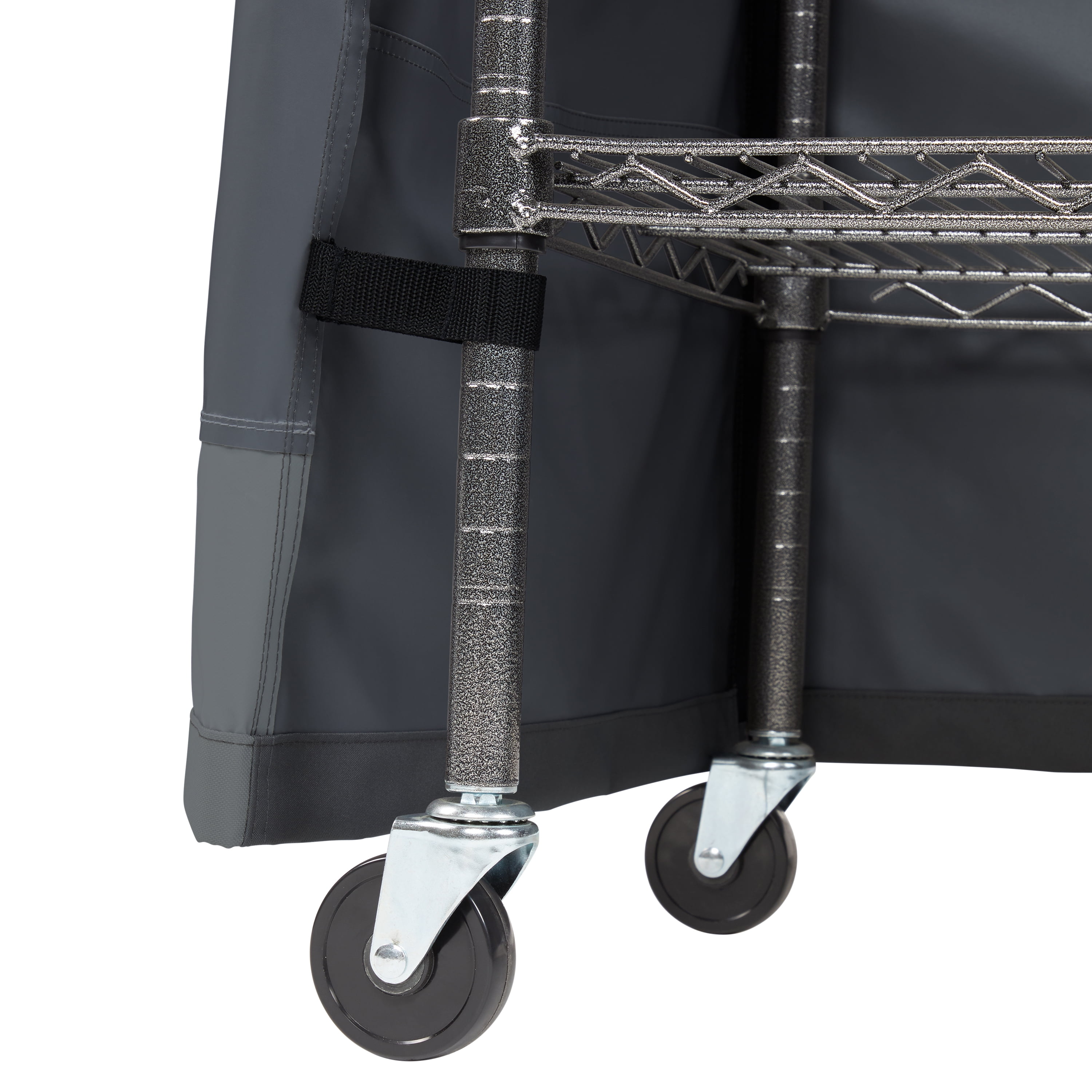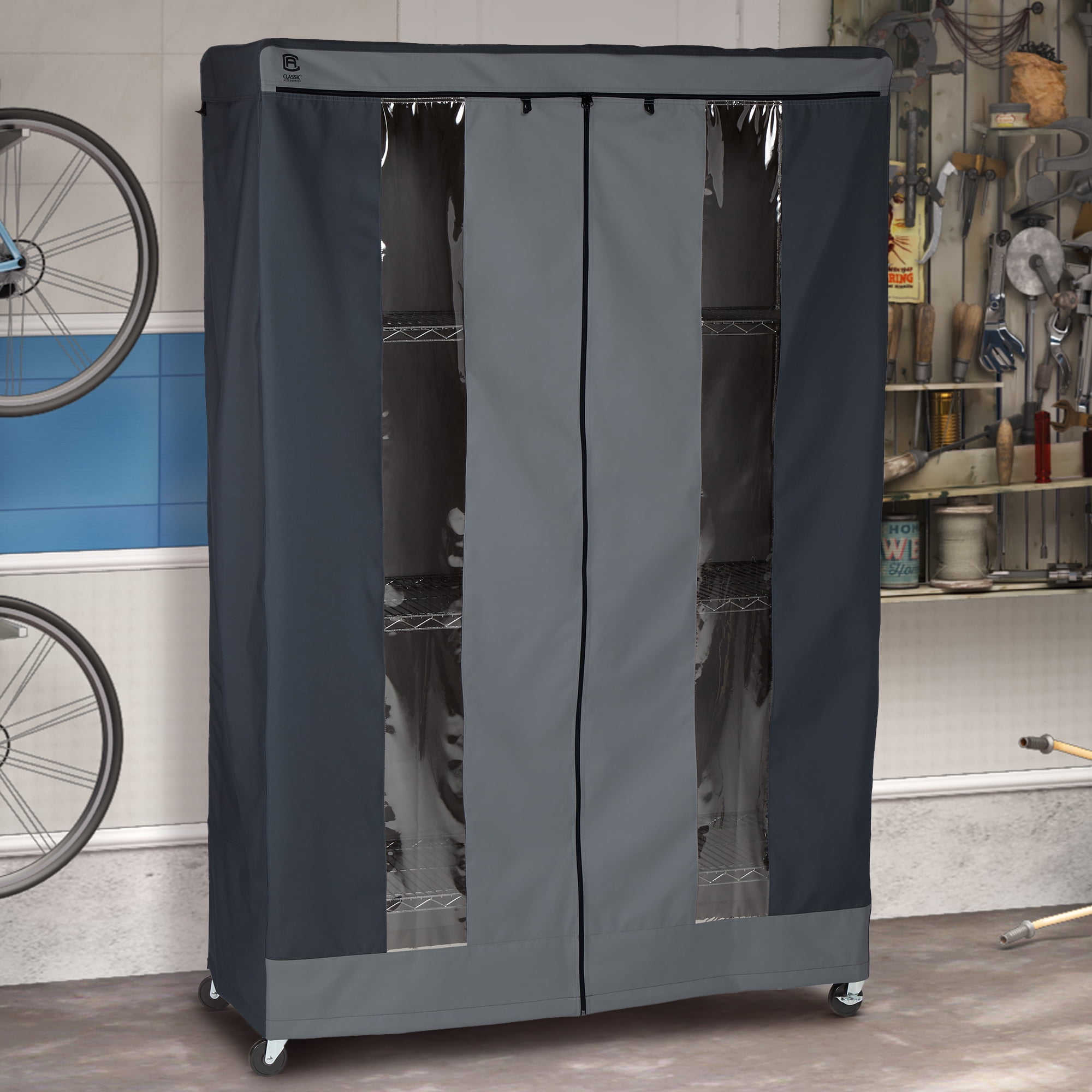 Fits 48″W x 18″D x 72″H Two-year limited warranty Weather-X fabric with water-resistant backing for extra weather and abrasion protection Multiple zippers allow easy access to both front and back of the garage shelf Rip-and-grip straps help secure cover to your shelf and rollup back panel Reinforced top Convenient loops and toggles, allow multiple ways to hold open cover doors Clear PVC windows make interior contents visible *Not designed to entirely cover the wheels or legs