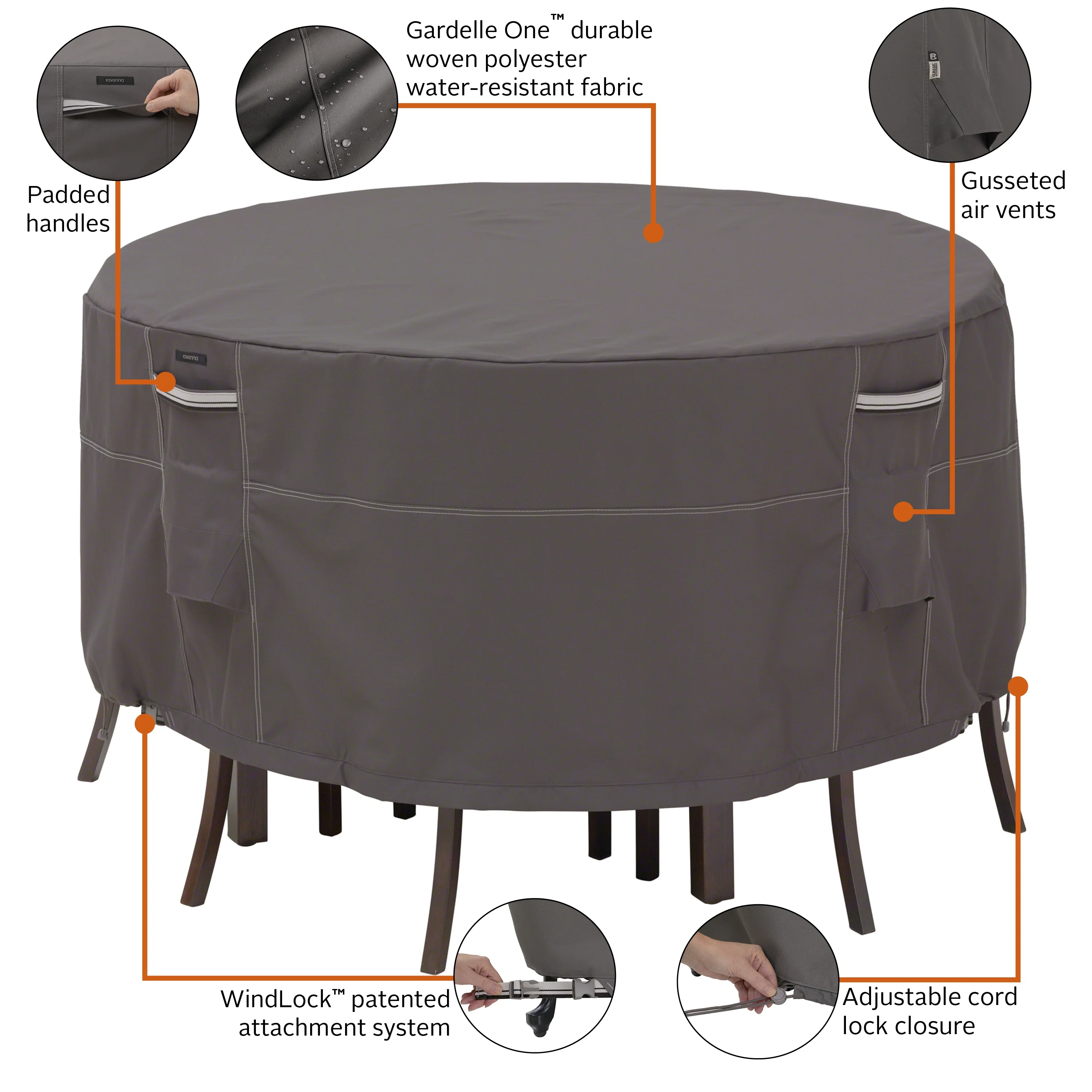 PREMIUM PATIO FURNITURE COVER: Fits round bistro patio tables and 2-4 standard patio chairs 52″DIA x 23″H OUTDOOR FURNITURE COVER with WARRANTY: 2-year limited warranty HEAVY DUTY AND WATER RESISTANT: Gardelle One is a durable woven polyester fabric with an added UV-stabilized coating and a water-resistant laminated 6P Free and EU REACH compliant undercoating CUSTOM FIT OUTDOOR PATIO COVER: Patented WindLock secure attachment system includes an adjustable belted hem with click-close straps that provides a customizable fit with exceptional security in the windiest conditions DURABLE COVER WITH ADVANCED FEATURES: Reinforced padded handles make removal easy while air vents keep weather out providing maximum ventilation and minimum condensation RAVENNA OUTDOOR PATIO SET COVERS: Protect your entire patio furniture collection with premium Ravenna covers Not designed to entirely cover the wheels or legs *Please refer to your furnitures care instructions as some finishes, sealants or coatings could react to PVC backed covers. To reduce this possibility, the use of a support pole (sold separately) is recommended to elevate the cover. Our covers are not intended for furniture made of concrete Image color may vary slightly from product color due to variances in screens/displays. Dark Taupe is a neutral, warm grey that appears brown in certain lighting situations