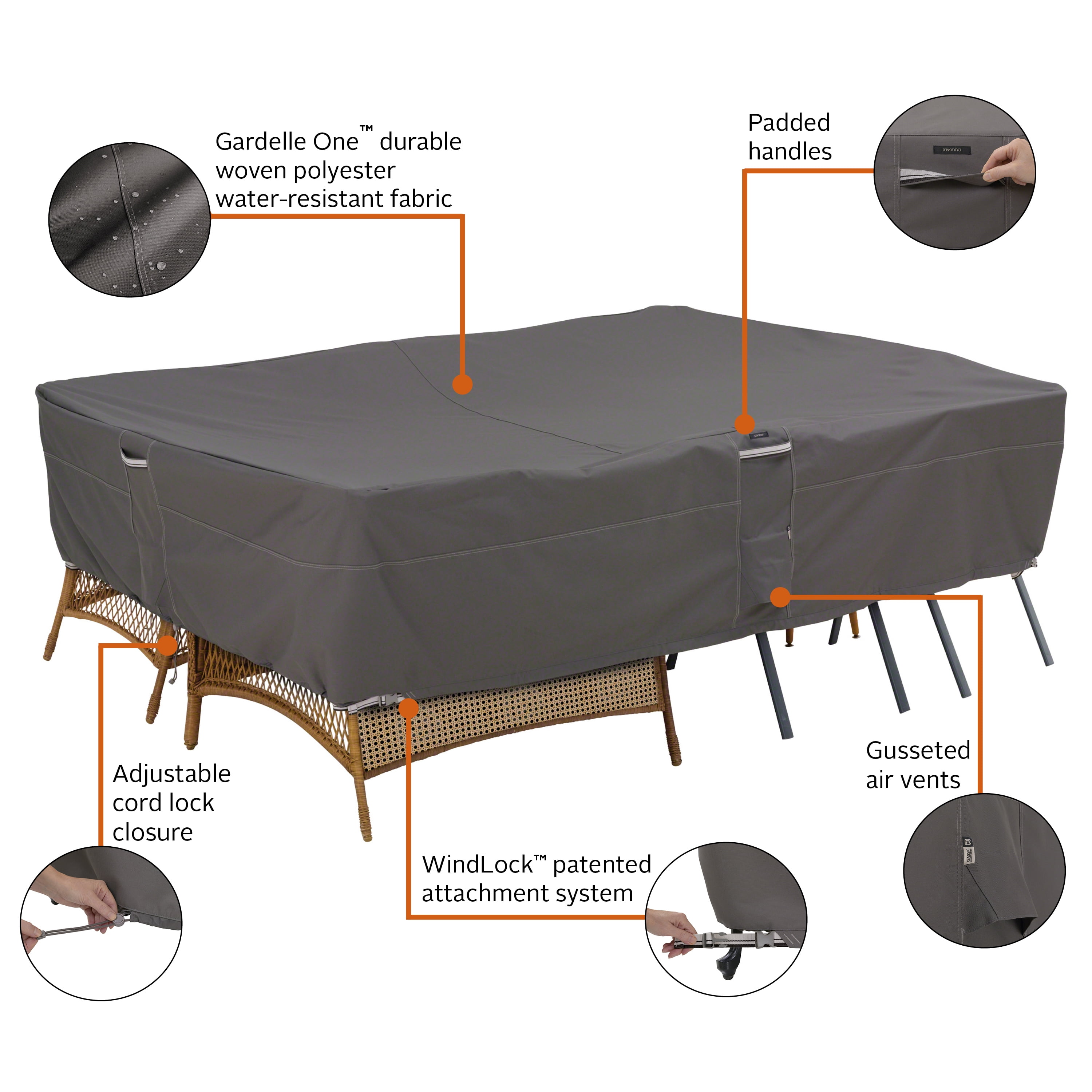OUTDOOR FURNITURE COVER with WARRANTY: Two-year limited warranty HEAVY DUTY AND WATER RESISTANT: Gardelle One™ is a durable woven polyester fabric with an added UV-stabilized coating and a water-resistant laminated 6P Free and EU REACH compliant undercoating CUSTOM FIT OUTDOOR PATIO COVER: Patented WindLock™ secure attachment system includes an adjustable belted hem with click-close straps that provides a customizable fit with exceptional security in the windiest conditions DURABLE COVER WITH ADVANCED FEATURES: Reinforced padded handles make removal easy while air vents keep weather out providing maximum ventilation and minimum condensation RAVENNA OUTDOOR PATIO SET COVERS: Protect your entire patio furniture collection with premium Ravenna covers Not designed to entirely cover the wheels or legs *Please refer to your furniture’s care instructions as some finishes, sealants or coatings could react to PVC backed covers. To reduce this possibility, the use of a support pole (sold separately) is recommended to elevate the cover. Our covers are not intended for furniture made of concrete