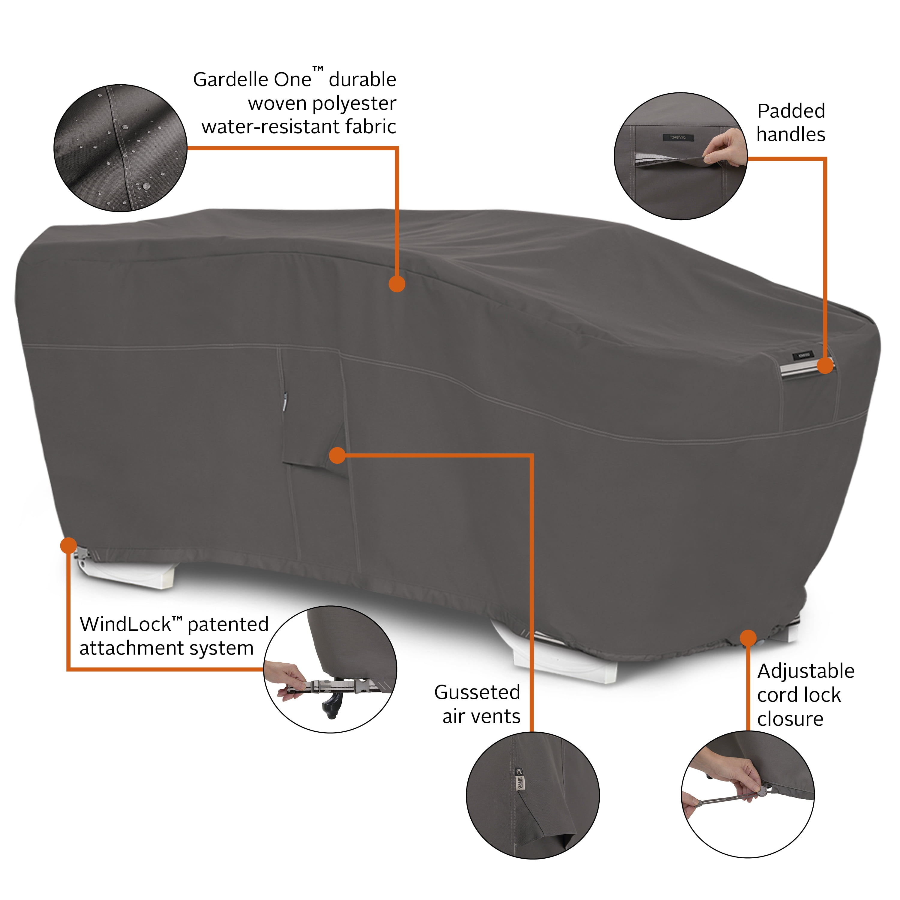 OUTDOOR FURNITURE COVER with WARRANTY: Two-year limited warranty HEAVY DUTY AND WATER RESISTANT: Gardelle One™ is a durable woven polyester fabric with an added UV-stabilized coating and a water-resistant laminated backing CUSTOM FIT OUTDOOR PATIO COVER: Patented WindLock™ secure attachment system includes an adjustable belted hem with click-close straps that provides a customizable fit with exceptional security in the windiest conditions DURABLE COVER WITH ADVANCED FEATURES: Reinforced padded handles make removal easy while air vents keep weather out providing maximum ventilation and minimum condensation RAVENNA OUTDOOR PATIO SET COVERS: Protect your entire patio furniture collection with premium Ravenna covers Not designed to entirely cover the wheels or legs Image color may vary slightly from product color due to variances in screens/displays. Dark Taupe is a neutral, warm grey that appears brown in certain lighting situations
