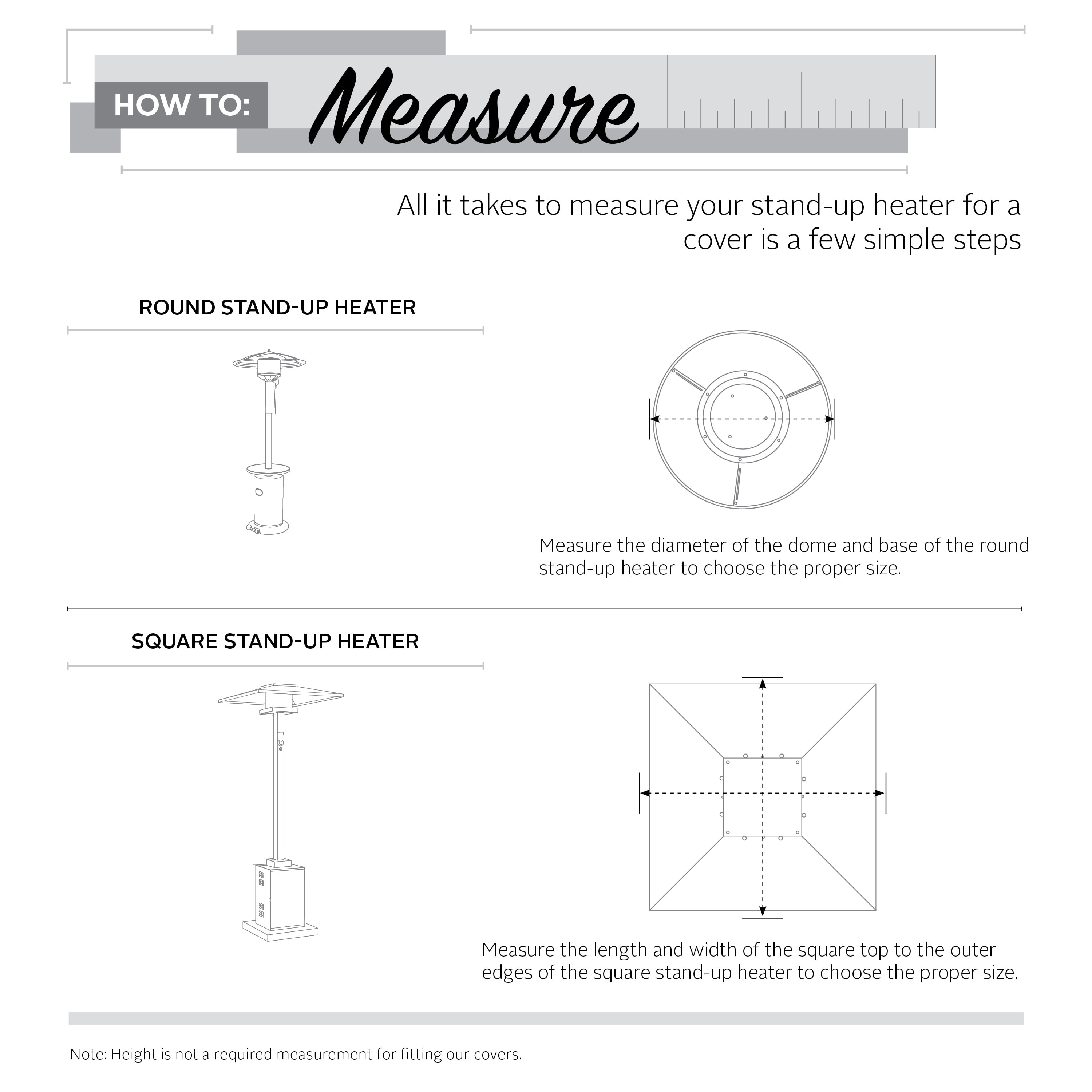 Fits stand-up outdoor heaters 34”DIA (dome) x 18.5”DIA (base) x 95”H HEAVY DUTY AND WATER RESISTANT: Gardelle One is a durable woven polyester fabric with an added UV-stabilized coating and a weatherproof laminated undercoating OUTDOOR FURNITURE COVER WITH WARRANTY: Two-year limited warranty SECURE FIT: Elastic hem cords for a snug fit and rip-and-grip straps help keep the zipper tight when closed DURABLE COVER WITH ADVANCED FEATURES: Air vents keep weather out providing maximum ventilation and minimum condensation; dual zippers for easy handling COLLECT THE SET: Protect your entire outdoor furniture collection with premium Ravenna covers Image color may vary slightly from product color due to variances in screens/displays. Dark Taupe is a neutral, warm grey that appears brown in certain lighting situations Not designed to entirely cover the wheels or legs