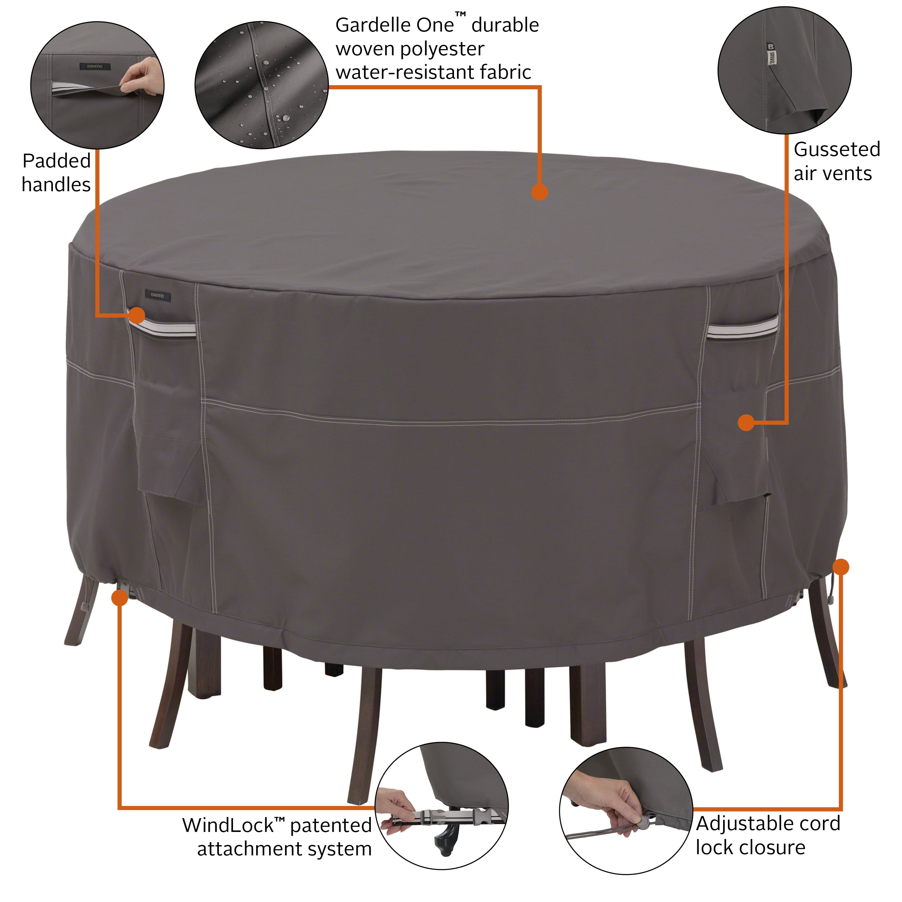 PREMIUM PATIO FURNITURE COVER: Fits tall round patio tables and 4 tall patio chairs 60″DIA x 29″H OUTDOOR FURNITURE COVER with WARRANTY: 2-year limited warranty HEAVY DUTY AND WATER RESISTANT: Gardelle One is a durable woven polyester fabric with an added UV-stabilized coating and a water-resistant laminated backing CUSTOM FIT OUTDOOR PATIO COVER: Patented WindLock secure attachment system includes an adjustable belted hem with click-close straps that provides a customizable fit with exceptional security in the windiest conditions DURABLE COVER WITH ADVANCED FEATURES: Reinforced padded handles make removal easy while air vents keep weather out providing maximum ventilation and minimum condensation RAVENNA OUTDOOR PATIO SET COVERS: Protect your entire patio furniture collection with premium Ravenna covers Not designed to entirely cover the wheels or legs *Please refer to your furnitures care instructions as some finishes, sealants or coatings could react to PVC backed covers. To reduce this possibility, the use of a support pole (sold separately) is recommended to elevate the cover. Our covers are not intended for furniture made of concrete Image color may vary slightly from product color due to variances in screens/displays. Dark Taupe is a neutral, warm grey that appears brown in certain lighting situations