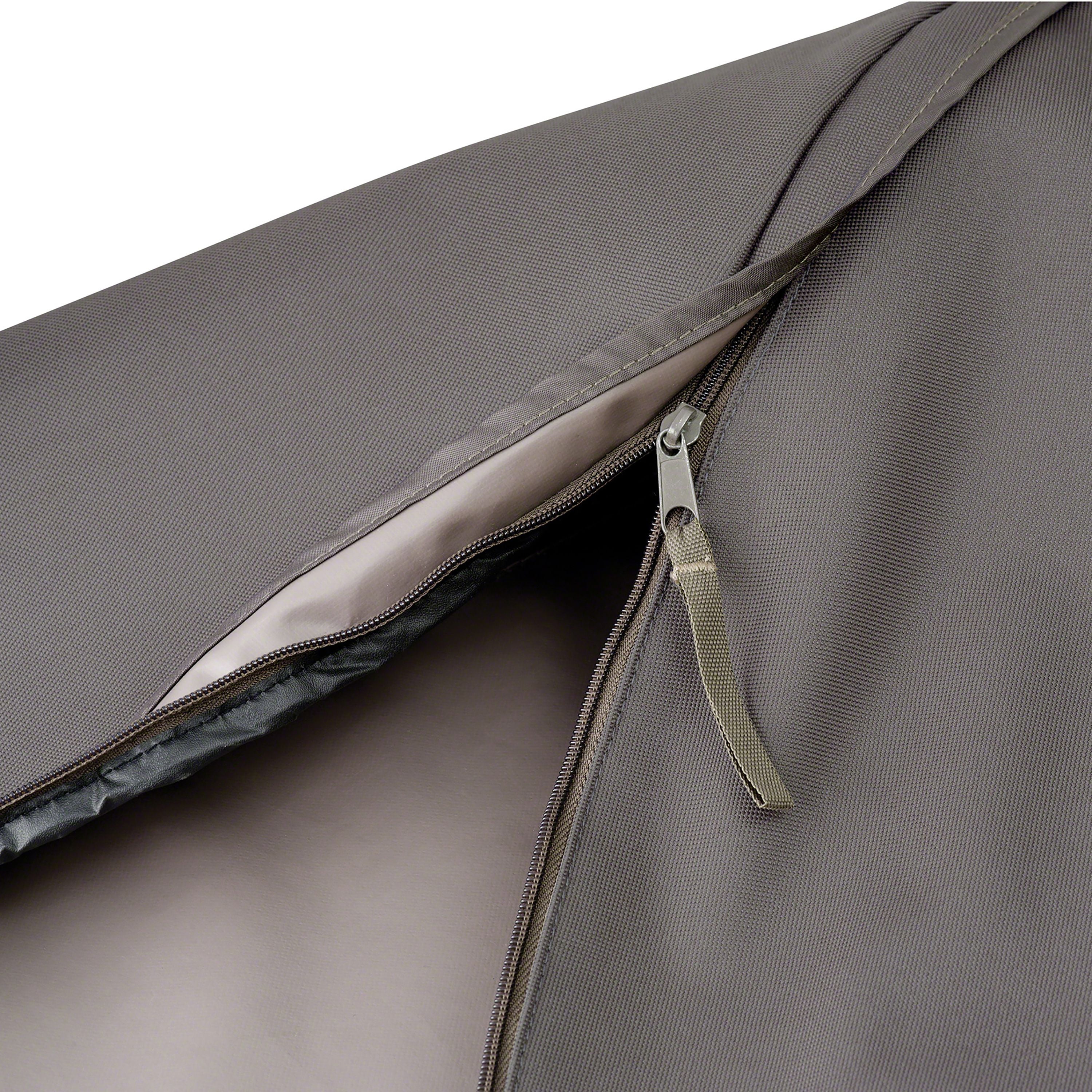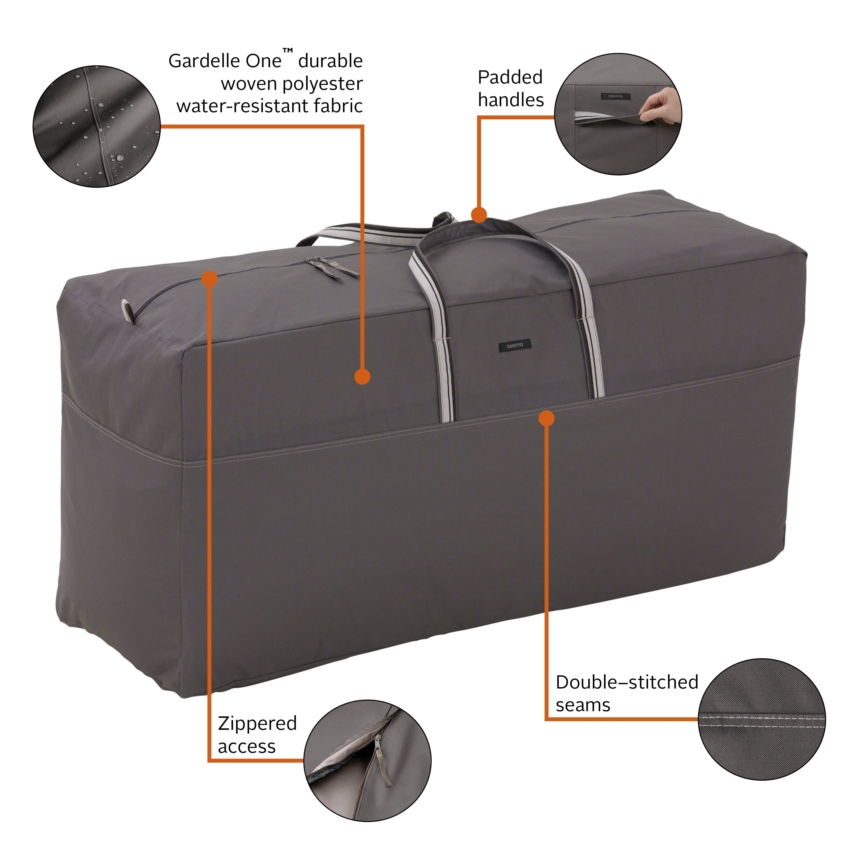 HEAVY DUTY AND WATER RESISTANT: Gardelle One™ is a durable woven polyester fabric with an added UV-stabilized coating and a water-resistant laminated undercoating CUSTOM FIT OUTDOOR PATIO COVER: Water-resistant backing keeps your cushions safe while double-stitched seams add strength and a stylish accent CONVENIENT DETAILS: Reinforced padded handles provide comfort when carrying while dual zippers provide convenient access from either side of storage bag RAVENNA OUTDOOR PATIO SET COVERS: Protect your entire patio furniture collection with premium Ravenna covers Image color may vary slightly from product color due to variances in screens/displays. Dark Taupe is a neutral, warm grey that appears brown in certain lighting situations