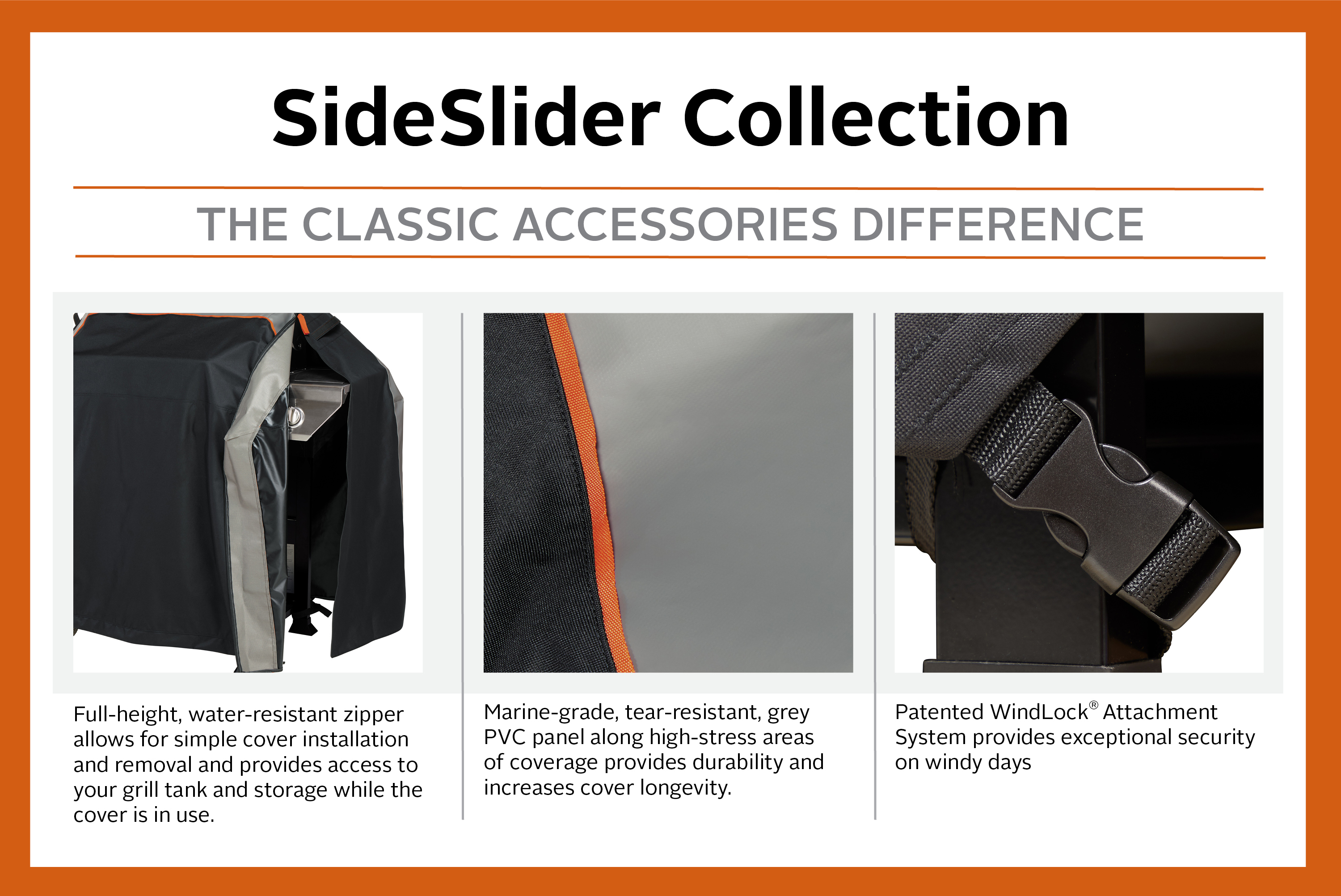 Simplify your grilling experience with the SideSlider BBQ Grill Cover, by Classic Accessories. SideSlider Grill Covers are as simple as you need them to be, in functionality and design. Experience the ease of use; a full-height zipper allows for an easy, slide off removal and slide on installation. A pop of flame orange highlights the edge of the marine-grade reinforcement panel that aligns with your grill’s sharper corners to reduce wear and tear during use. Made of durable materials and designed to last, SideSlider is an investment we want you to feel confident in. We know you have your hands full with other things and your grill cover is not something you should have to worry about. Grill covers are meant to protect your grill, not cause frustration. SideSlider is meant to relieve the burden of taking excessive effort and time to cover your grill; when your grill has cooled, you are ready to enjoy other things. Meant to be quick and efficient, the SideSlider collection is a cover built for anyone to use with relative ease, so you can spend less time on covering and grill maintenance, and do more, to Uncover More Time Outdoors. With all of our products, we hope to help you have a great time in your yard and home. If you have any question or concerns, or if your patio grill cover fails within the warranty period, look for us online and take advantage of our Hassle-Free warranty program supported by our US-based customer service team.