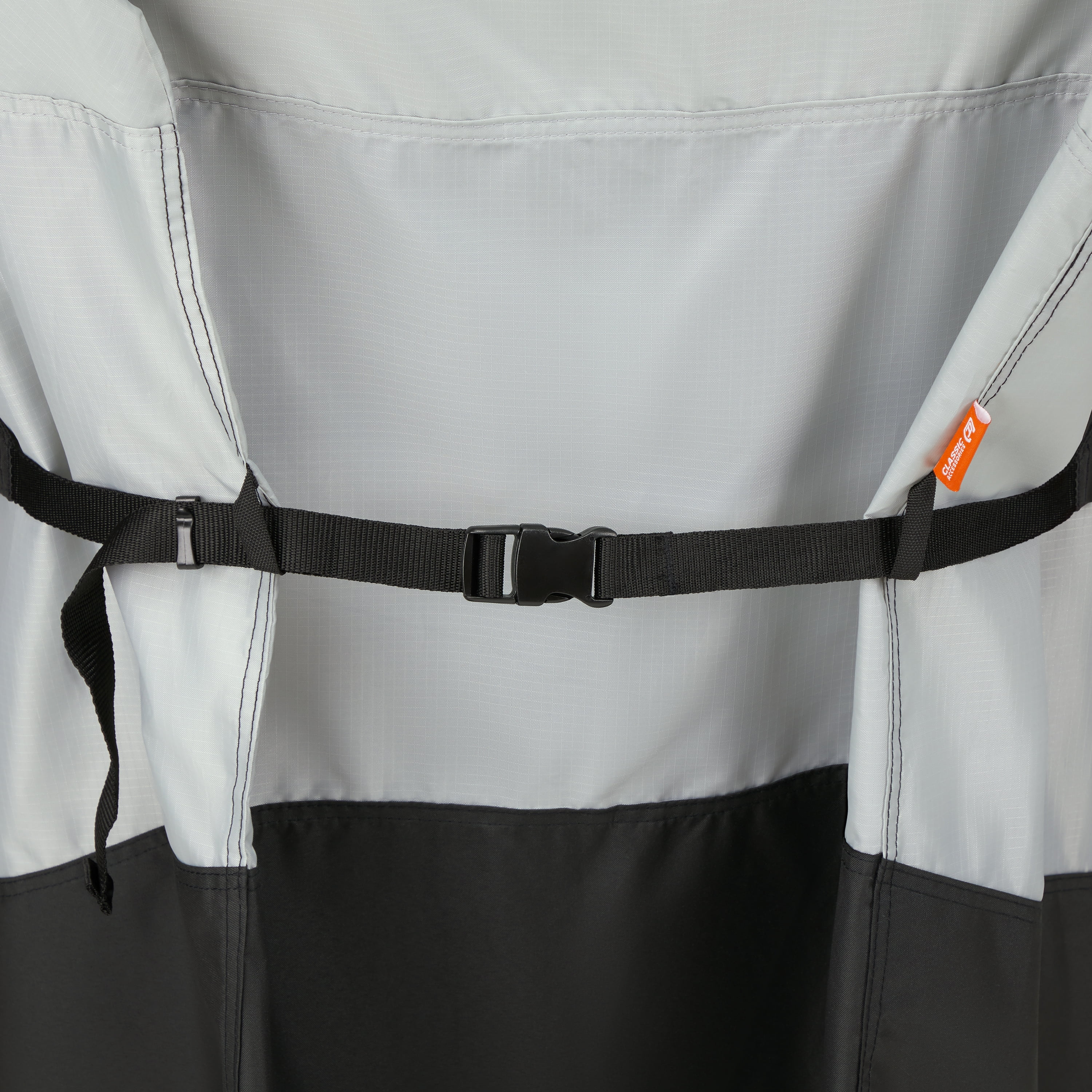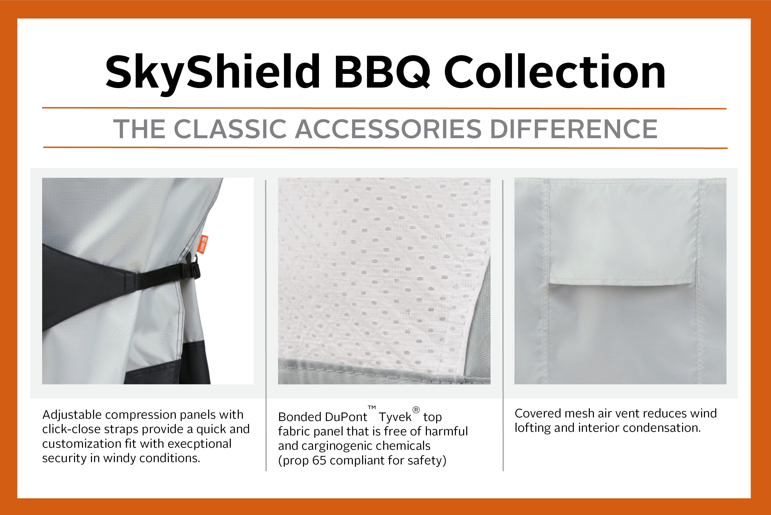 The SkyShield BBQ Grill Cover by Classic Accessories provides bonded tear resistant DuPont Tyvek lightweight fabric at the top panel of the cover that is UV and water resistant and easy to wipe clean. Double layered, PermaPRO ripstop fabric at top side panels protects cover from damage due to sharp table edges and a heavy duty lower black polyester panel is ideal for high wear areas. When you buy a Classic Accessories grill or patio furniture cover you are not just getting a cover; you are also purchasing peace of mind. Not only will your grill and patio furniture be protected from the elements, but you will be protected with the easiest warranty in the industry. If your product fails within the warranty period, look for us online and take advantage of our Hassle-Free warranty program supported by our US-based customer service team.