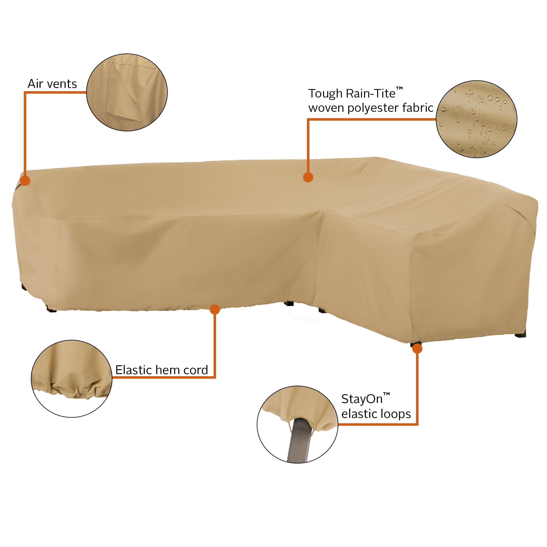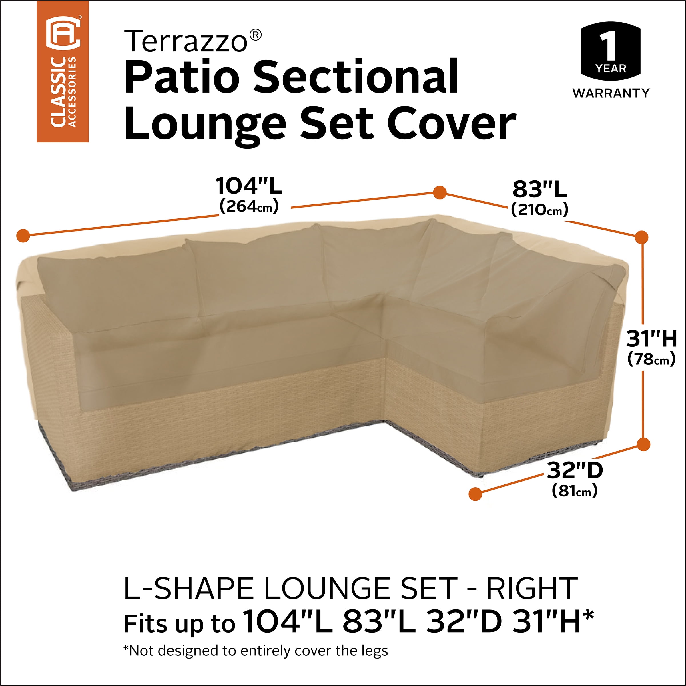 OUTDOOR PATIO COVER: Fits right facing L-shaped sectional lounge sets 104″L (left side), 83″L (right side) x 32″D x 31″H OUTDOOR FURNITURE COVERS with WARRANTY: One-year limited warranty ALL WEATHER PROTECTION: Tough Rain-Tite fabric protects against rain, snow, sun and dirt and won’t crack in cold weather CUSTOM FIT OUTDOOR TABLE COVER: Convenient StayOn elastic loops fit over legs to keep the cover protecting your patio furniture during high winds and breezy conditions DURABLE PATIO COVER WITH ADVANCED FEATURES: Air vents reduce inside condensation and wind lofting while an elastic cord in the bottom hem provides a fast and custom-like fit TERRAZZO OUTDOOR PATIO SET COVERS: Protect your entire patio furniture collection with premium Terrazzo covers Not designed to entirely cover the wheels or legs