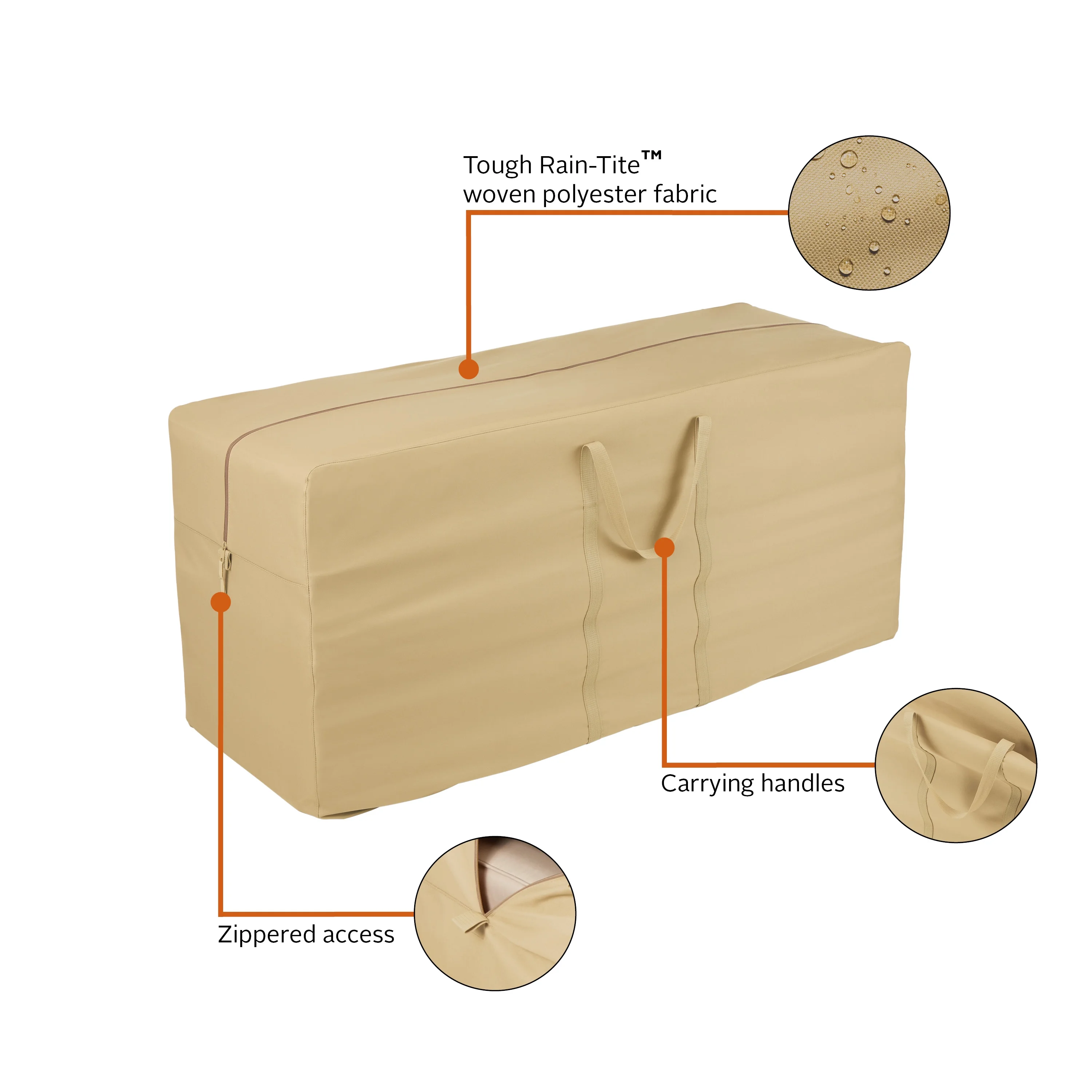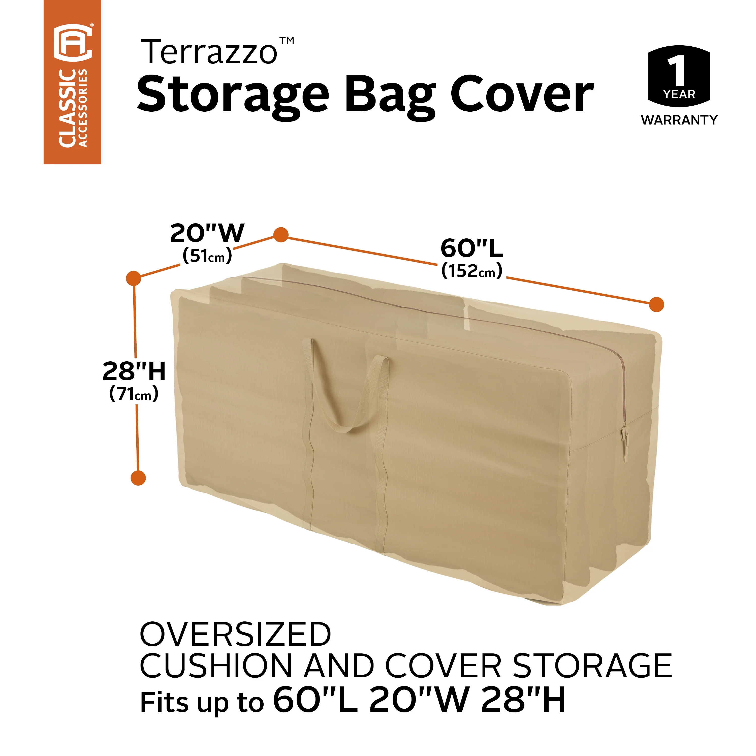 TERRAZZO PATIO COVERS: Protect your entire patio furniture collection with premium Terrazzo covers DURABLE PATIO FURNITURE COVER: Holds patio cushions and covers 60″L x 20″W x 28″H OUTDOOR COVER WARRANTY: One-year limited warranty ALL WEATHER PROTECTION: Extend the life of your patio furniture with our tough Rain-Tite fabric, protecting it from all weather conditions against rain, snow, sun and dirt and won’t crack in cold weather DURABLE COVER FEATURES: Zipper provides easy access to contents and carrying handles for easy transportation Spot clean with warm water; air dry only