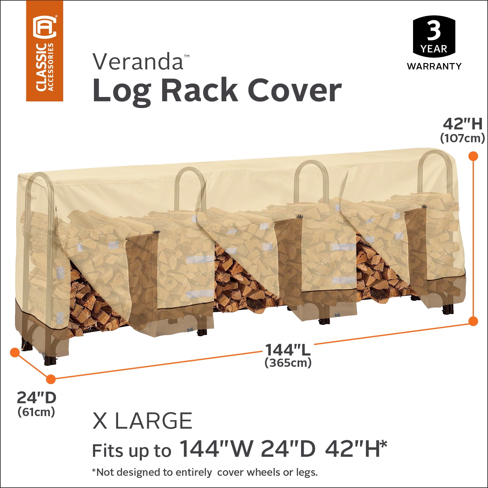 Fits 12′ log racks 144″W x 24″D x 42″H Three-year limited warranty Gardelle fabric features an elegant water-repellent fabric top with a protective water resistant 6P-Free laminated undercoating and a protective dark splash guard skirt Click-close straps snap at front to secure cover on the windiest days Rip-and-grip panel closure Elastic hem cord for a tight and custom-like fit Air vents reduce inside condensation and wind lofting Improved reinforced corners to prevent tearing Padded handles for easy fitting and removal Not designed to entirely cover the wheels or legs