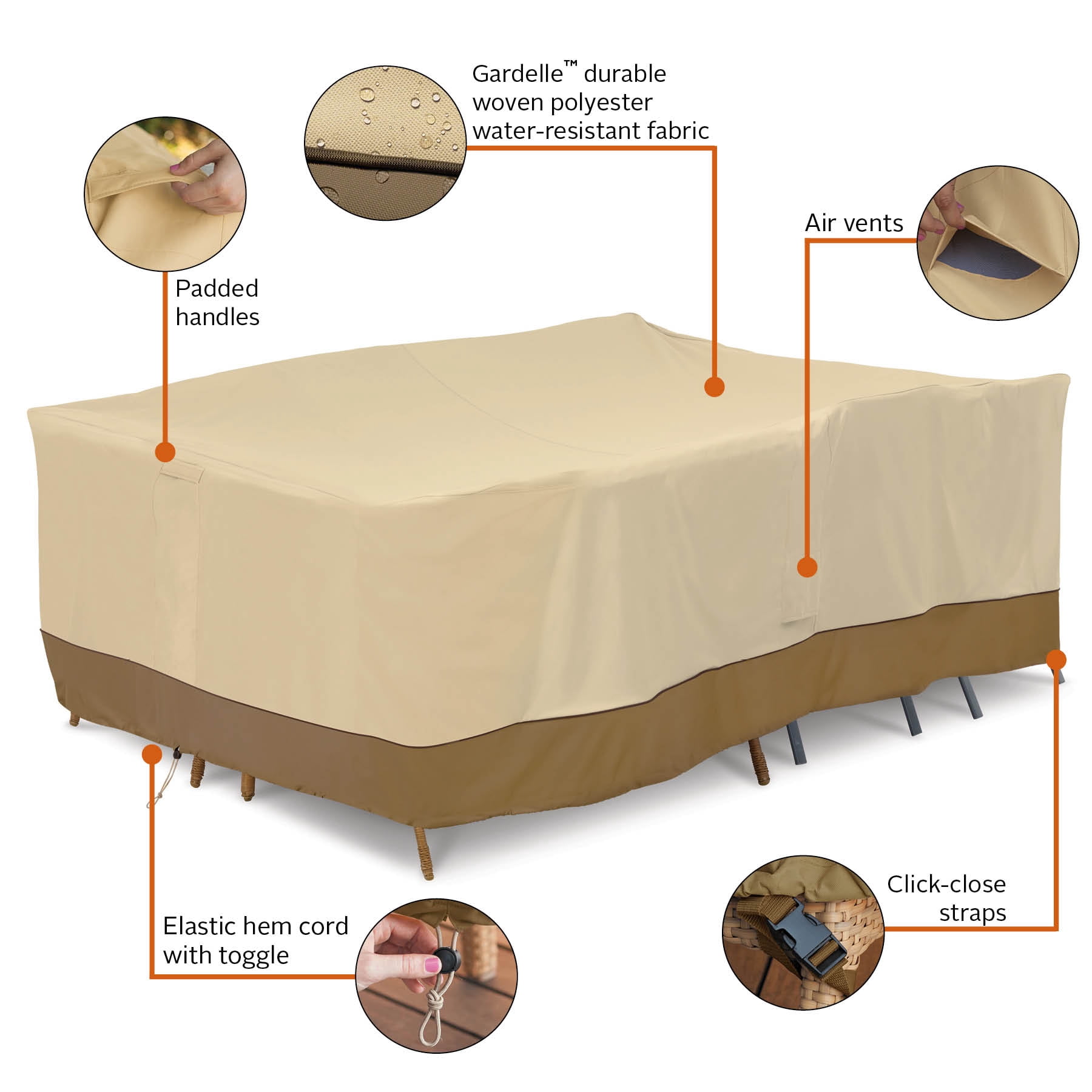 PREMIUM PATIO COVER: Fits conversation sets/furniture groupings 100″L x 70″D x 35″H PATIO COVER with WARRANTY: Three-year limited warranty and California Prop 65 compliance for health and safety WEATHERPROOF AND WATER-RESISTANT: Gardelle fabric features an elegant water-repellent fabric top with a protective water resistant 6P-Free laminated undercoating and a protective dark splash guard skirt CUSTOM FIT OUTDOOR PATIO COVER: Click-Close straps snap around wheels/legs to secure cover on windy days while an elastic hem cord with toggle allows adjustment for a tight and custom-like fit DURABLE COVER WITH ADVANCED FEATURES: Air vents reduce condensation and wind lofting, padded handles for easy fitting and removal Not designed to entirely cover the wheels or legs