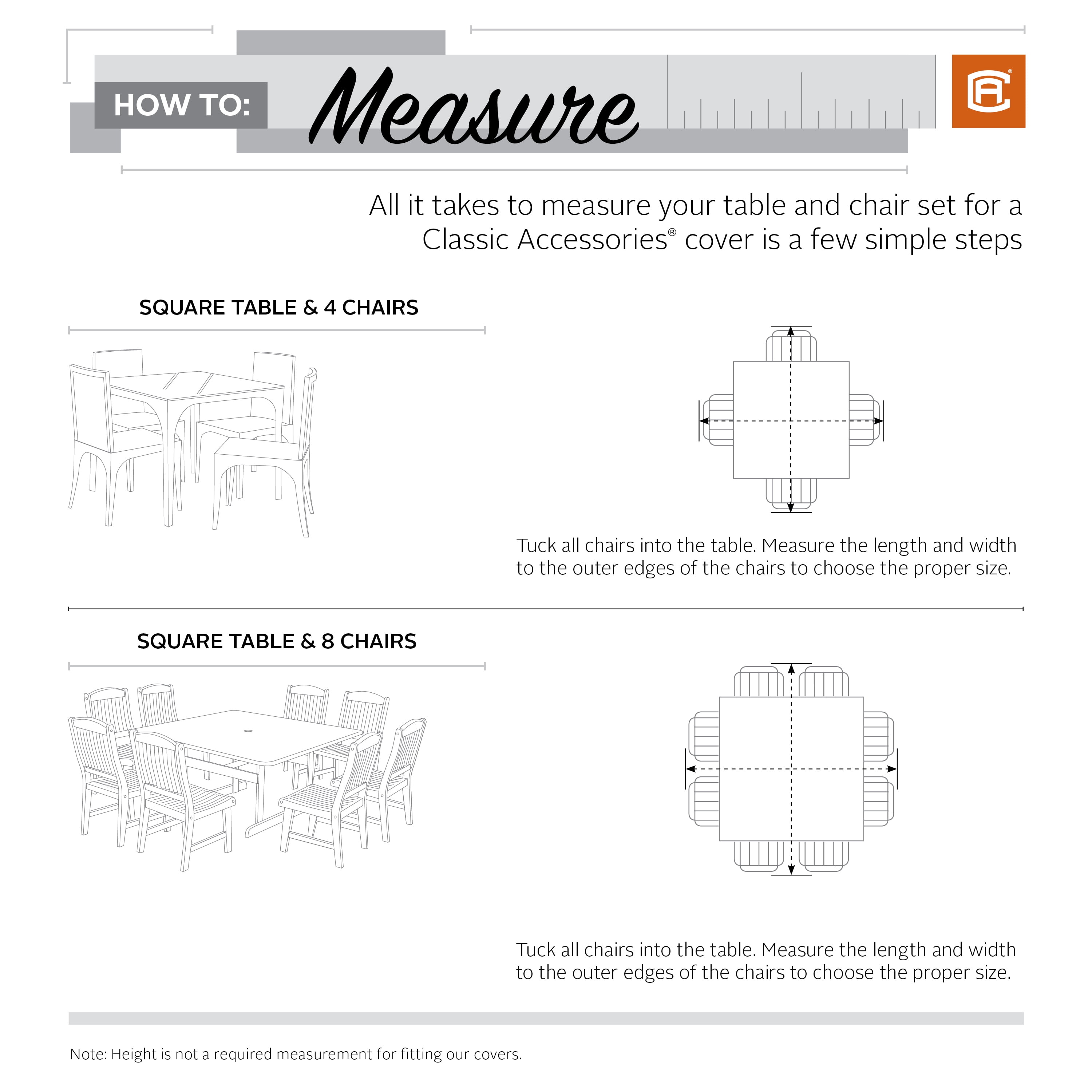 • THE CLASSIC ACCESSORIES DIFFERENCE: CA Veranda covers have interior bound seams for strength, high-density stitching for durability, padded handles for comfort, matching webbing for a great look and California Prop 65 compliance for health and safety • PREMIUM PATIO COVER: Guaranteed to fit square bar tables and chairs 86″L x 86″D x 34″H • PATIO COVER with WARRANTY: Three-year limited warranty and California Prop 65 compliance for health and safety • WEATHERPROOF AND WATER-RESISTANT: Gardelle™ fabric features an elegant water-repellent fabric top with a protective water resistant 6P-Free laminated undercoating and a protective dark splash guard skirt • CUSTOM FIT OUTDOOR PATIO COVER: Click-Close straps snap over wheels/legs to secure cover on windy days while an elastic hem cord with toggle allows adjustment for a tight and custom-like fit • DURABLE COVER WITH ADVANCED FEATURES: Air vents to reduce condensation and wind lofting, padded handles for easy fitting and removal, protects table from harmful UV rays • Not designed to entirely cover the wheels or legs