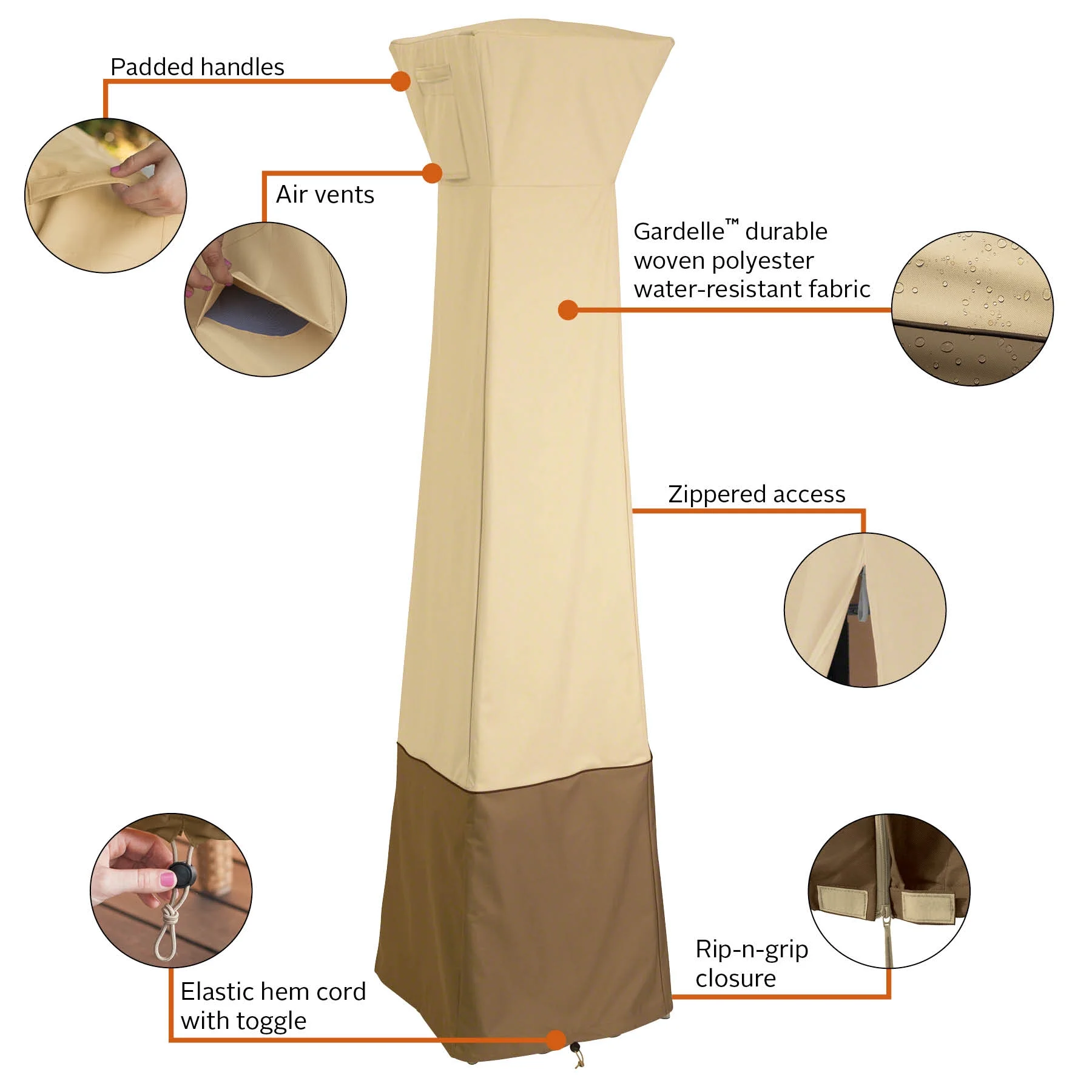 Two-year limited warranty Gardelle Fabric System features an elegant fabric top with a water-resistant laminated backing and a protective dark splash guard skirt Padded handles for easy fitting and removal Air vents help to reduce inside condensation and wind lofting Full length zipper and rip-n-grip fabric tabs Elastic hem cord with cord lock for a tight and custom-like fit Not designed to entirely cover the wheels or legs