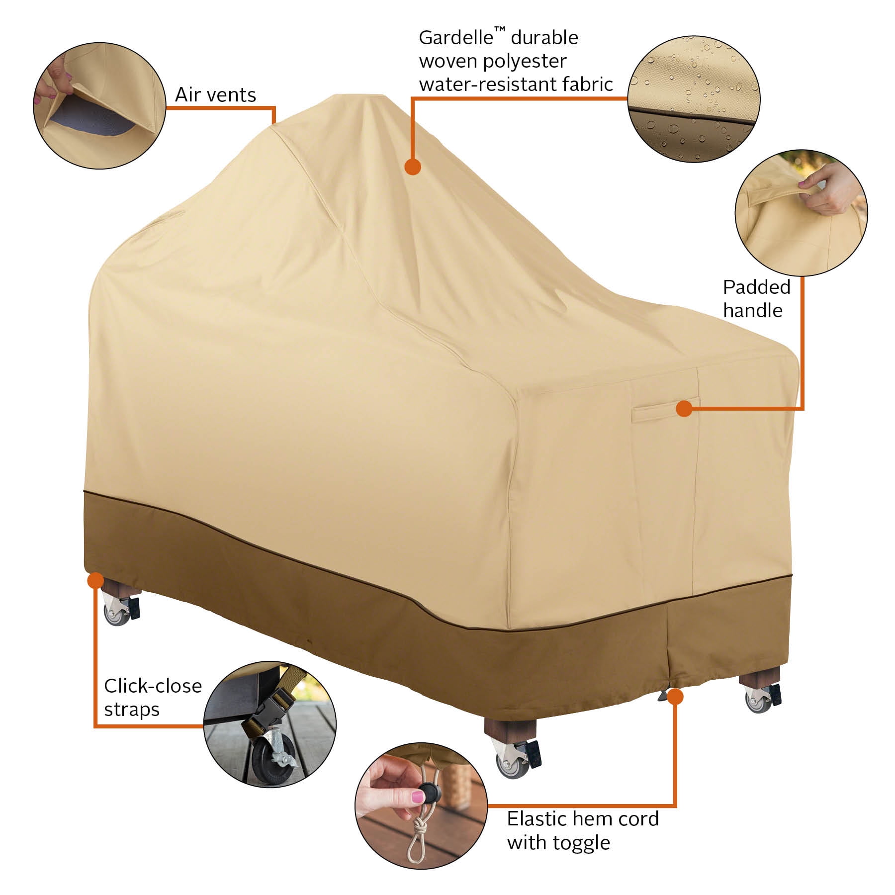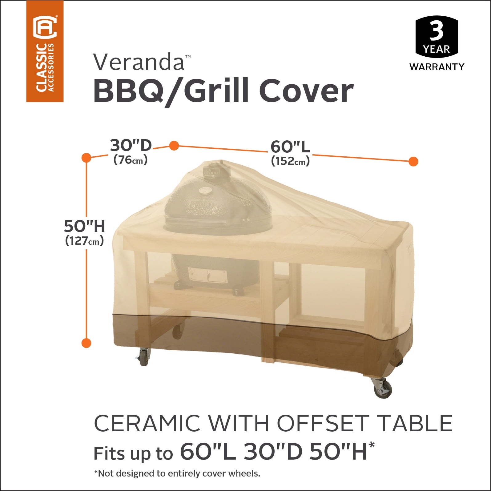 Fits ceramic barbecue grills with offset tables 60″L x 30″D x 50″H Gardelle Fabric System features an elegant fabric top with a protective water repellent and resistant laminated backing and a protective dark splash guard skirt Air vents reduce inside condensation and wind lofting Padded handles for easy fitting and removal Elastic hem cord for a tight and custom fit Click-close straps snap at front to secure cover on the windiest days Three-year limited warranty
