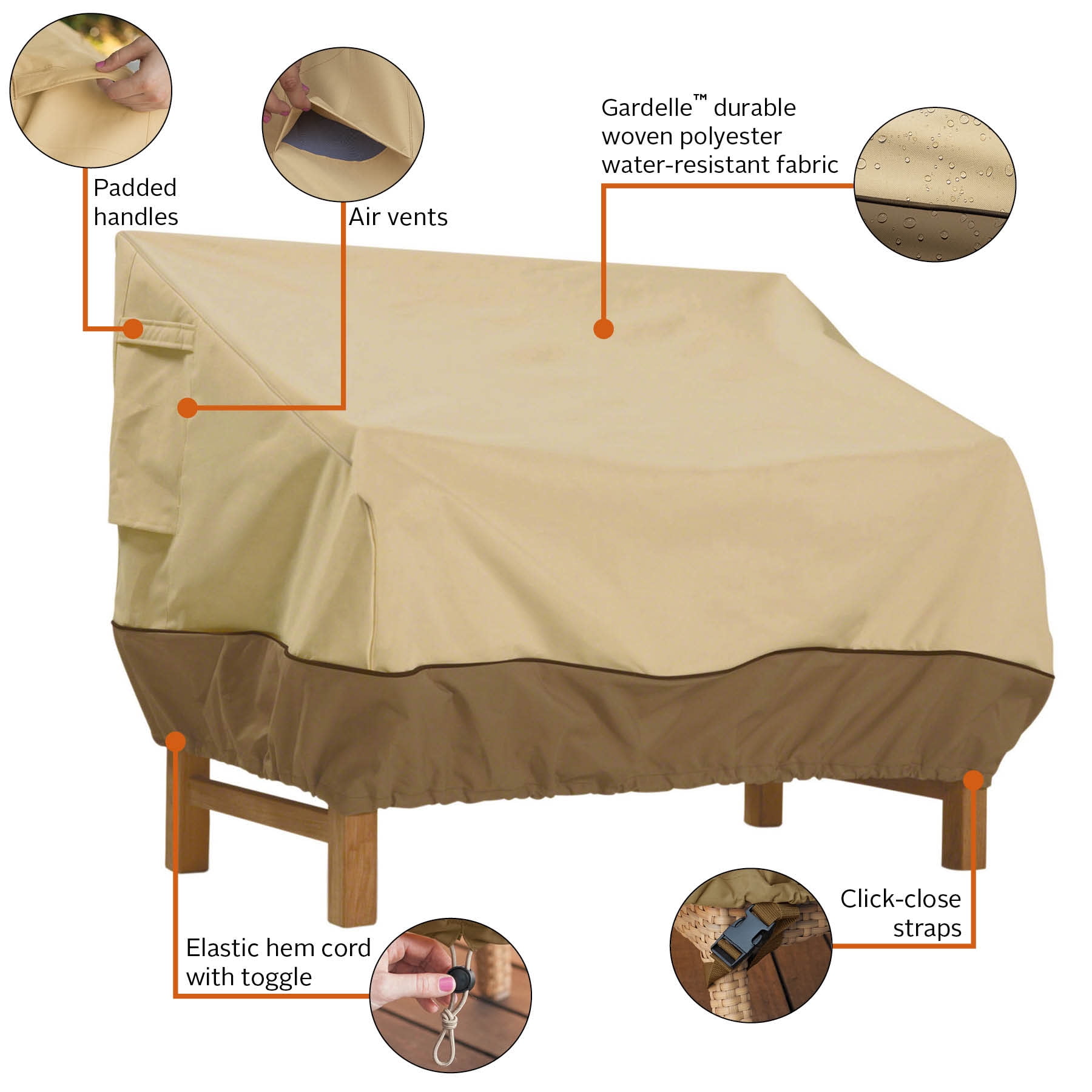 Gardelle™ fabric is both water-resistant and water-repellent for full protection against the elements Air vents help to reduce inside condensation and wind lofting Padded handles for easy fitting and removal Elastic hem cord for a tight and custom fit Click-close straps snap at front to secure cover on the windiest days Outfit your entire outdoor space with matching covers from the same