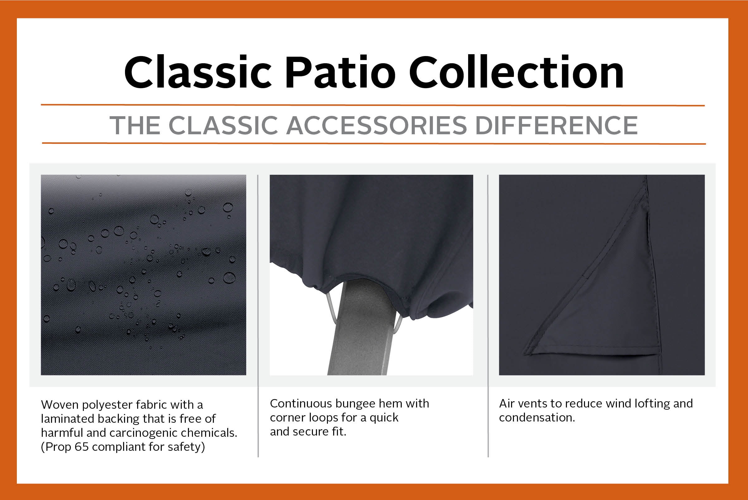 TOUGH PATIO GRILL COVER: Fits barbecue grills 64″L x 28″D x 48″H (Large)* 1-YEAR LIMITED WARRANTY ON COVER: We provide a One-Year Limited Warranty on our Classic Accessories grill covers. Grill tools are not included in the warranty. HEAVY DUTY BBQ COVER: Tough fabric with water-resistant backing protects against rain, snow, sun, and dirt, and won’t crack in the cold DURABLE GRILL COVER FEATURES: Elastic bottom hem fits the cover to your grill, elastic loops fit over legs to keep cover on during breezy conditions, and air vents reduce wind lofting GREAT GIFTING: The grill light and stainless steel brush are the perfect additions to your grilling arsenal and a great gift to give a grill lover *Not designed to entirely cover the wheels or legs Warning: Brush should not be used on a hot surface, check your brush for loose coils before use. Do not attach light to the hood while grill is in use, hot temperatures could damage the light