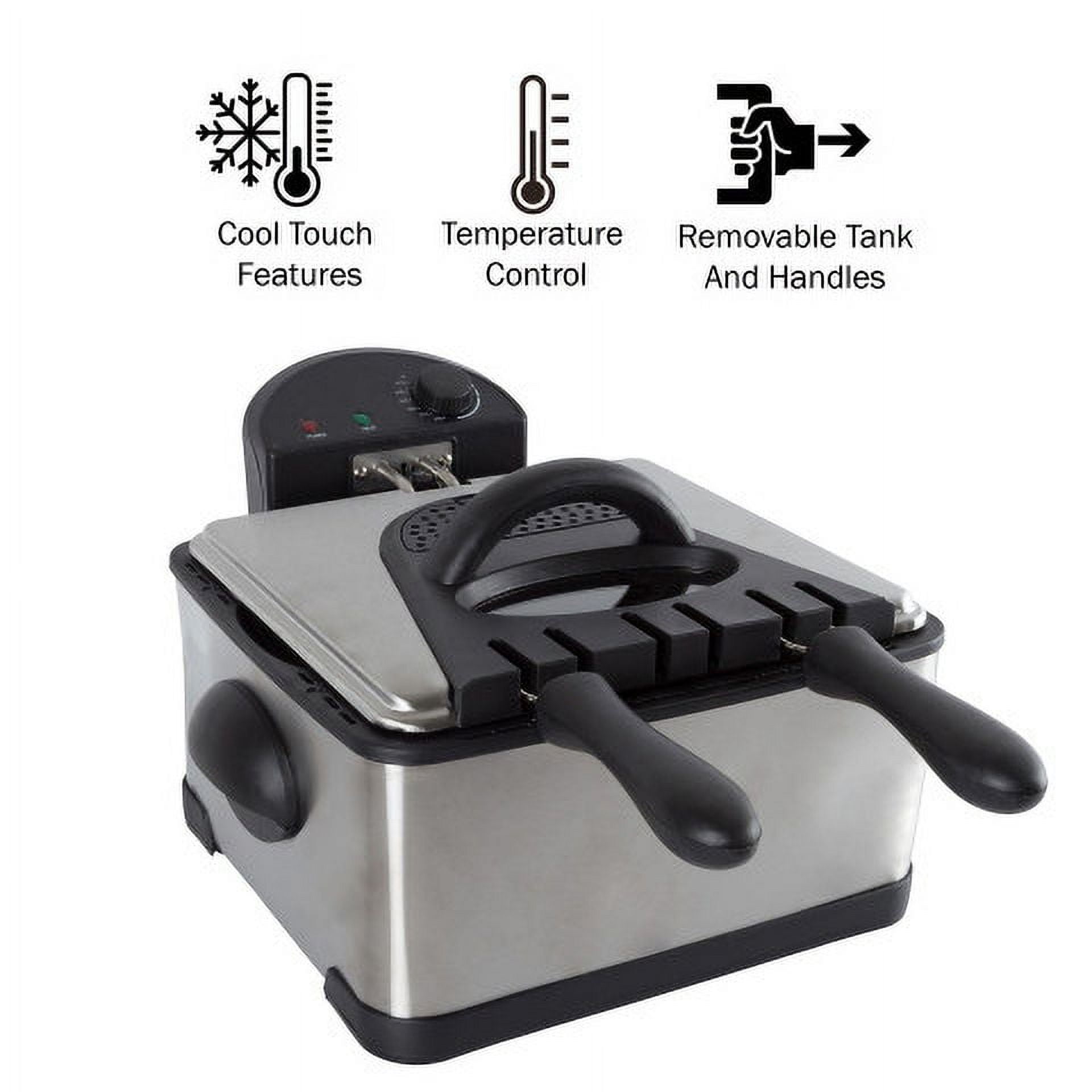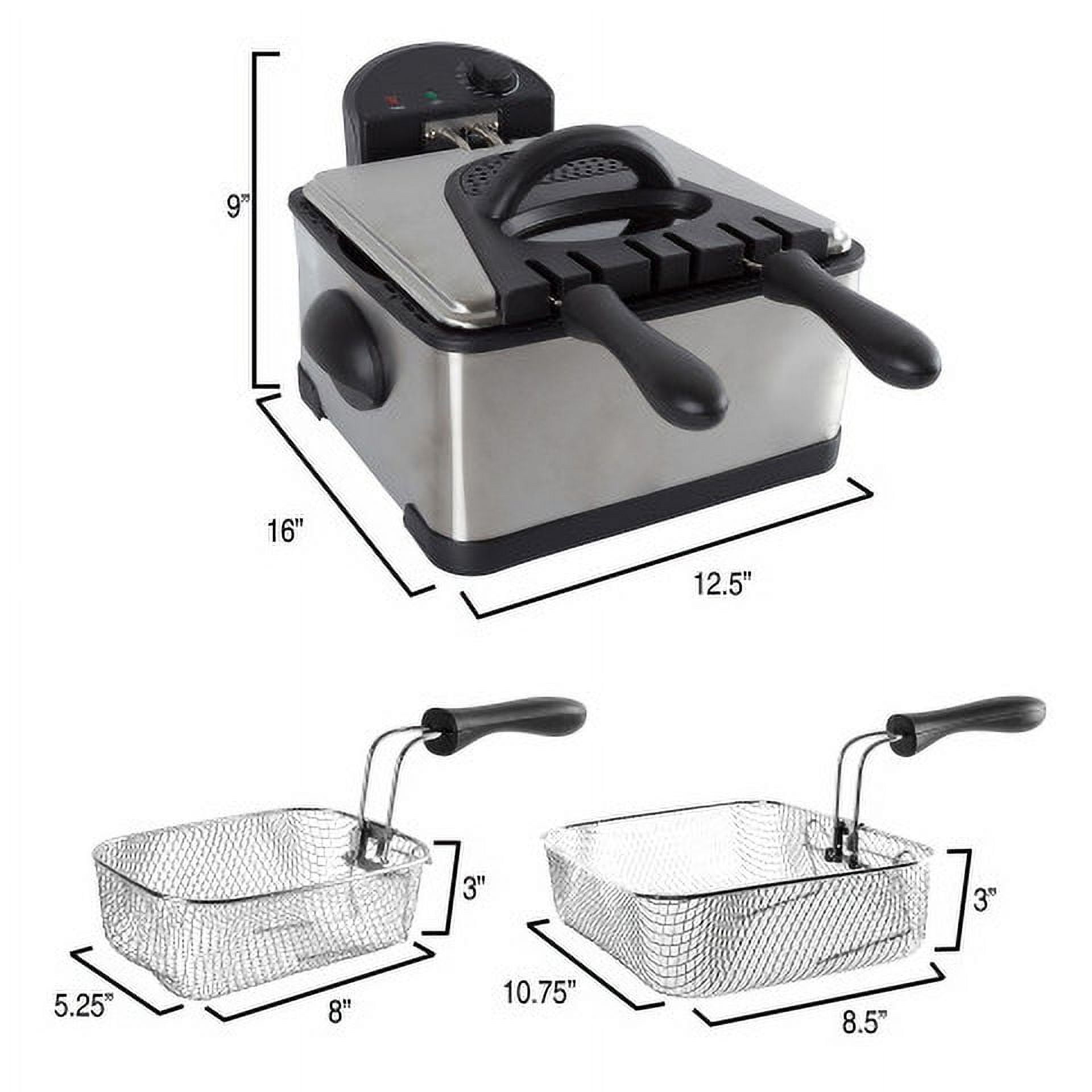 CONVENIENT ELECTRIC DEEP FRYER – The electric deep fryer with 3 baskets has a 4-liter capacity with a see-through lid and double odor filter technology for hassle-free cooking. 3 FRYER BASKETS – Quickly cook two yummy foods at once with the dual deep fryer baskets of this oil fryer/deep fryer or use the large deep fry basket to create one hearty meal. COOL TOUCH FEATURES – This new small deep fryer has user-friendly touch features, so you can use it as a chicken fryer, fish fryer, french fries fryer, or even to prepare fried shrimp. EASY TO USE – This electric deep fryer includes a frying guide and 3 deep fry baskets, letting you get started on your favorite recipes while easily monitoring temperatures. MATERIALS – Steel. DIMENSIONS – (L) 12.5″ x (W) 16″ x (H) 9″; Large Basket: (L) 8.5″ x (W) 10.75″ x (H) 3″; Small Basket: (L) 8″ x (W) 5.25″ x (H) 3″; Cord Length: 33″. COLOR – Silver.
