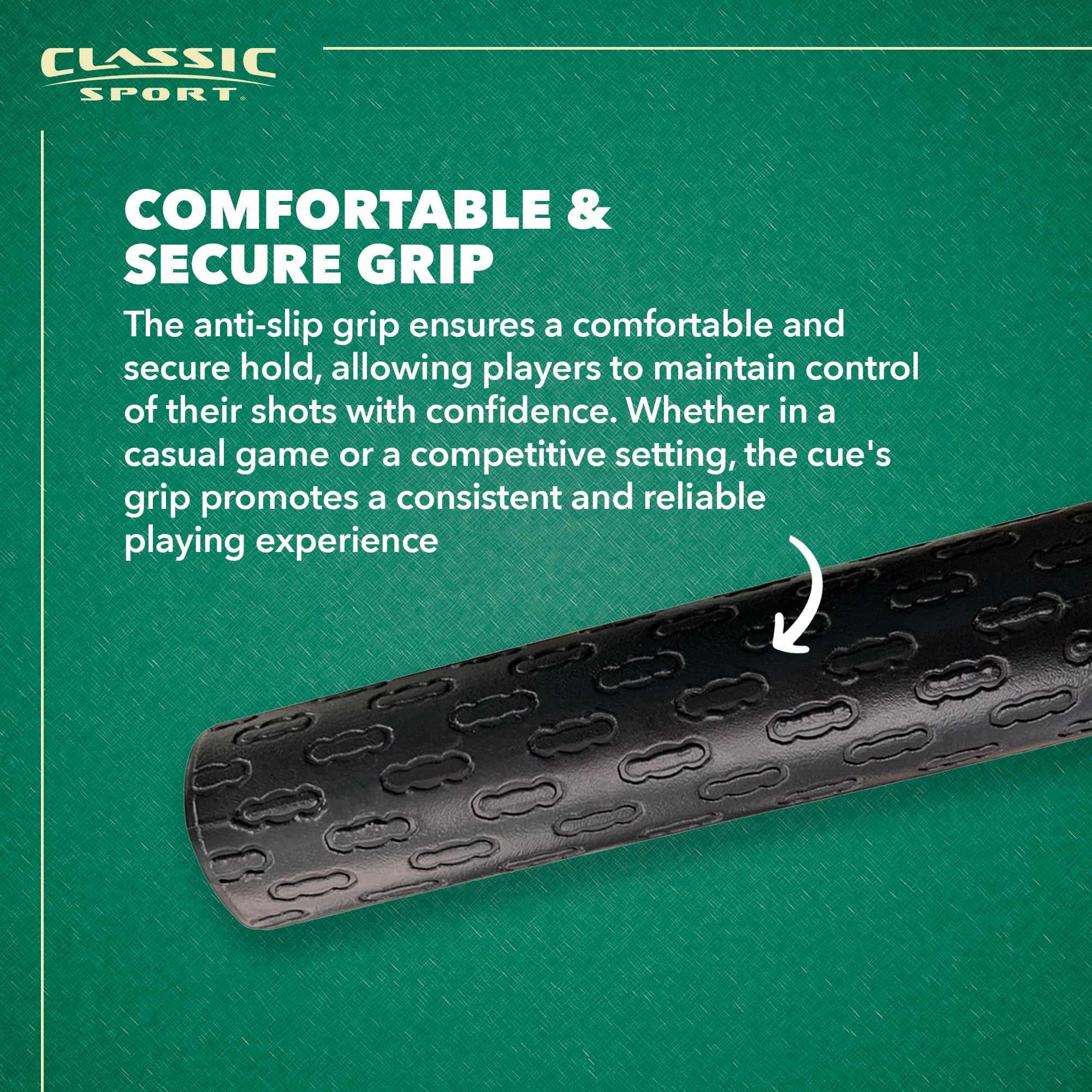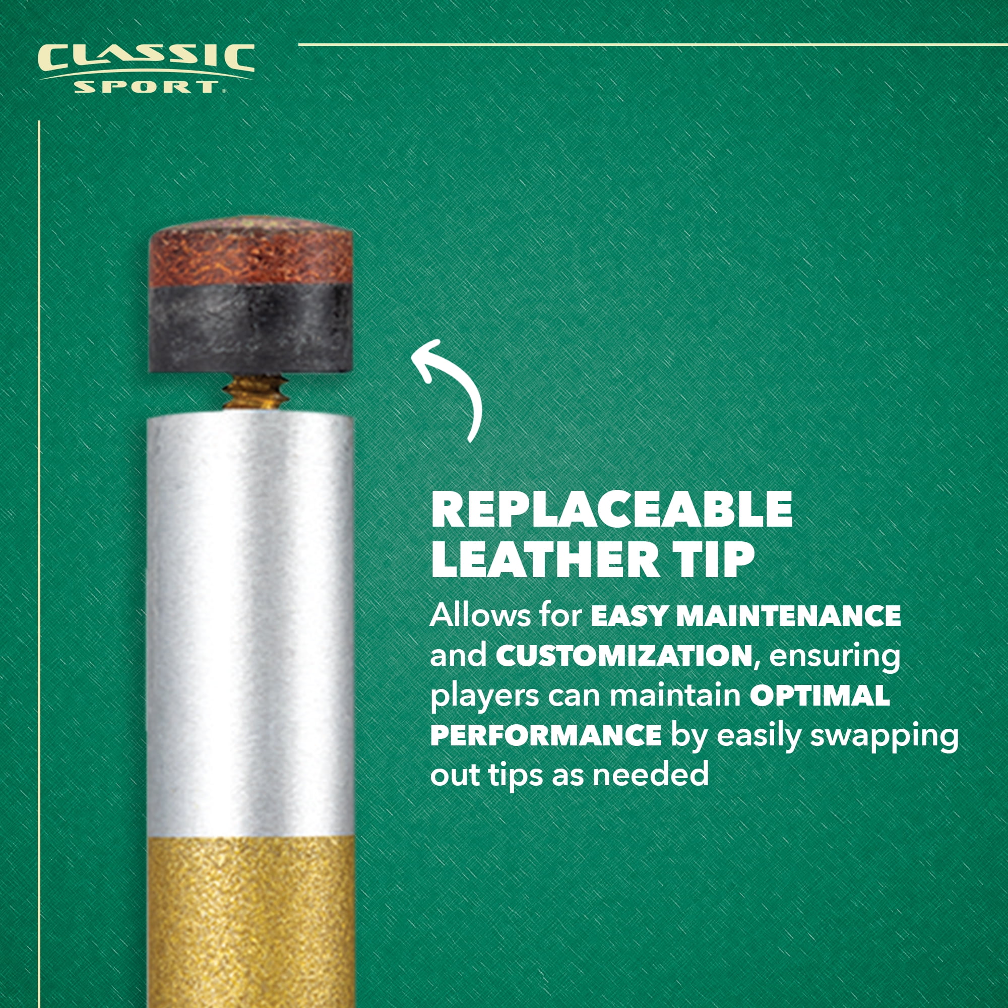 Precision Striking with Tungsten Reinforcement: The Tungsten reinforcement in the cue enhances precision striking, providing players with a reliable and consistent feel during gameplay, making each shot count on the billiards table. Stainless Steel Quick-Lock Joint: No more constantly having to screw the stick back together during play – the stainless steel quick-lock joint locks firmly and quickly into place while still offering the firm and powerful striking of a one-piece stick. Portable 2-Piece Design: This cue stick is designed for easy transportation, breaking down into two halves without compromising on performance, ensuring you can bring your best game anywhere you go. Micro-Fiber Comfort Grip: Tightly gripping your cue stick can cause you to twist your cue or push your shots offline. The premium micro-fiber grip allows for a lighter, more natural grip for straighter, truer shots. Replaceable Hardened Leather Tip: Featuring a replaceable screw-on leather tip, this cue allows for easy maintenance and customization – the hard leather tip allows players to execute spins and angles with confidence, making it an ideal choice for intermediate to advanced players.
