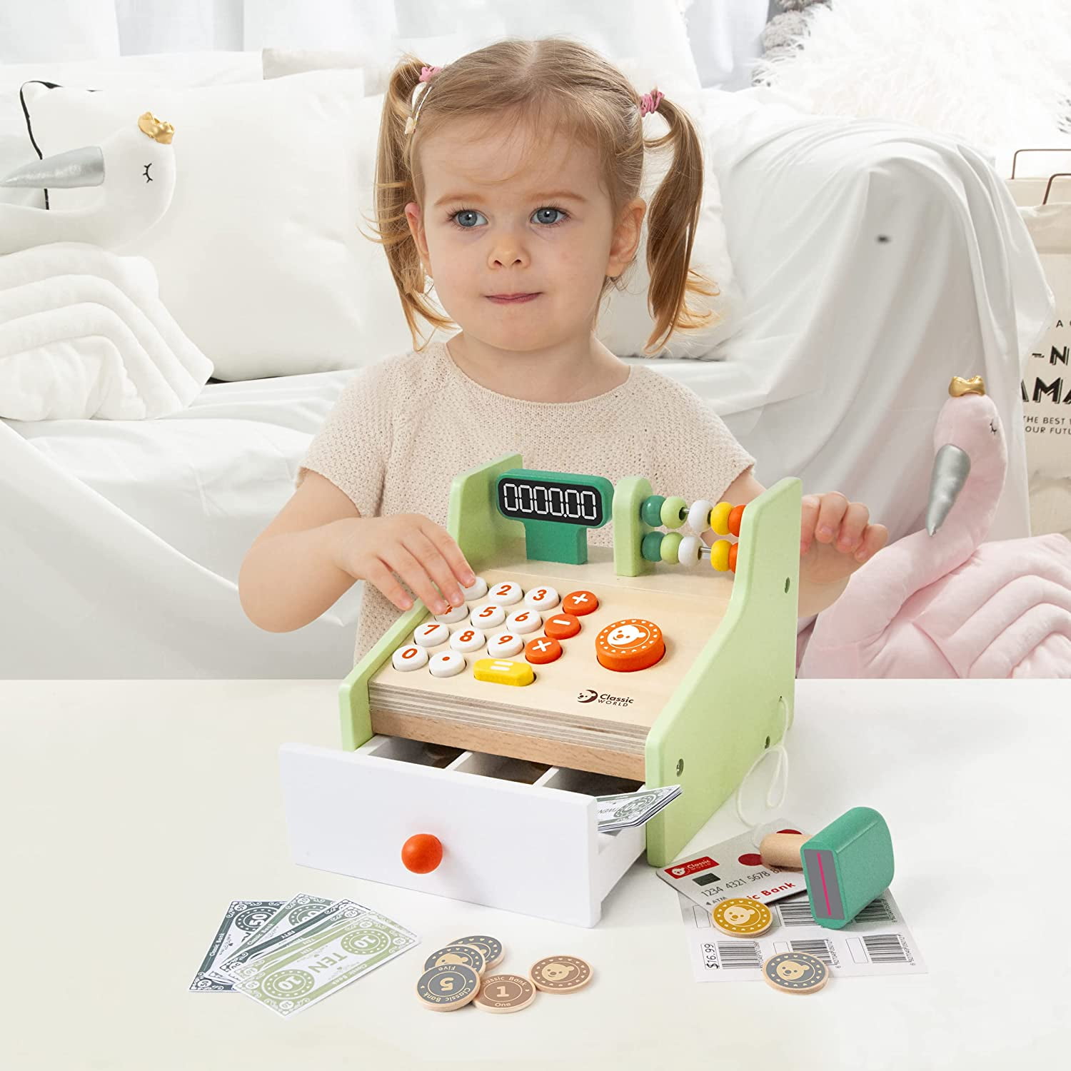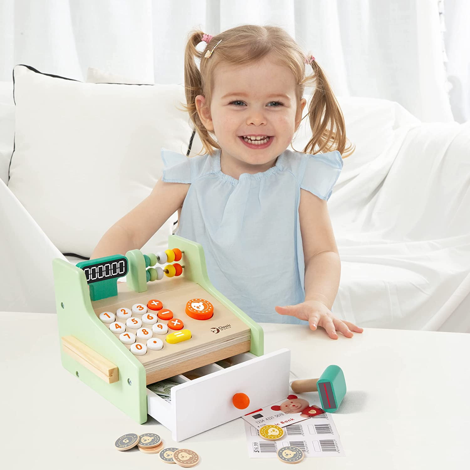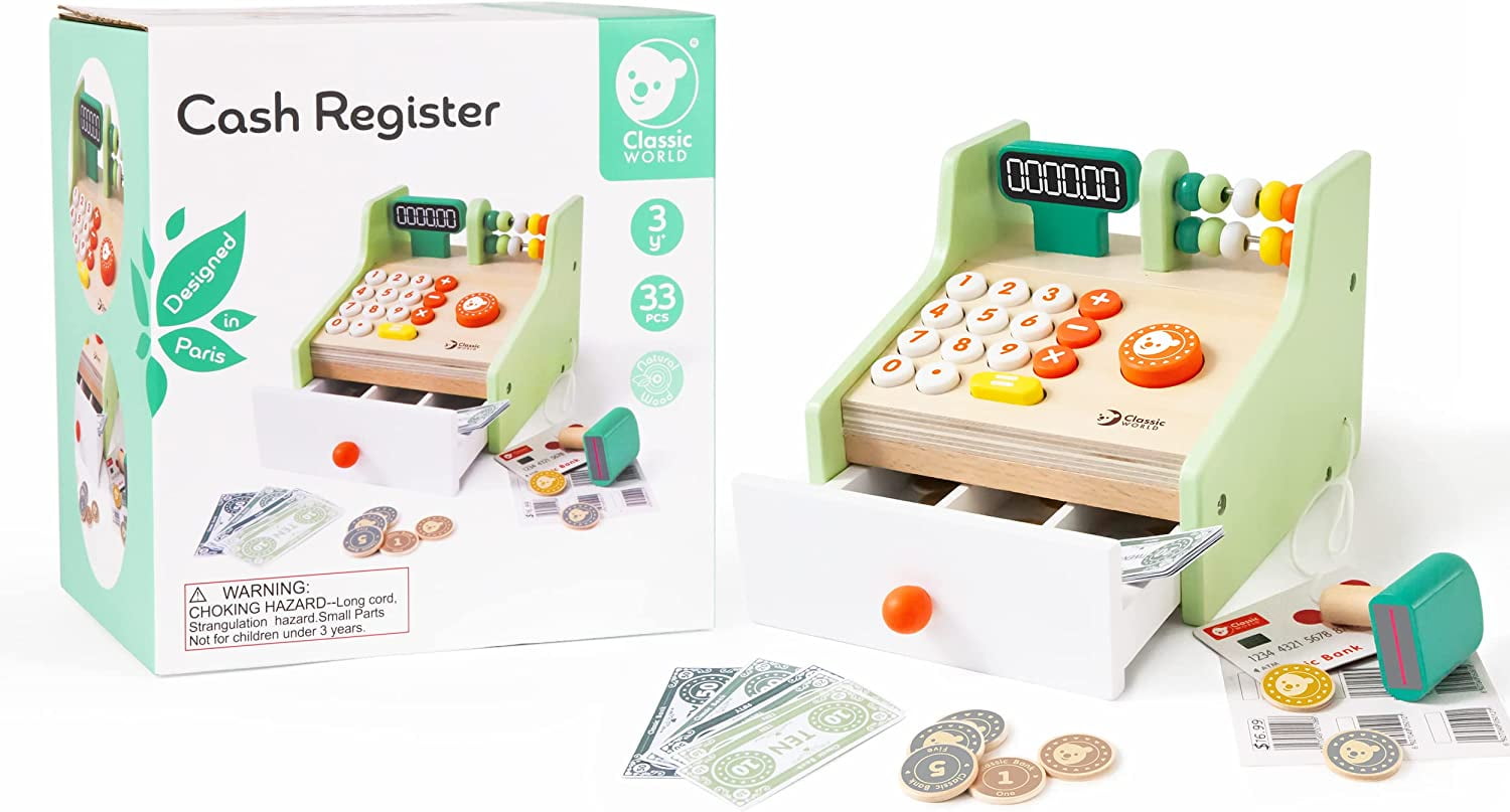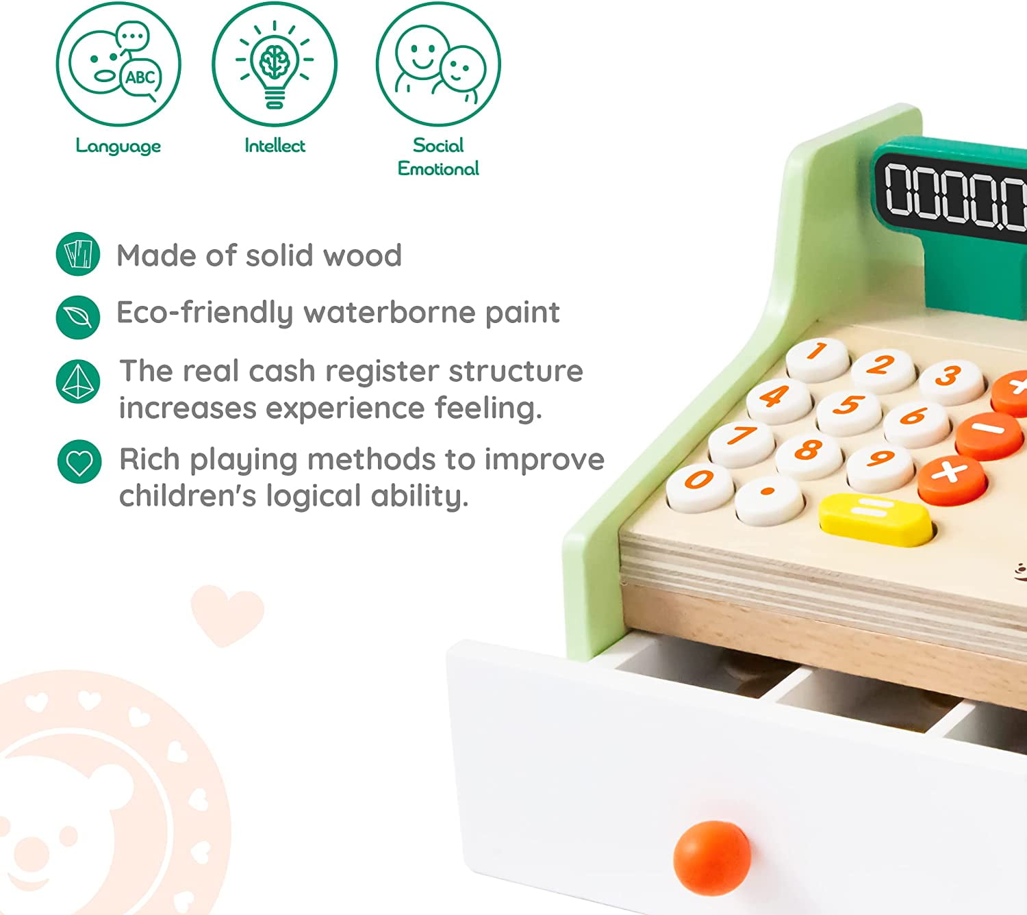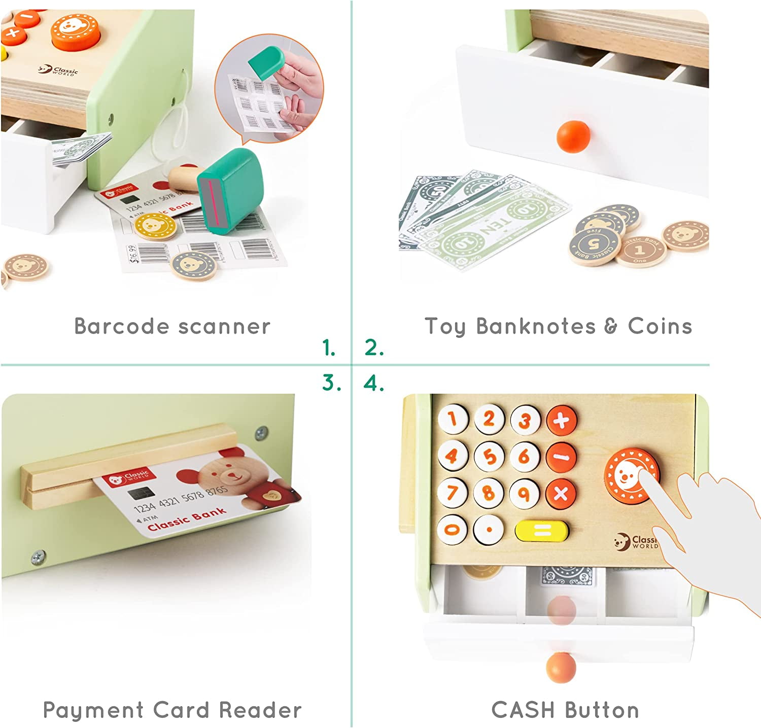 Cash or card? Count the total amount, then give back the right change. This cash register includes paper money, bank card and coins. It will be a lot of fun while developing the social and communication skills.