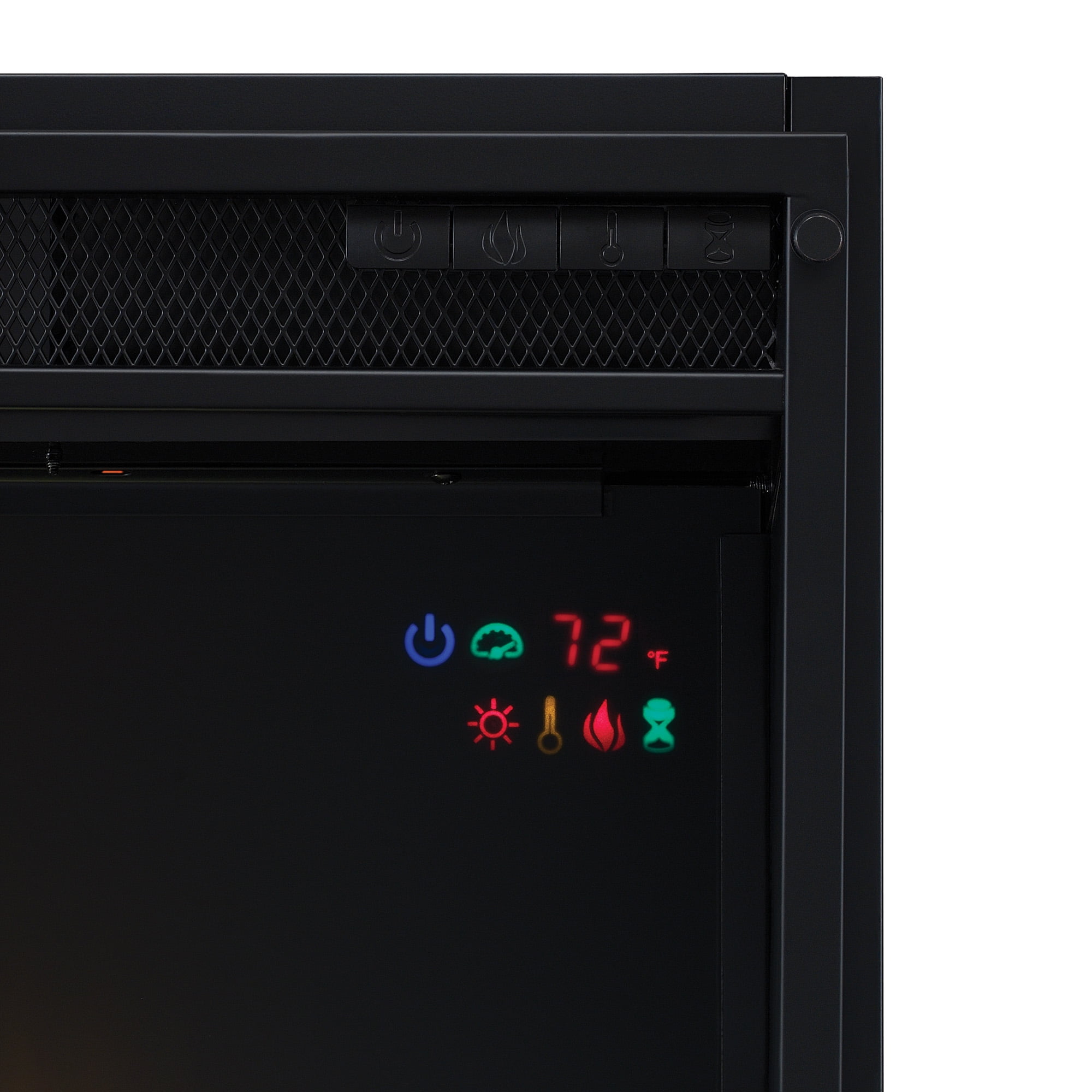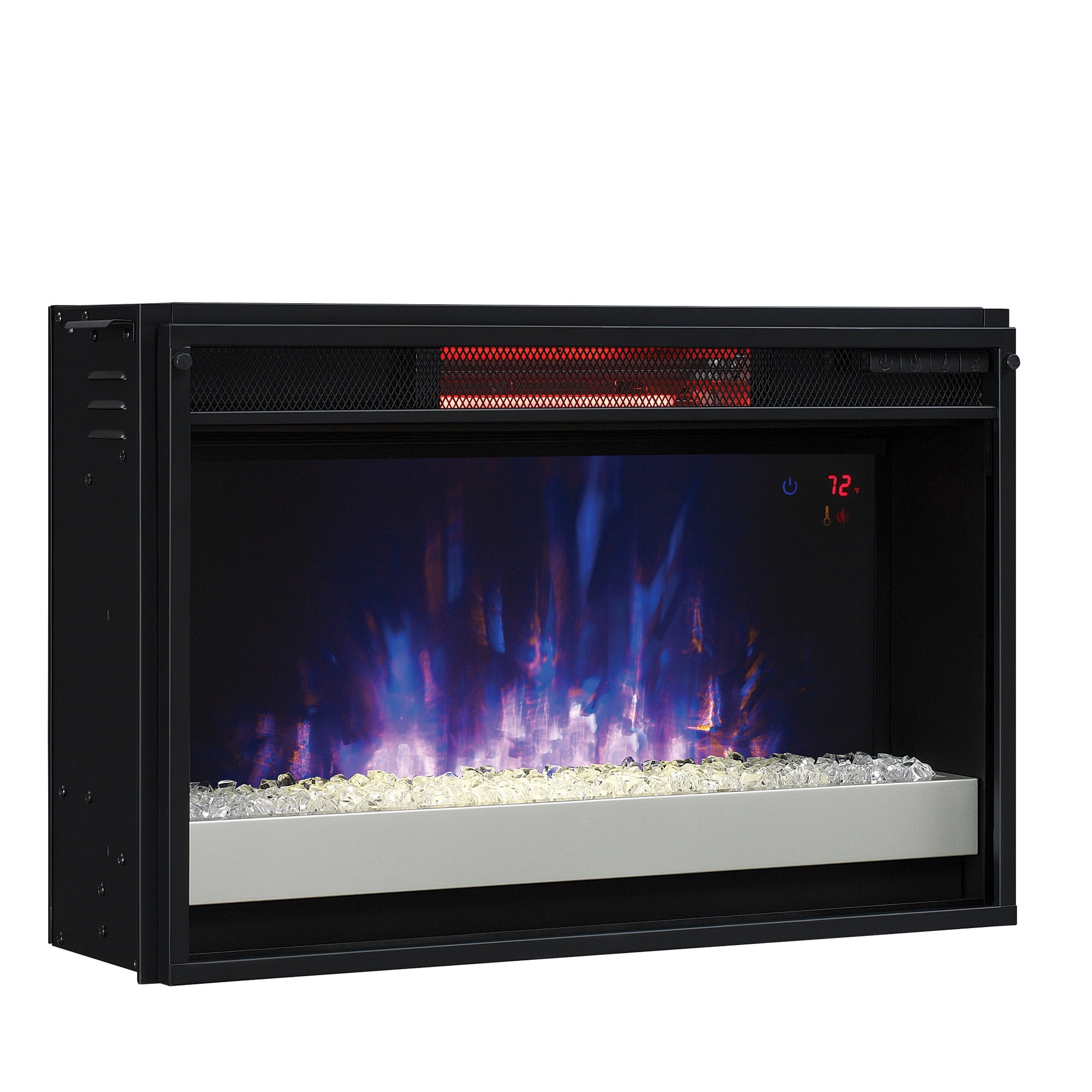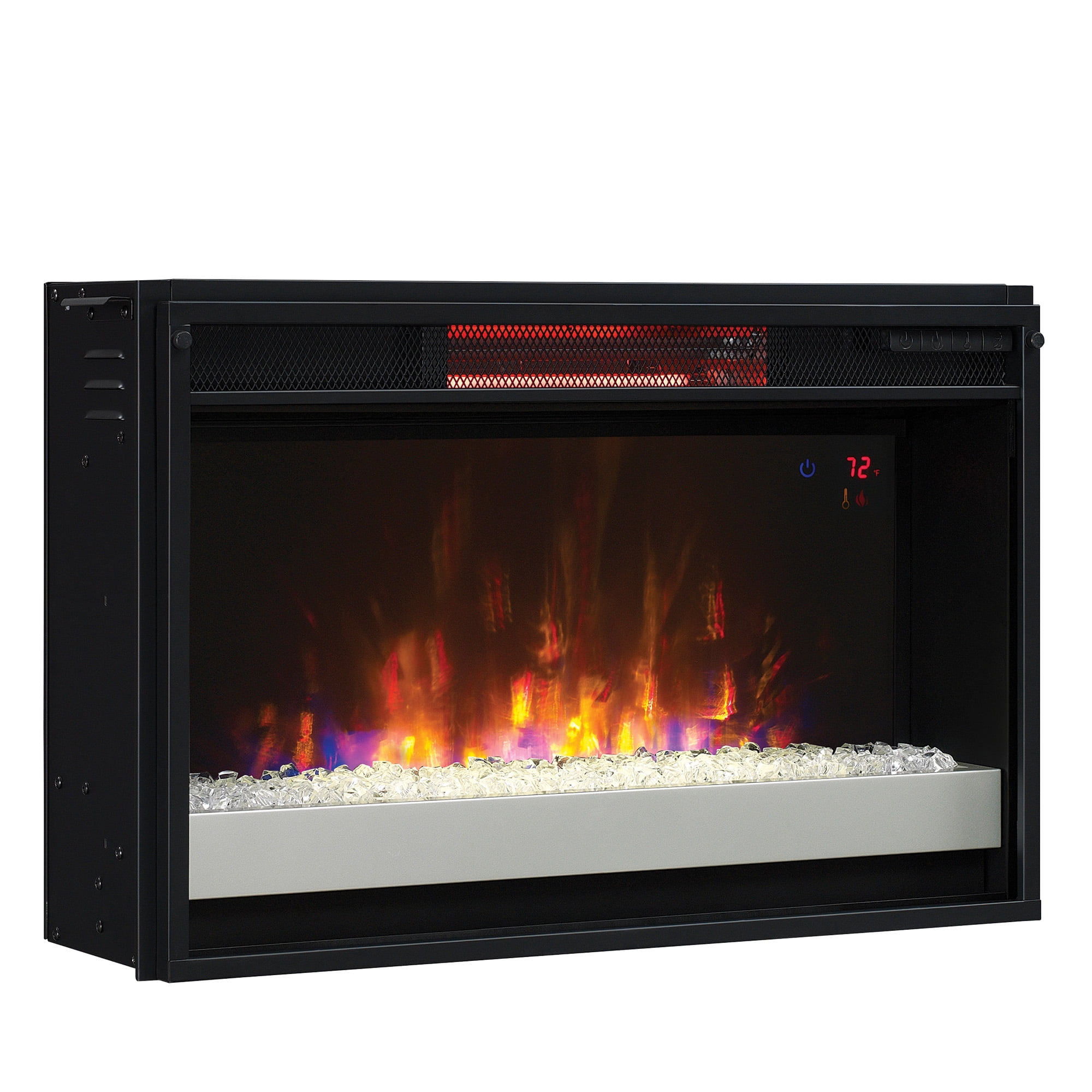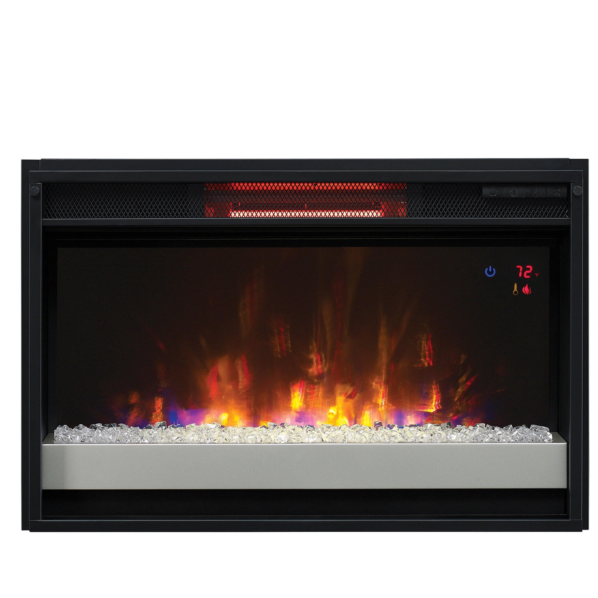 ClassicFlame 26II310GRG-201 26″ Infrared Quartz Electric Fireplace Insert with Safer Plug, 26.91 lbs 5,200 BTU heater provides Patent-pending Safer Plug fire prevention technology provides added safety by monitoring The flame effect can be operated with or without heat, providing the ambiance of a gentle rolling fire all year long The perfect ambiance for any style The adjustable digital thermostat allows you to decide the temperature of your room; Simple, hassle-free installation, requires no venting or gas lines. Includes an owner`s manual and easy-to-follow instructions for installation. The Tempered glass-front display includes a contemporary tray with clear crystal rocks Long-lasting, energy-saving LED technology and infrared quartz elements for heating Safe for use around children and pets An eco-friendly, energy efficient fireplace does not emit any emissions or other hazardous byproducts Electronic timer function: automatic timed shut-off from 30 minutes up to 9 hours Remote control with 2 AAA batteries included providing added convenience CSA safety certified