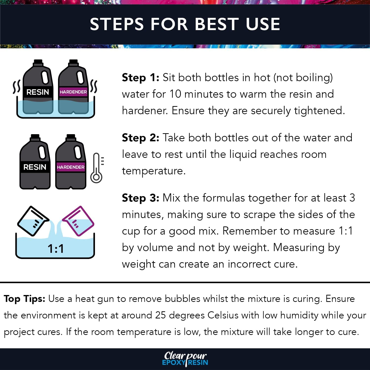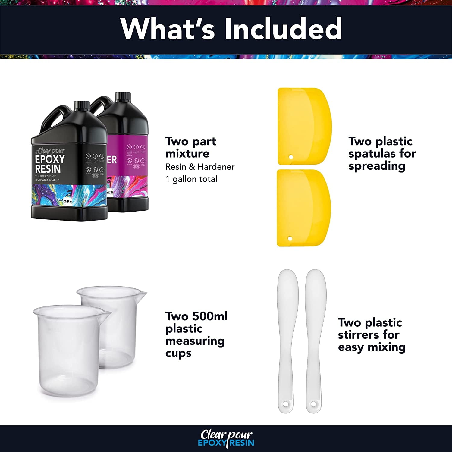 Clear Pour Epoxy Resin Kit Clear Epoxy Adhesive Epoxy Adhesive,1 Gallon, 2 Pieces Premium Clear Epoxy Resin This 1-gallon epoxy resin set includes 64 oz resin, 64 oz hardener, 2 plastic stirrers, 2 spatulas for easy, even spreading, 2 measuring cups, and 1 pair of gloves Amazing Texture This resin epoxy kit is easy to mix and creates fewer bubbles to achieve the perfect texture for all your tabletops, countertops, and bar projects; discover truly smooth casting resin Strong Formula Our epoxy resin is non-yellowing and dries to be crystal clear with an intense shine Its premium quality makes it impact-resistant and designed to last Perfect for Any Project This tabletop epoxy will help you explore your creative side and make your projects a reality Give it as a gift or use it yourself; your imagination is the limit Tips for Best Results The product should be at 77°F (25°C) If the resin or hardener is thick or cloudy, this usually means it is cold You can warm it up by placing the bottles in warm water for 10-20 minutes Stir the resin and hardener together for 3-4 minutes, making sure to scrape the sides thoroughly Do not let the mix overheat as this will limit working time Use in a well-ventilated space with gloves